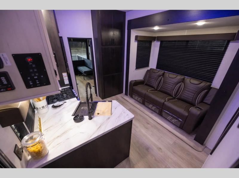 This dual entry toy hauler is perfect for weekends at the lake. The separate garage features two flip-up sofas plus a free-standing table and a quick set rear bed system for more sleeping space. There is also a TV mount here if you want to add a television and gear storage to keep your items organized. A sofa slide out in the main living area will provide comfortable seating space, and the full kitchen will let you create yummy meals. You'll love the dual entry bath that will create a front master bedroom, complete with a king bed and dual wardrobes for your clothes!