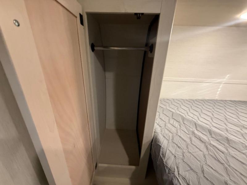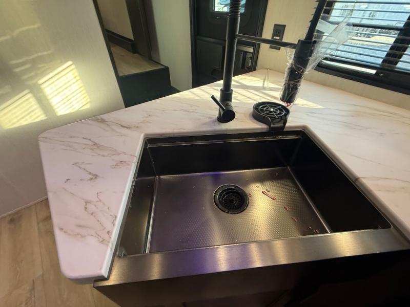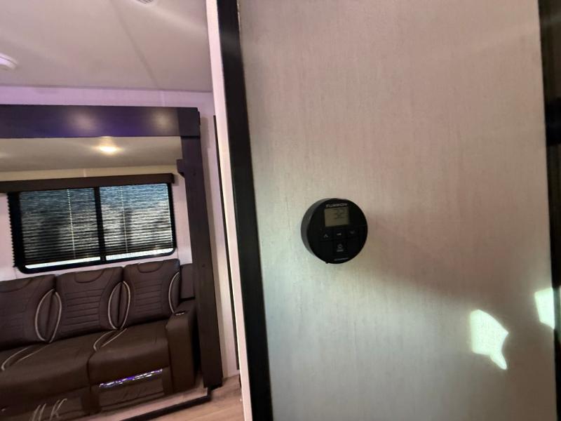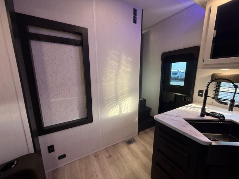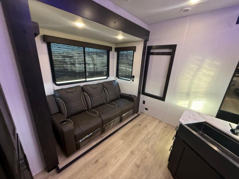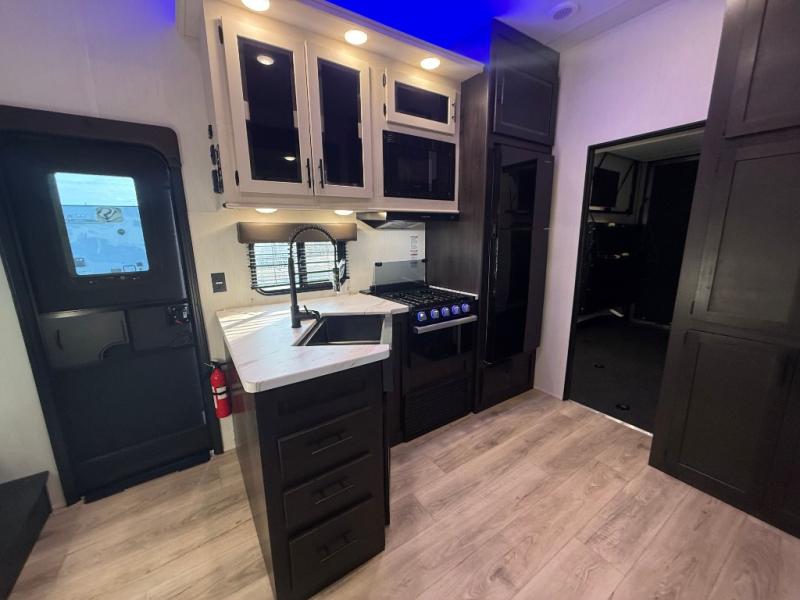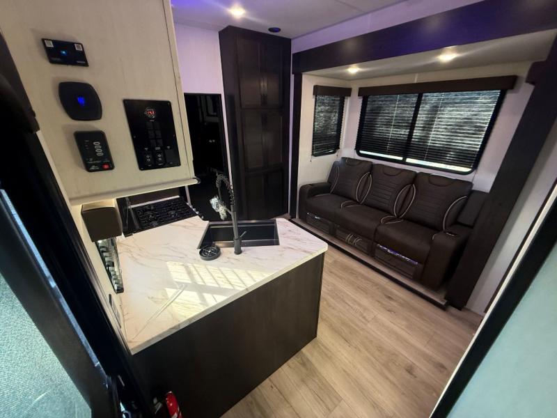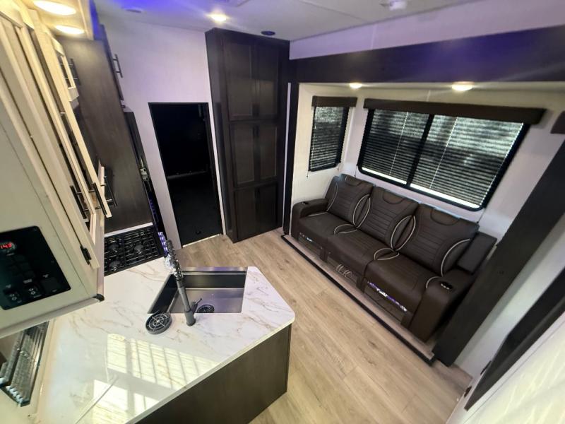 This dual entry toy hauler is perfect for weekends at the lake. The separate garage features two flip-up sofas plus a free-standing table and a quick set rear bed system for more sleeping space. There is also a TV mount here if you want to add a television and gear storage to keep your items organized. A sofa slide out in the main living area will provide comfortable seating space, and the full kitchen will let you create yummy meals. You'll love the dual entry bath that will create a front master bedroom, complete with a king bed and dual wardrobes for your clothes!