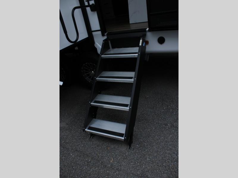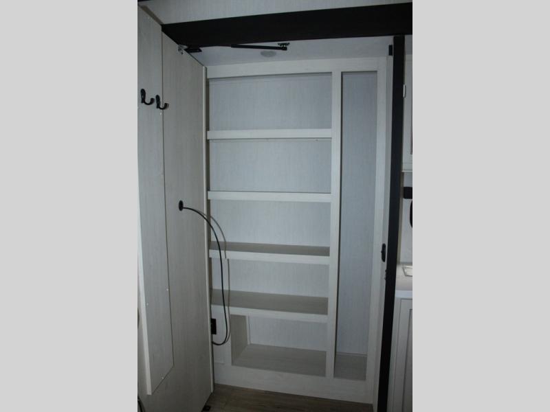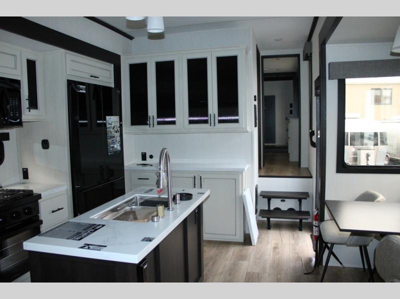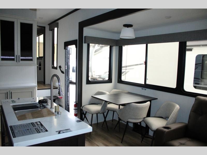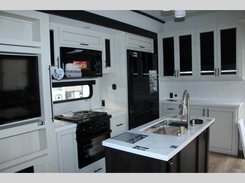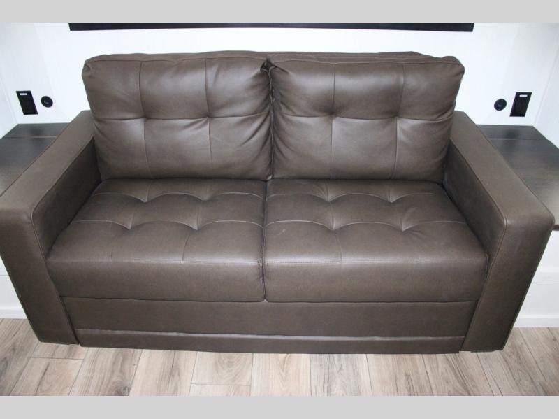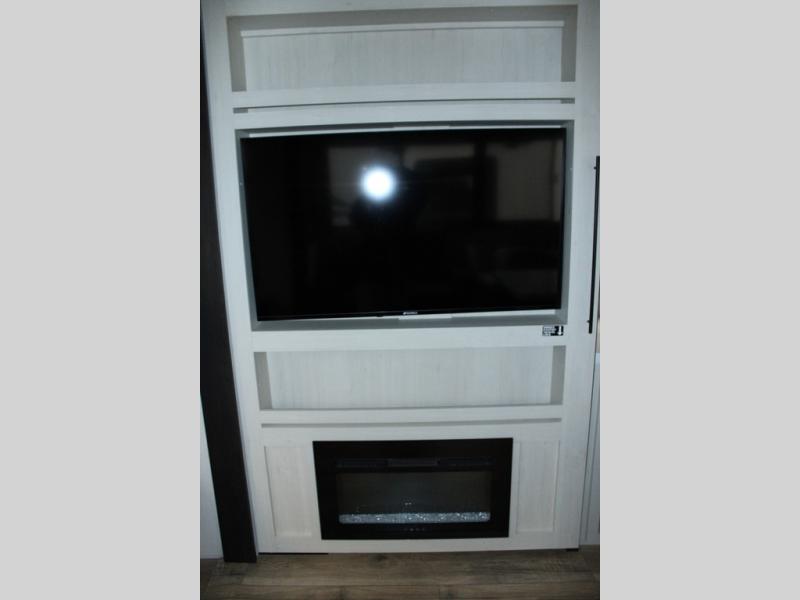 You will feel right at home in this fifth wheel! The rear living area includes a tri-fold sofa, a TV with a fireplace below, and theater seating for two making this space a second bedroom at night for guests. In the morning, you can prepare breakfast on the kitchen island and cooktop, then dine together at the versatile dinette/desk. There is plenty of storage space here, including a hidden pantry, a hutch, and overhead cabinets. The full bath will allow you to stay clean throughout your trip, and you'll feel right at home in the front private bedroom with a king bed. This model also includes an outside refrigerator for snacks, plus pass-thru storage for all your gear!