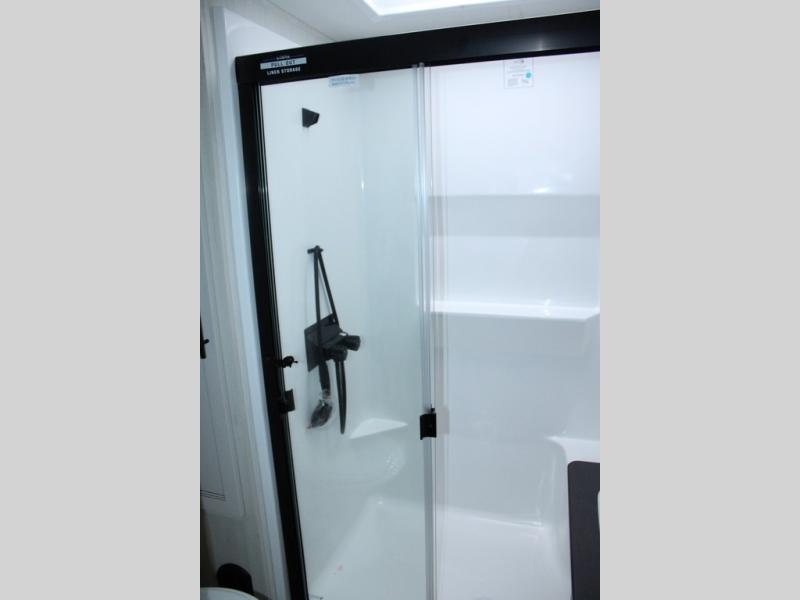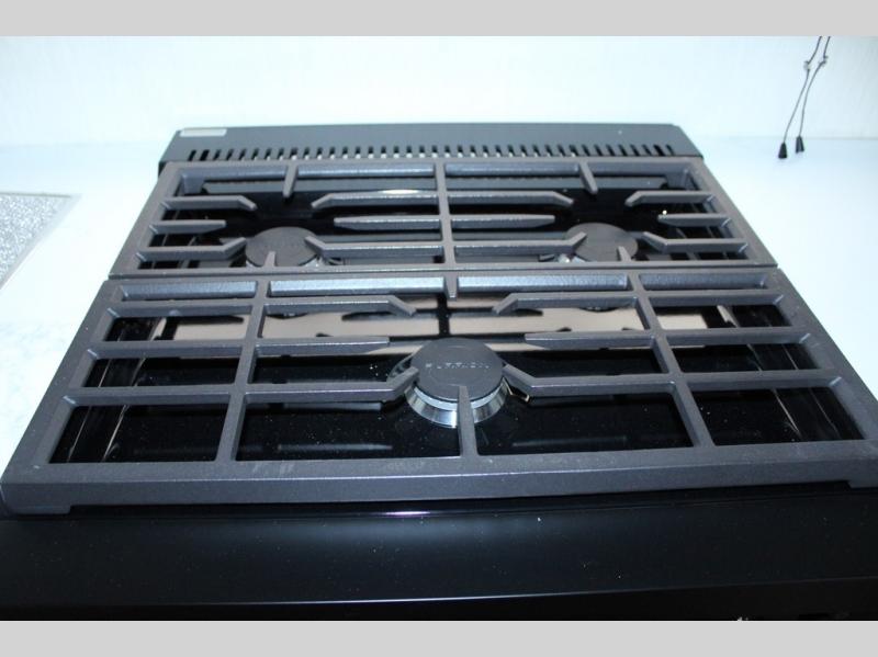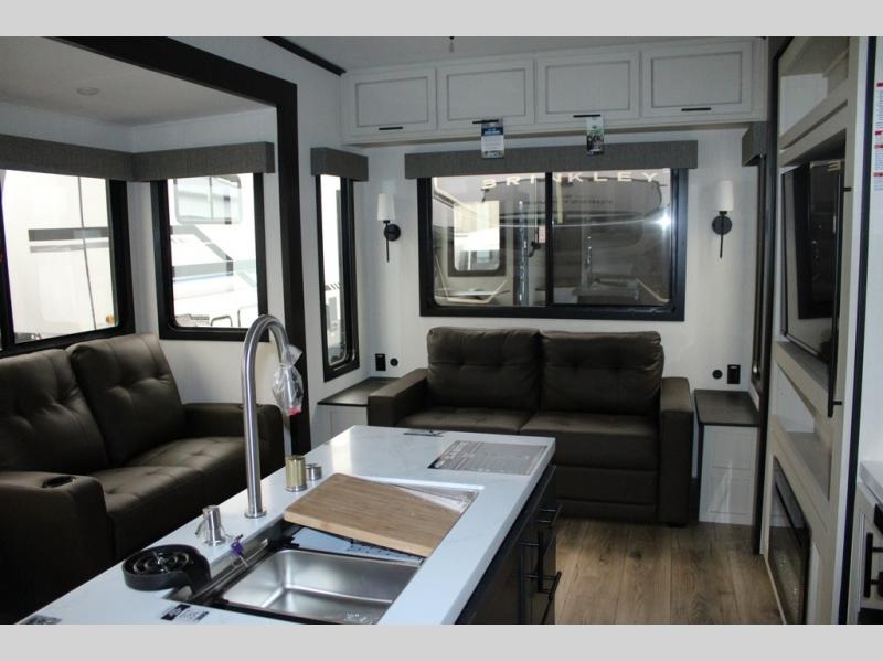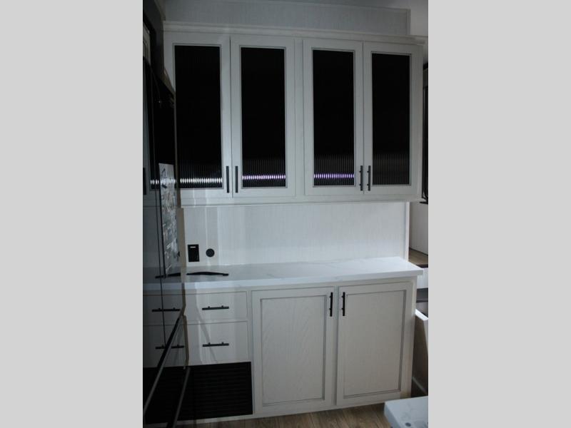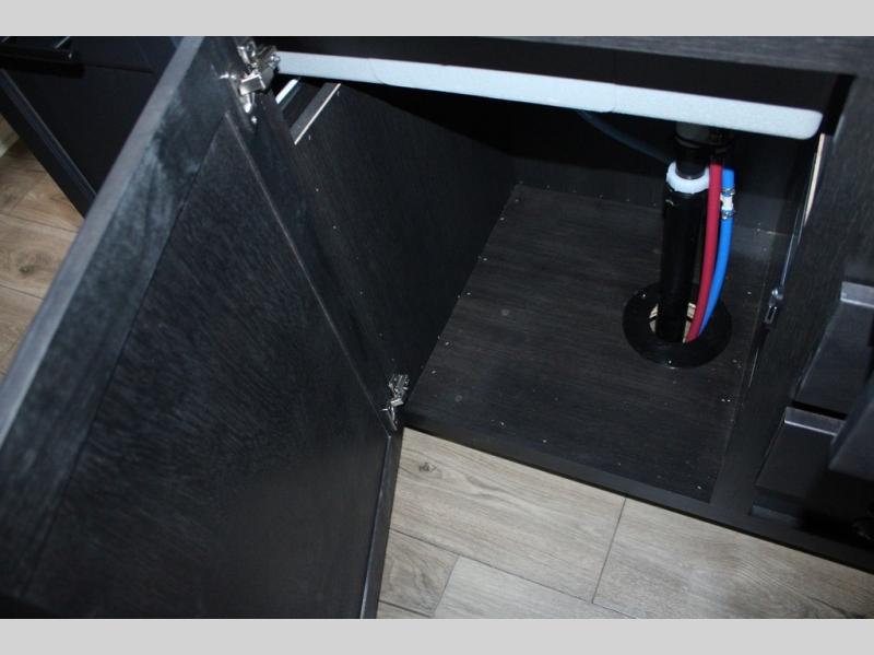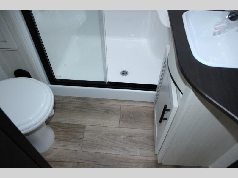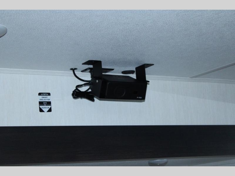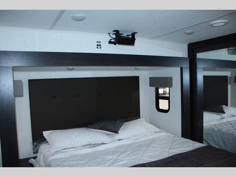 You will feel right at home in this fifth wheel! The rear living area includes a tri-fold sofa, a TV with a fireplace below, and theater seating for two making this space a second bedroom at night for guests. In the morning, you can prepare breakfast on the kitchen island and cooktop, then dine together at the versatile dinette/desk. There is plenty of storage space here, including a hidden pantry, a hutch, and overhead cabinets. The full bath will allow you to stay clean throughout your trip, and you'll feel right at home in the front private bedroom with a king bed. This model also includes an outside refrigerator for snacks, plus pass-thru storage for all your gear!