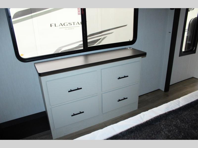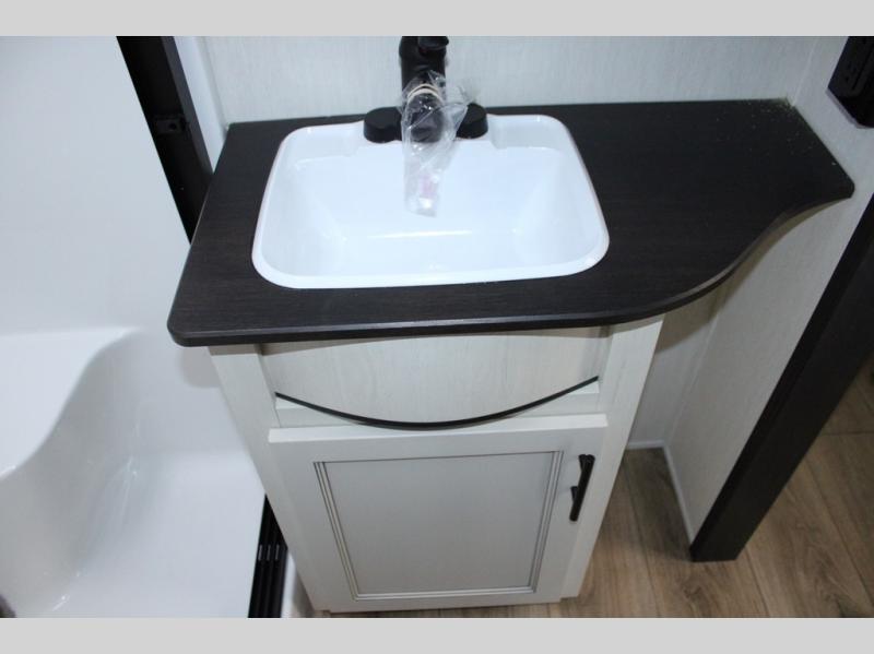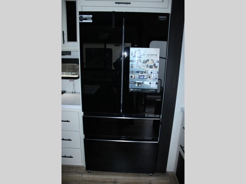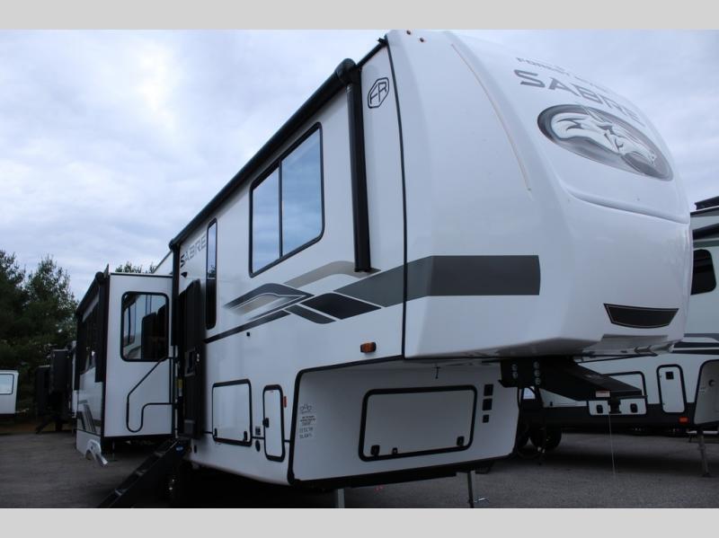 You will experience luxurious camping trips at an affordable price with any one of these Forest River Cherokee Sabre fifth wheels! These models are durable and ready to travel anytime of the year thanks to features like the high-gloss gel-coat front cap with LED lighting, the PVC roof membrane, and the forced air underbelly with enclosed gate valves. The electric auto-leveling system makes setting up easy and safe, and the adjustable power awning with LED lighting will create an inviting outdoor living space. Each model includes a universal docking station which includes a black tank flush and an outside shower, and adjustable stable steps for you to enter and exit the unit safely. Inside, you will love the design of the ambient accent lighting in the living area, the real wood lumbercore cabinetry, and the linoleum flooring!