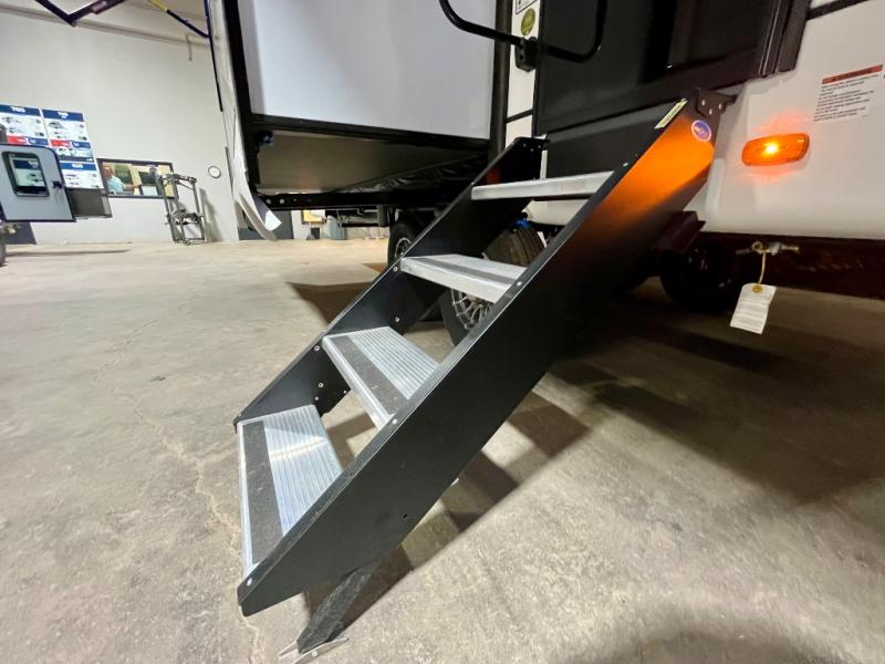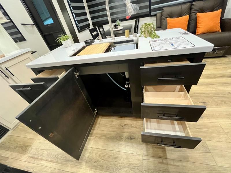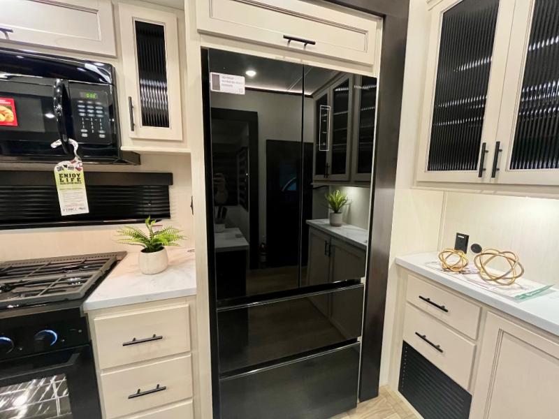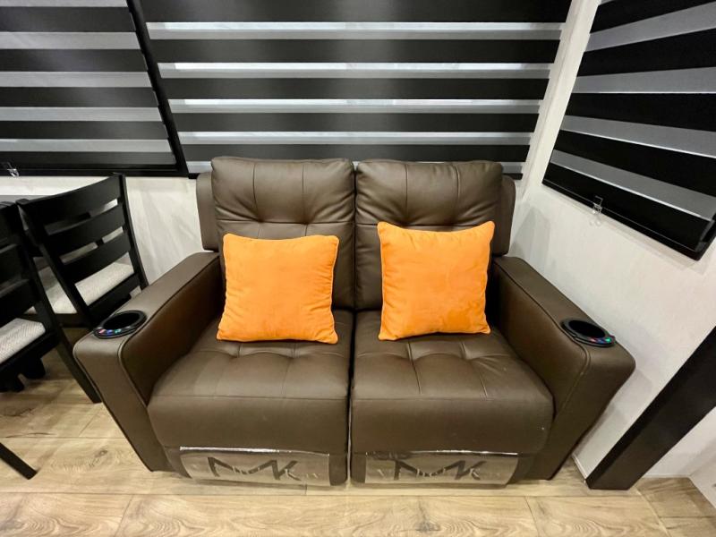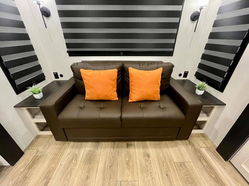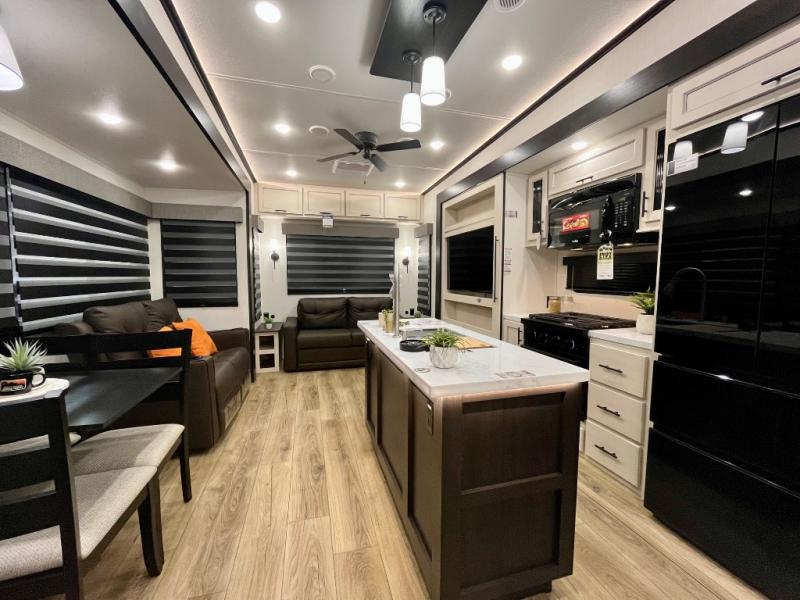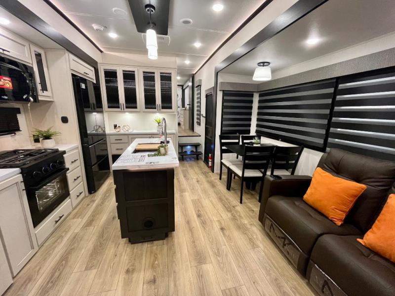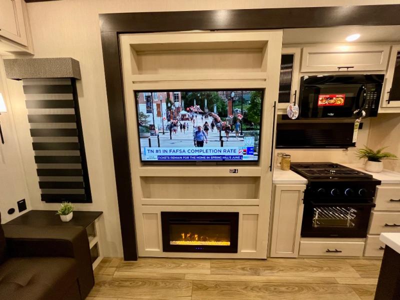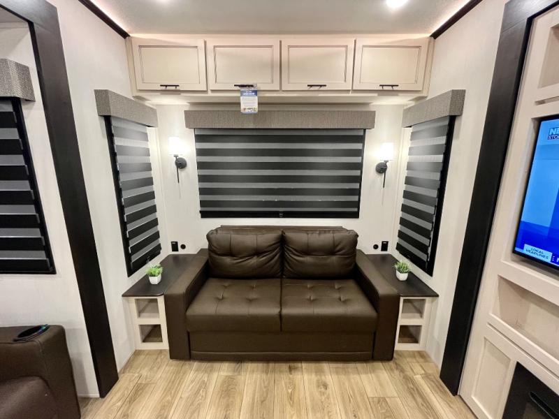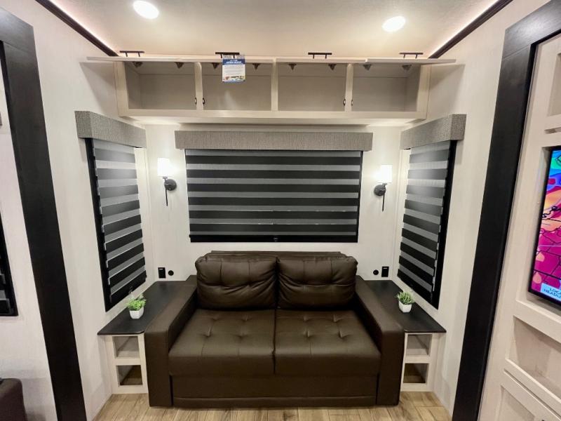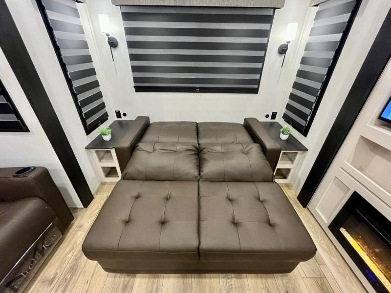 You will feel right at home in this fifth wheel! The rear living area includes a tri-fold sofa, a TV with a fireplace below, and theater seating for two making this space a second bedroom at night for guests. In the morning, you can prepare breakfast on the kitchen island and cooktop, then dine together at the versatile dinette/desk. There is plenty of storage space here, including a hidden pantry, a hutch, and overhead cabinets. The full bath will allow you to stay clean throughout your trip, and you'll feel right at home in the front private bedroom with a king bed. This model also includes an outside refrigerator for snacks, plus pass-thru storage for all your gear!