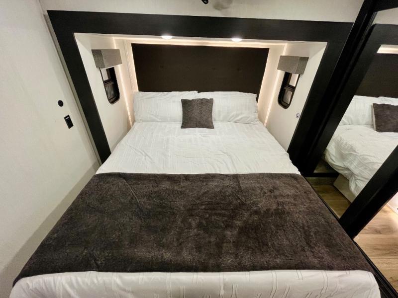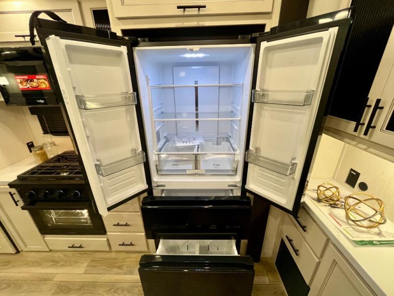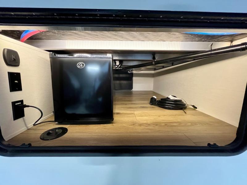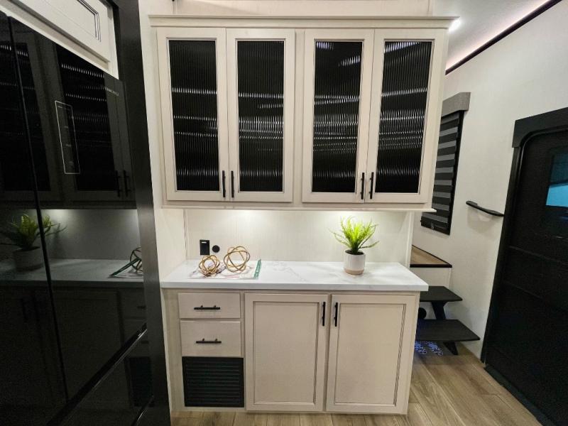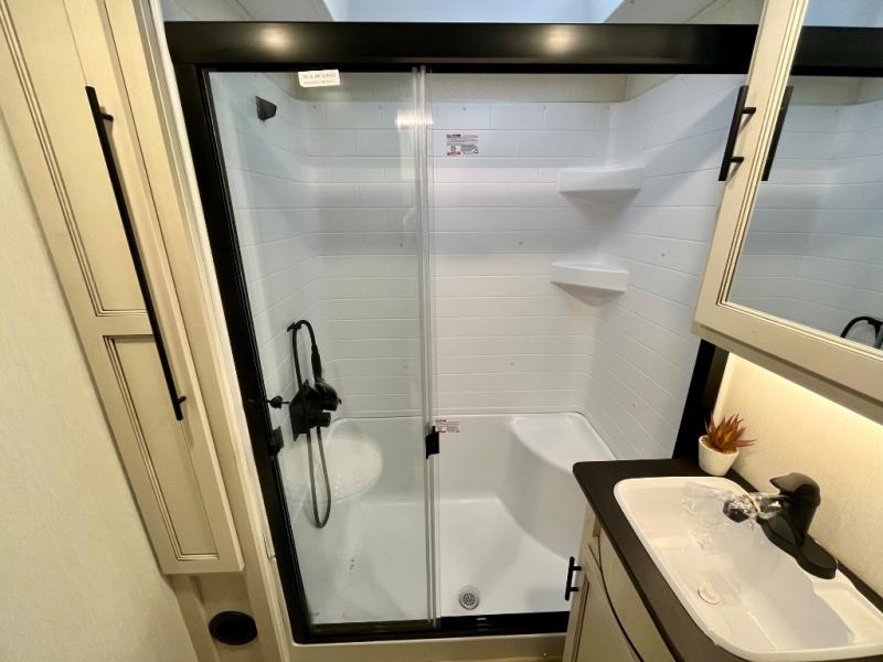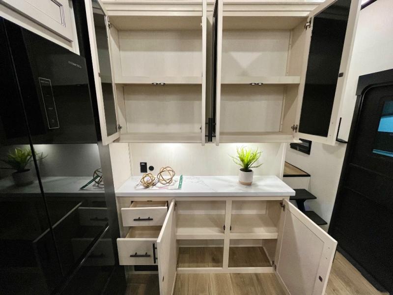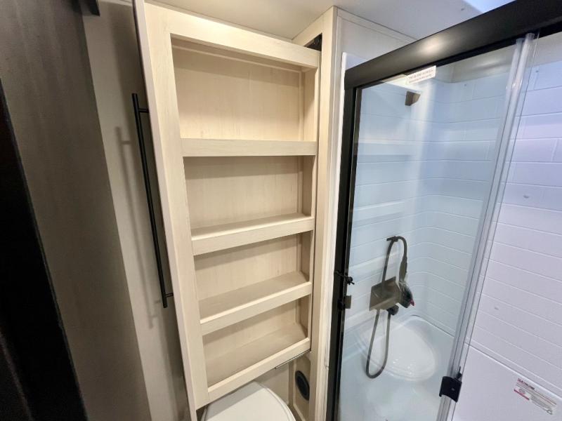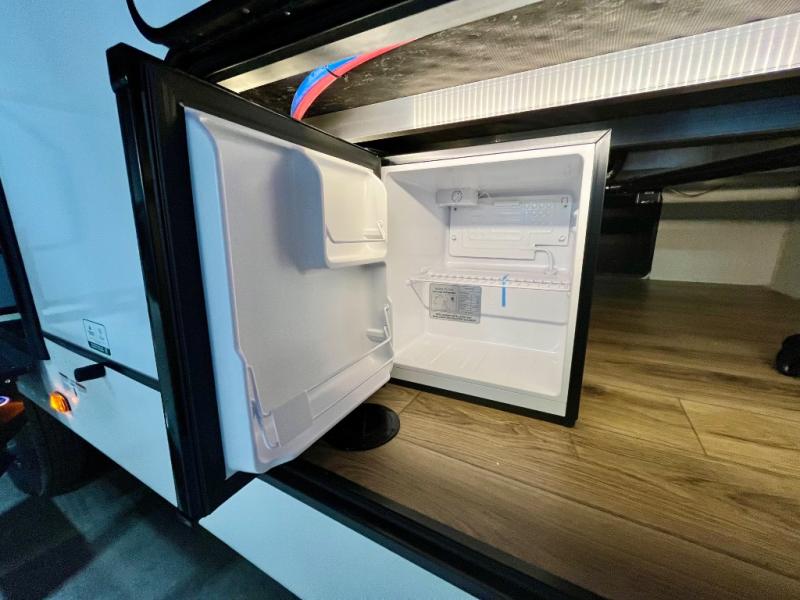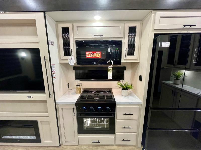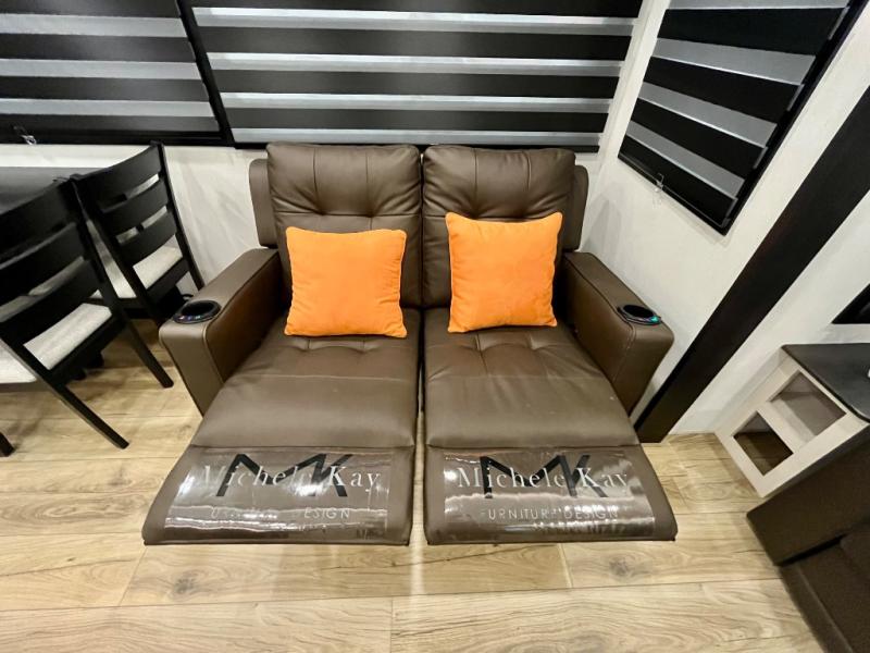 You will feel right at home in this fifth wheel! The rear living area includes a tri-fold sofa, a TV with a fireplace below, and theater seating for two making this space a second bedroom at night for guests. In the morning, you can prepare breakfast on the kitchen island and cooktop, then dine together at the versatile dinette/desk. There is plenty of storage space here, including a hidden pantry, a hutch, and overhead cabinets. The full bath will allow you to stay clean throughout your trip, and you'll feel right at home in the front private bedroom with a king bed. This model also includes an outside refrigerator for snacks, plus pass-thru storage for all your gear!