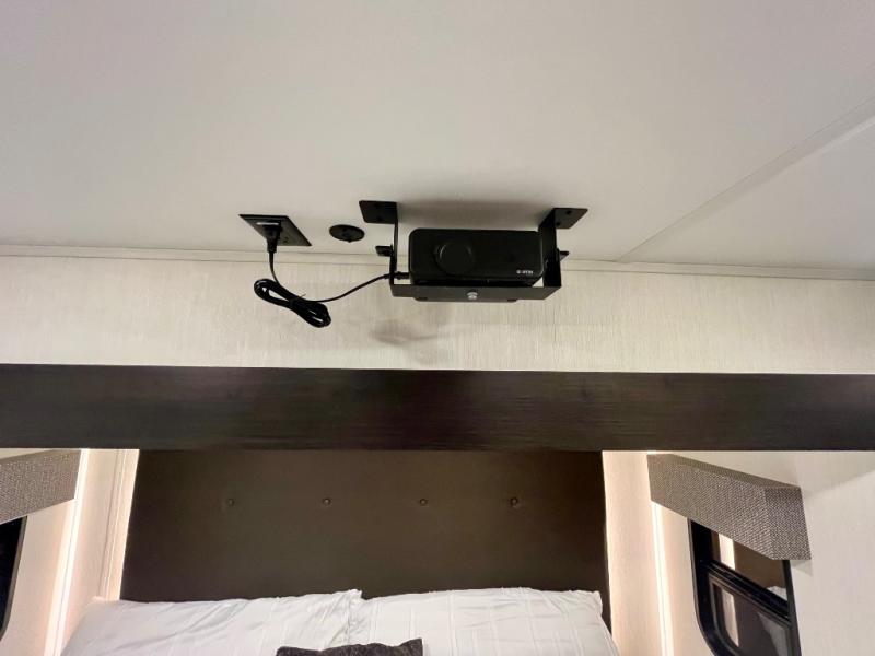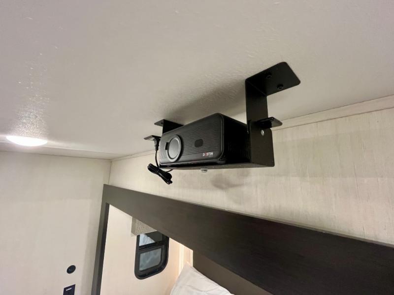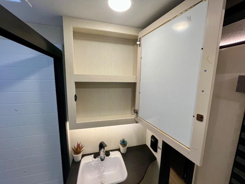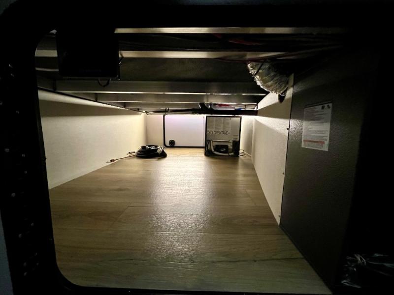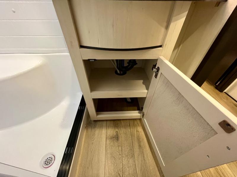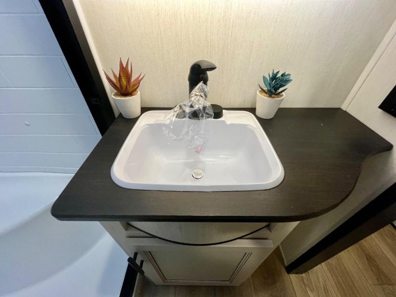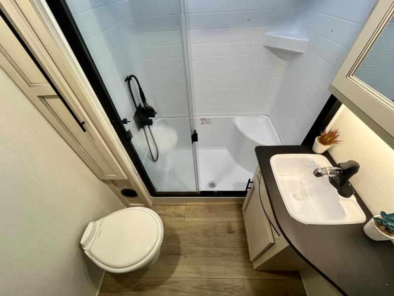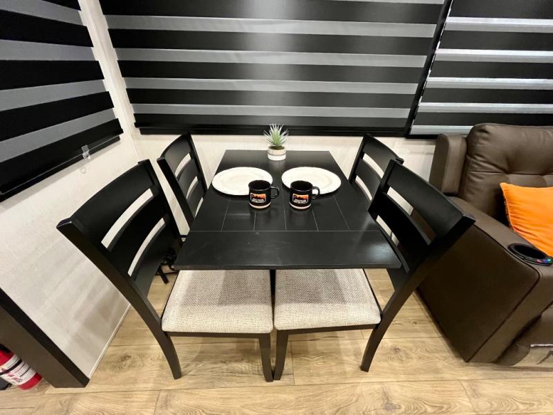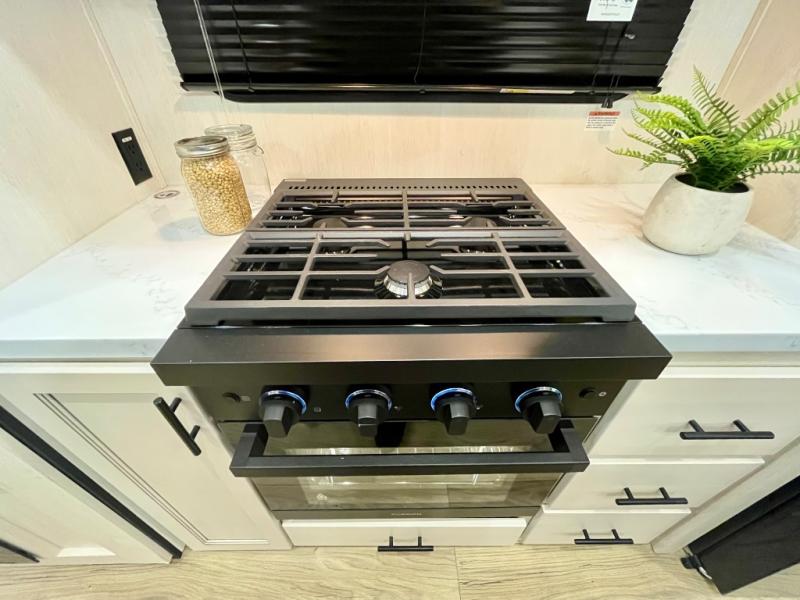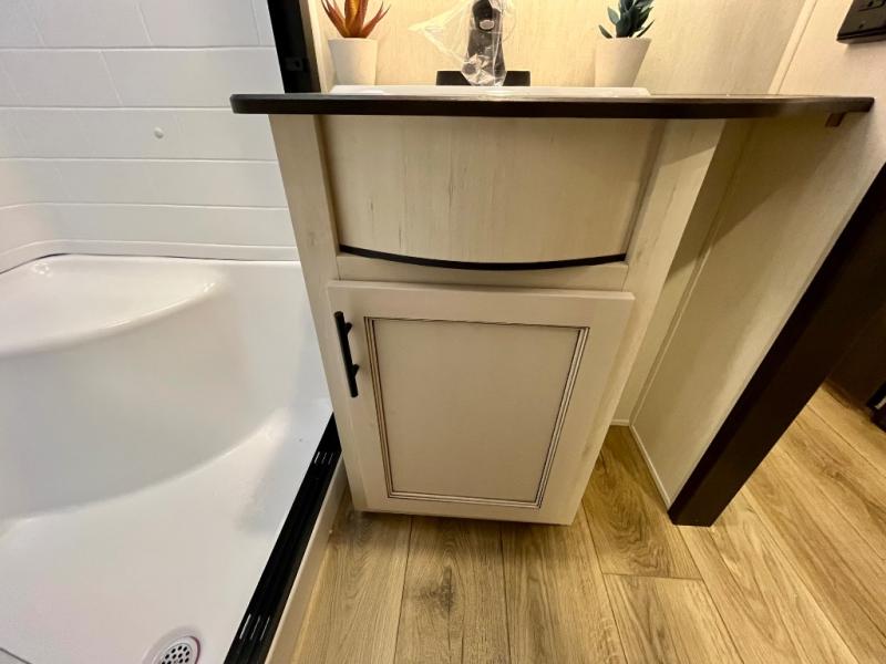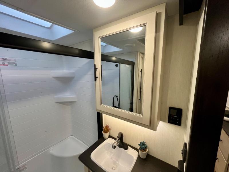 You will feel right at home in this fifth wheel! The rear living area includes a tri-fold sofa, a TV with a fireplace below, and theater seating for two making this space a second bedroom at night for guests. In the morning, you can prepare breakfast on the kitchen island and cooktop, then dine together at the versatile dinette/desk. There is plenty of storage space here, including a hidden pantry, a hutch, and overhead cabinets. The full bath will allow you to stay clean throughout your trip, and you'll feel right at home in the front private bedroom with a king bed. This model also includes an outside refrigerator for snacks, plus pass-thru storage for all your gear!
