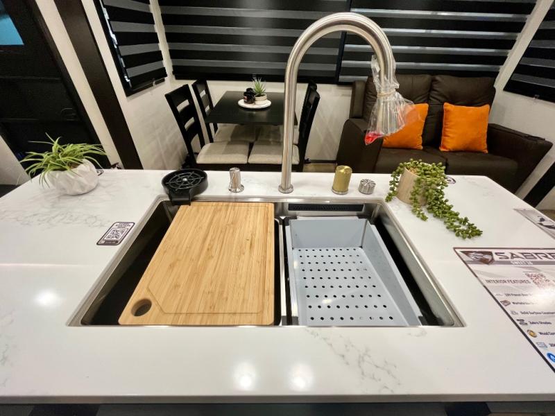 You will experience luxurious camping trips at an affordable price with any one of these Forest River Cherokee Sabre fifth wheels! These models are durable and ready to travel anytime of the year thanks to features like the high-gloss gel-coat front cap with LED lighting, the PVC roof membrane, and the forced air underbelly with enclosed gate valves. The electric auto-leveling system makes setting up easy and safe, and the adjustable power awning with LED lighting will create an inviting outdoor living space. Each model includes a universal docking station which includes a black tank flush and an outside shower, and adjustable stable steps for you to enter and exit the unit safely. Inside, you will love the design of the ambient accent lighting in the living area, the real wood lumbercore cabinetry, and the linoleum flooring!