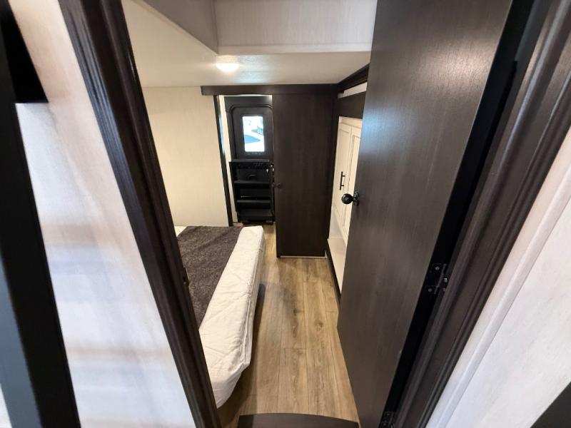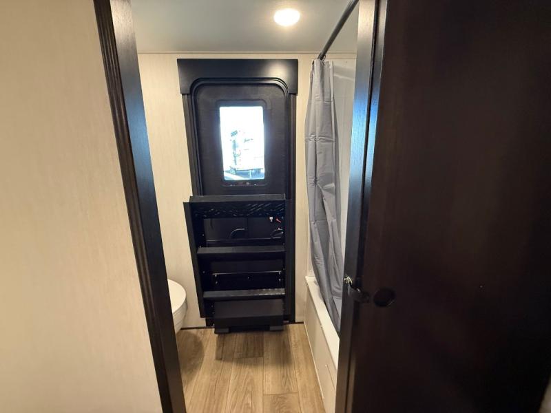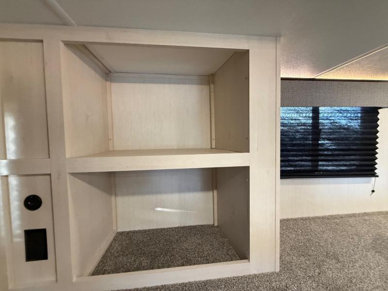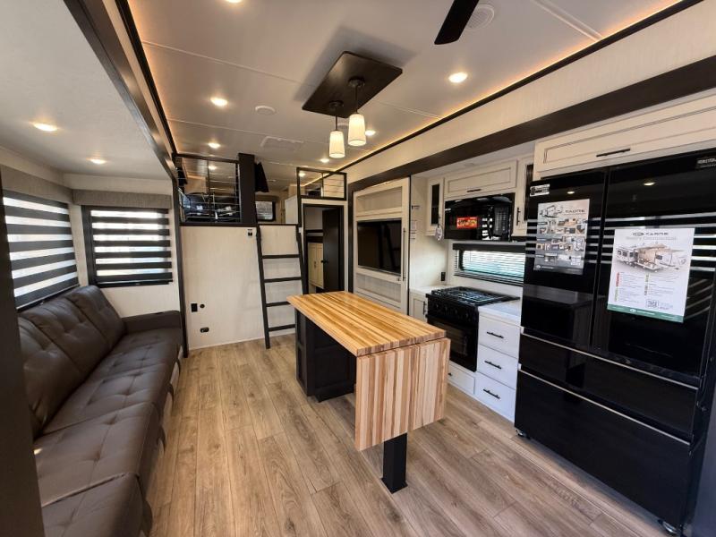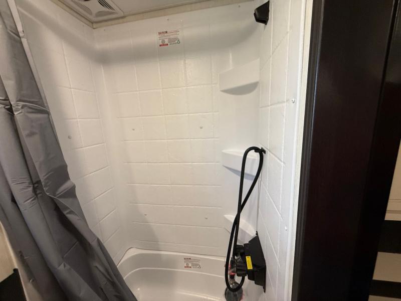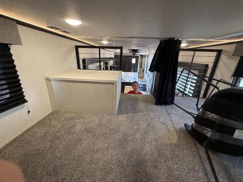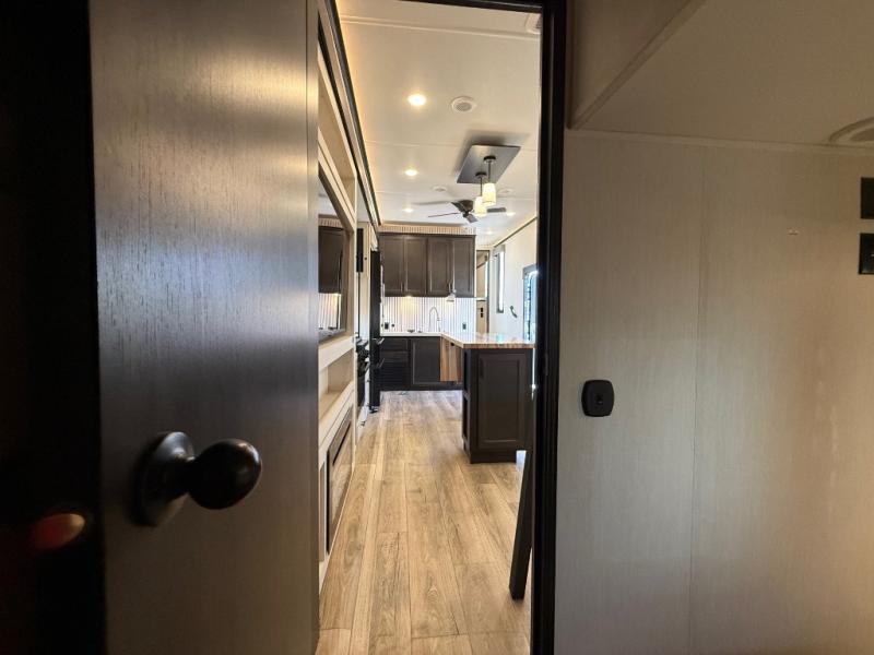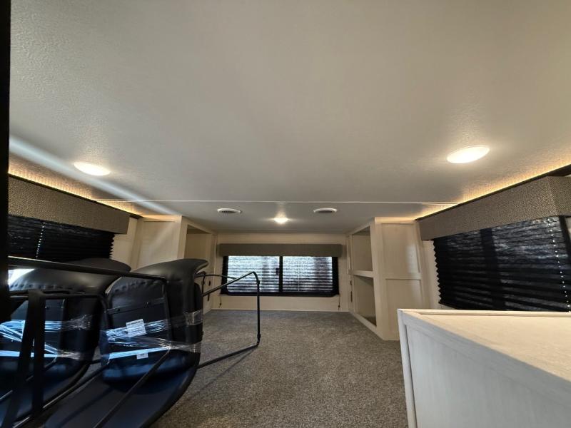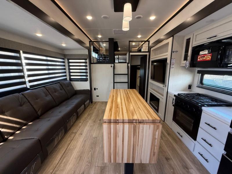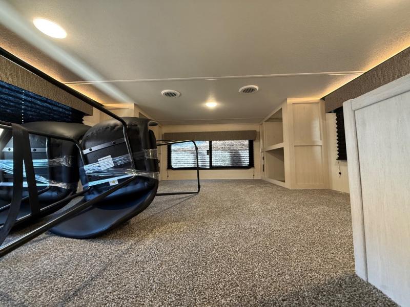 Are you looking for a fifth wheel where you can bring along your neighbor friends? You can do just that since there are two bedrooms in this unit, one of which includes a master bath with its own exterior entry door! The front bedroom is right next to the second full bath for convenience, and includes a camper king bed slide, a dresser, and front wardrobe. The rear master bedroom has a queen bed slide out across from a second slide for more floor space, and there is a loft above this room for more sleeping or storage space. Everyone can meet in the middle kitchen and living room since there are recliners, a ceiling fan, and kitchen island with four chairs. There is also storage below the island for kitchen necessities, and the hidden pantry behind the TV will be perfect for snacks, board games and more!