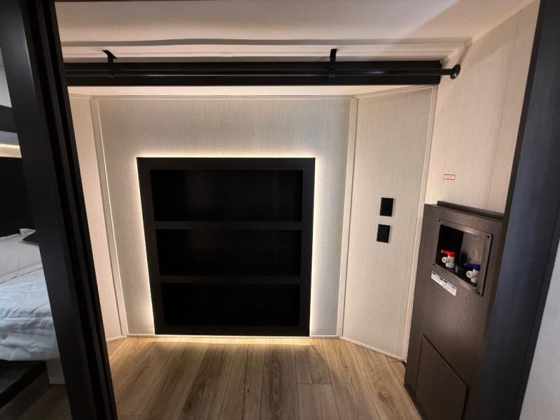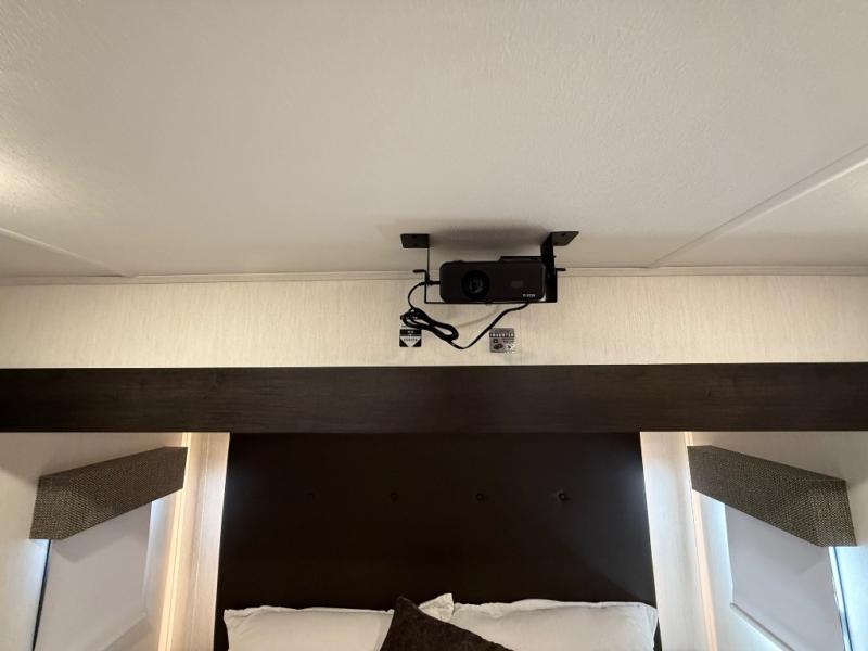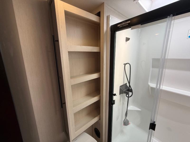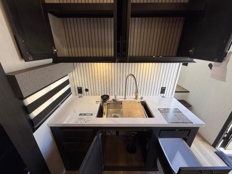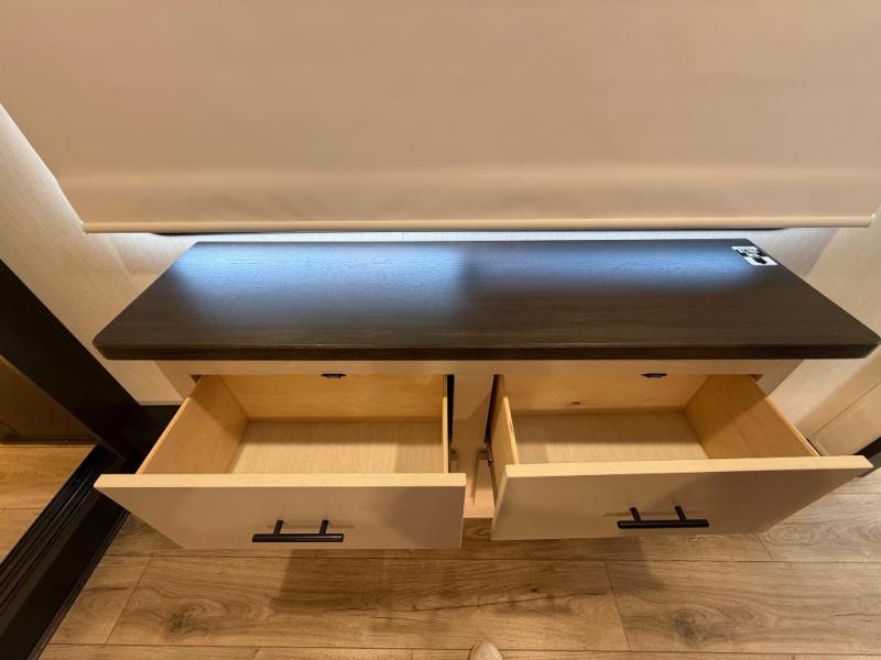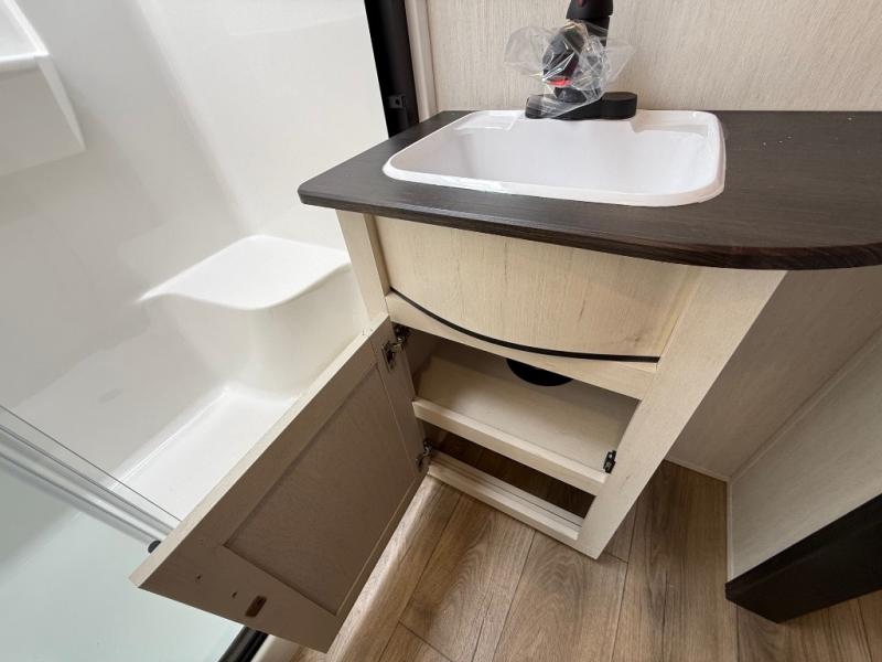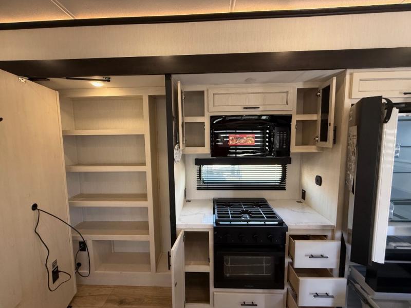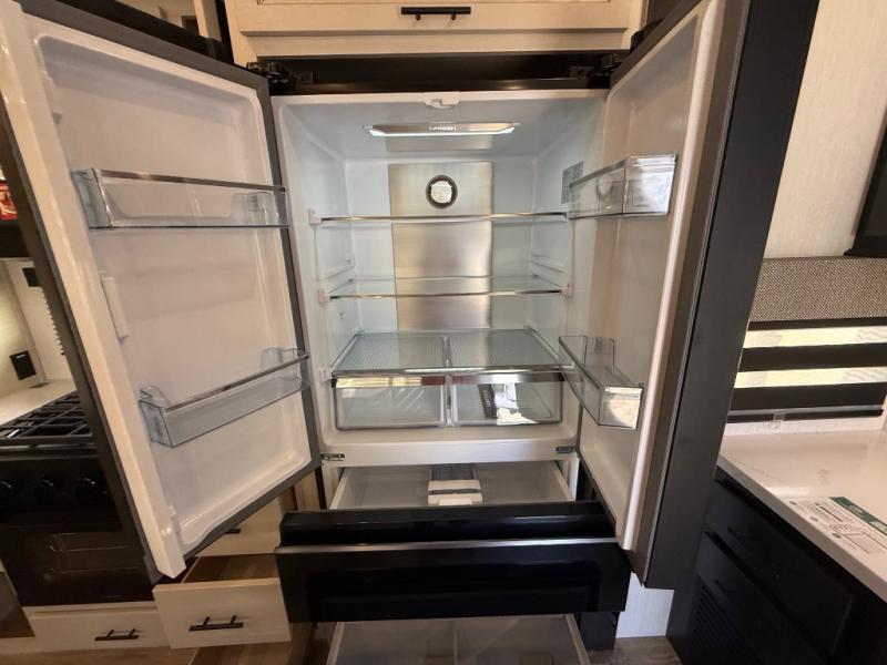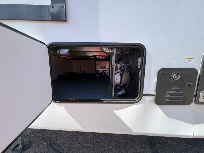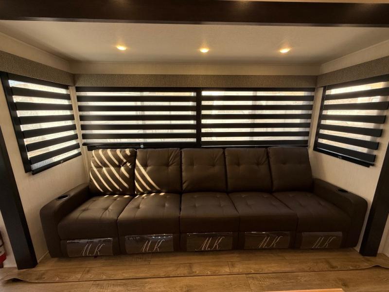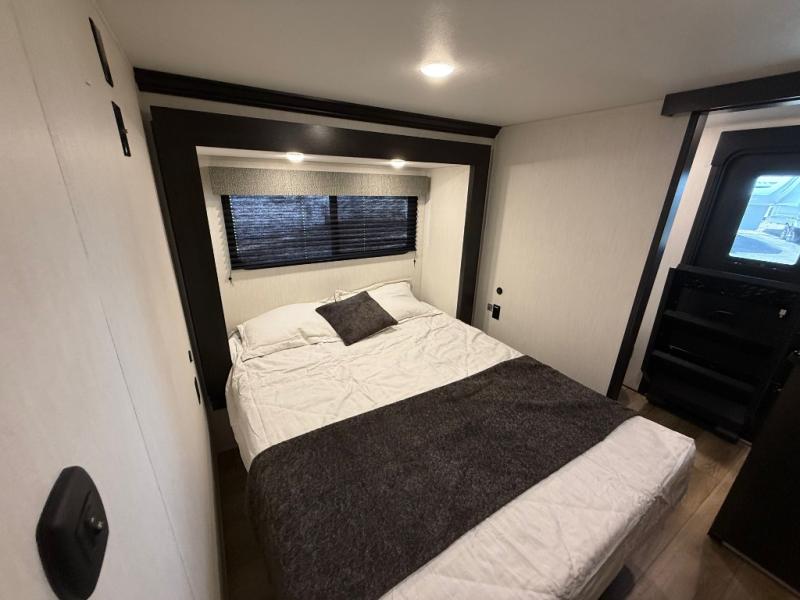 Are you looking for a fifth wheel where you can bring along your neighbor friends? You can do just that since there are two bedrooms in this unit, one of which includes a master bath with its own exterior entry door! The front bedroom is right next to the second full bath for convenience, and includes a camper king bed slide, a dresser, and front wardrobe. The rear master bedroom has a queen bed slide out across from a second slide for more floor space, and there is a loft above this room for more sleeping or storage space. Everyone can meet in the middle kitchen and living room since there are recliners, a ceiling fan, and kitchen island with four chairs. There is also storage below the island for kitchen necessities, and the hidden pantry behind the TV will be perfect for snacks, board games and more!