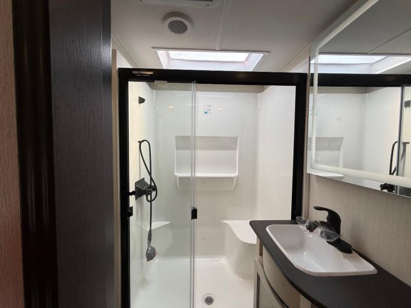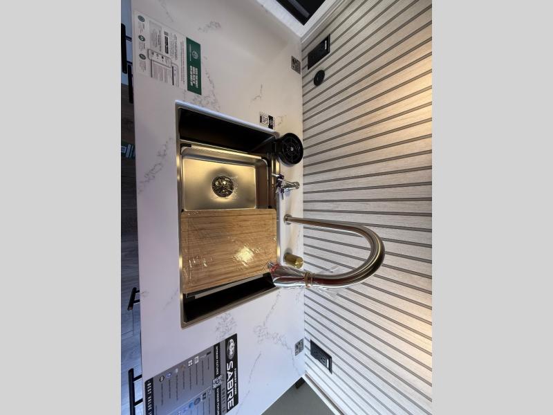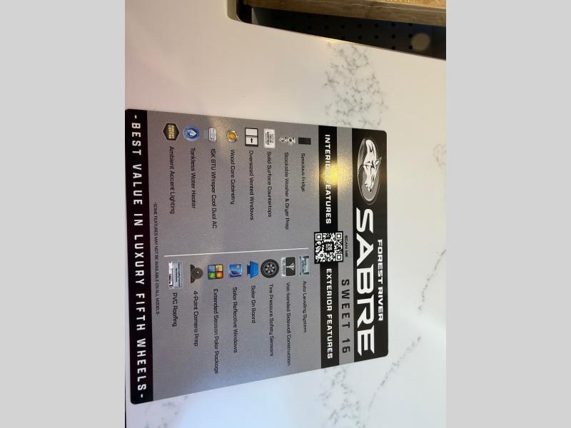 You will experience luxurious camping trips at an affordable price with any one of these Forest River Cherokee Sabre fifth wheels! These models are durable and ready to travel anytime of the year thanks to features like the high-gloss gel-coat front cap with LED lighting, the PVC roof membrane, and the forced air underbelly with enclosed gate valves. The electric auto-leveling system makes setting up easy and safe, and the adjustable power awning with LED lighting will create an inviting outdoor living space. Each model includes a universal docking station which includes a black tank flush and an outside shower, and adjustable stable steps for you to enter and exit the unit safely. Inside, you will love the design of the ambient accent lighting in the living area, the real wood lumbercore cabinetry, and the linoleum flooring!