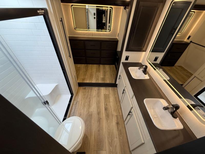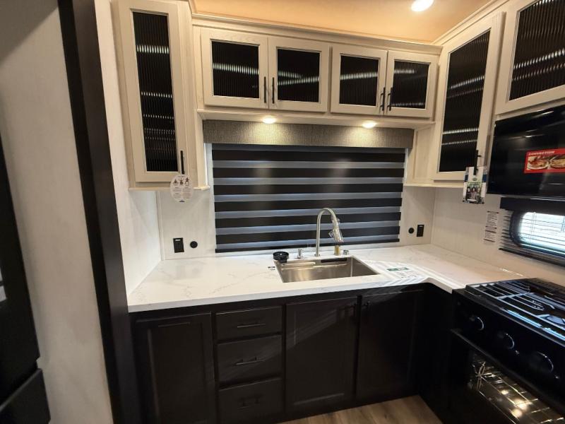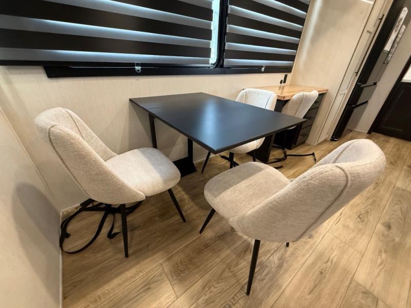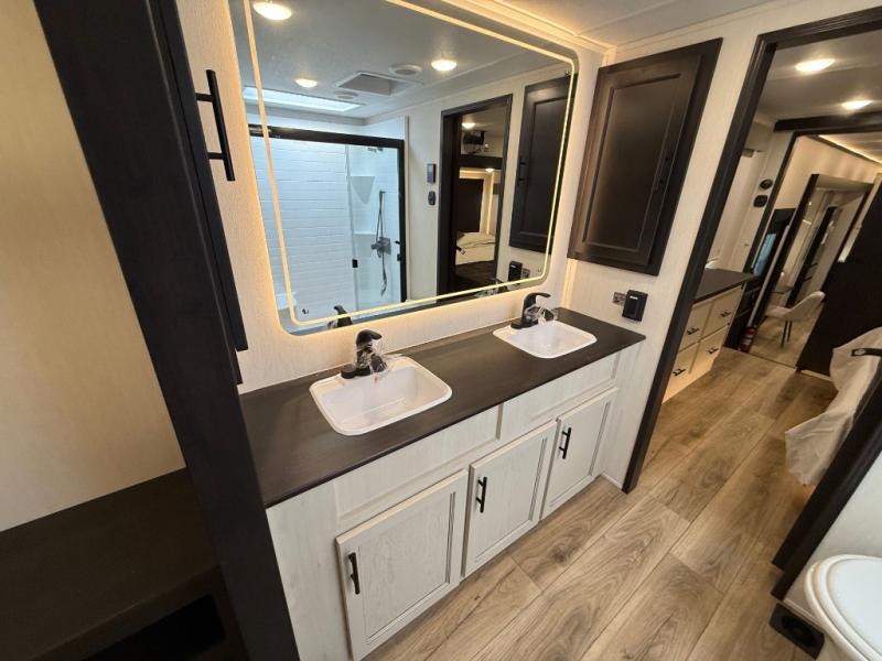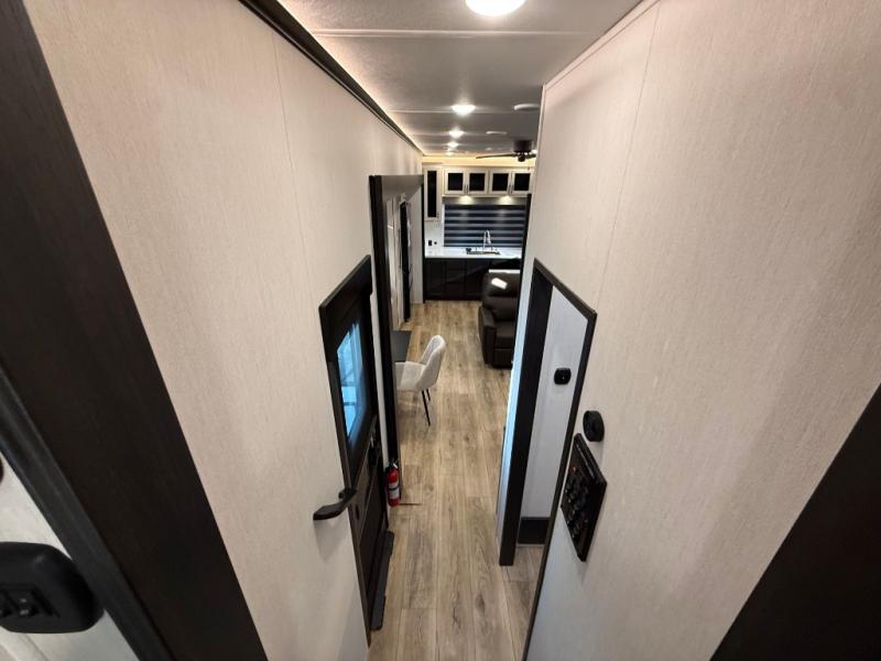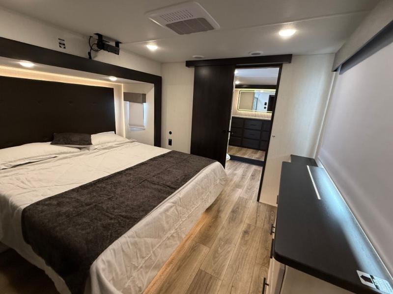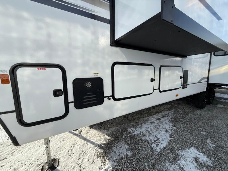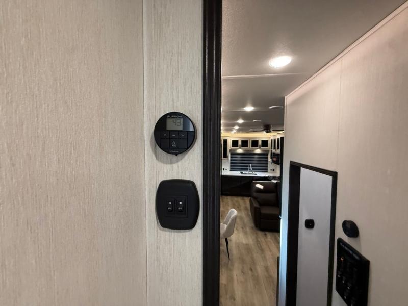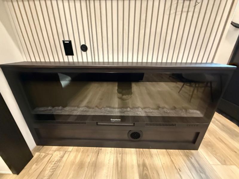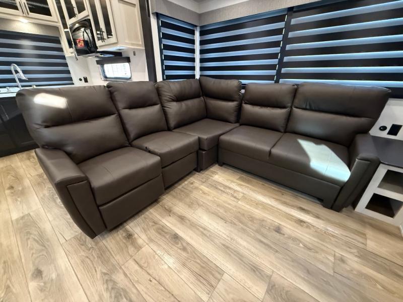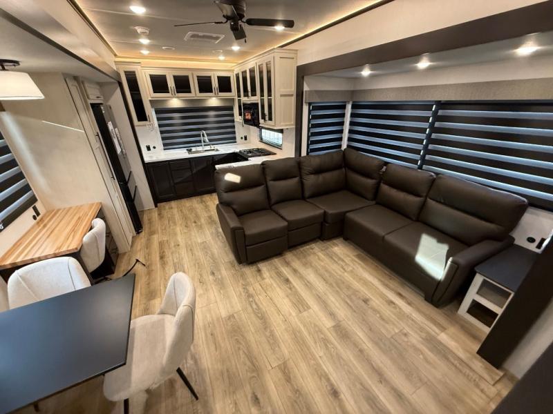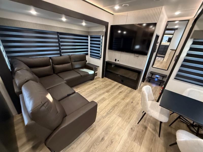 Get ready to elevate your travels to new heights with this show-stopping fifth wheel, designed for thrill-seekers. The rear kitchen is a culinary powerhouse, featuring a spacious layout, overhead cabinets, ample countertop, three-burner cooktop, microwave, oversized fridge, and pantry. In the living area section, the sectional sofa creates a warm and inviting space, perfect for socializing, relaxing, and making memories. The fireplace crackles with warmth, while the entertainment center provides endless entertainment options. Also, the dinette is a charming spot for meals, laughter, and storytelling. Unwind and recharge in style, with plenty of room to get ready for the day ahead, thanks to the full bath with dual sinks, ample dresser space, and a half-bath in the middle of this unit for added convenience. Moving to the main bedroom, the camper king bed is perfect for a restful night's sleep, and the dresser with hidden storage keeps your belongings organized, while the projector above the dresser adds a touch of magic to movie nights.
