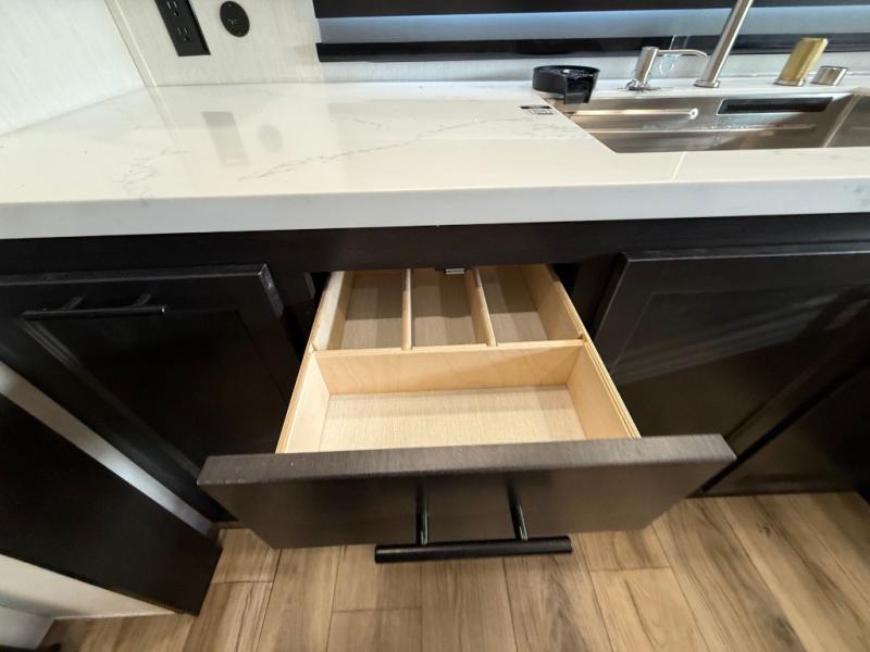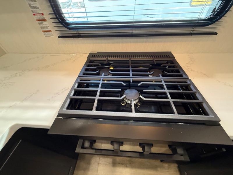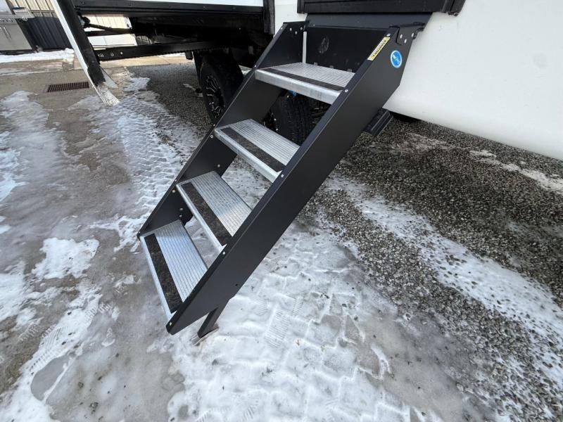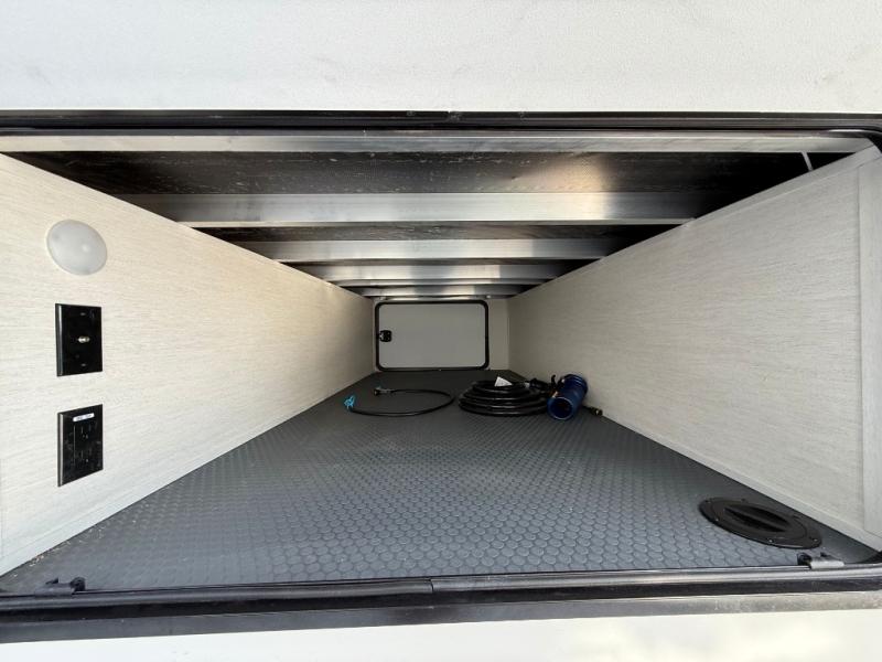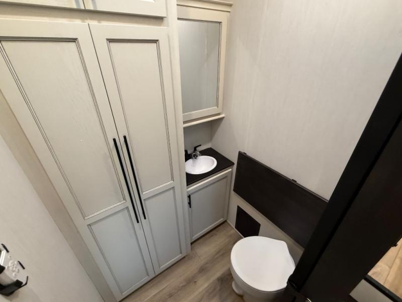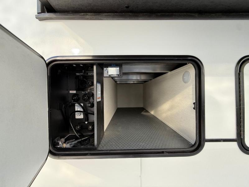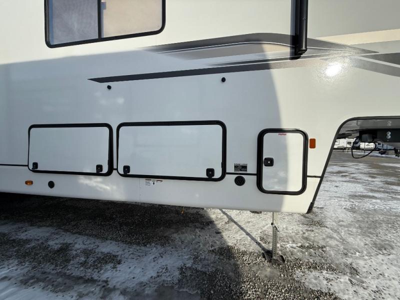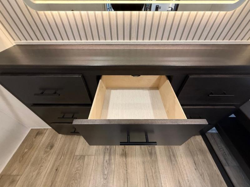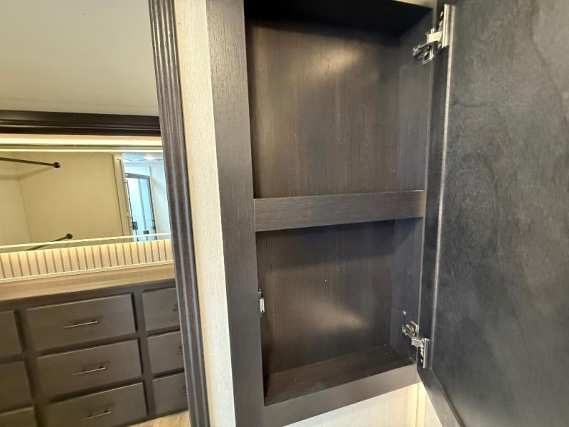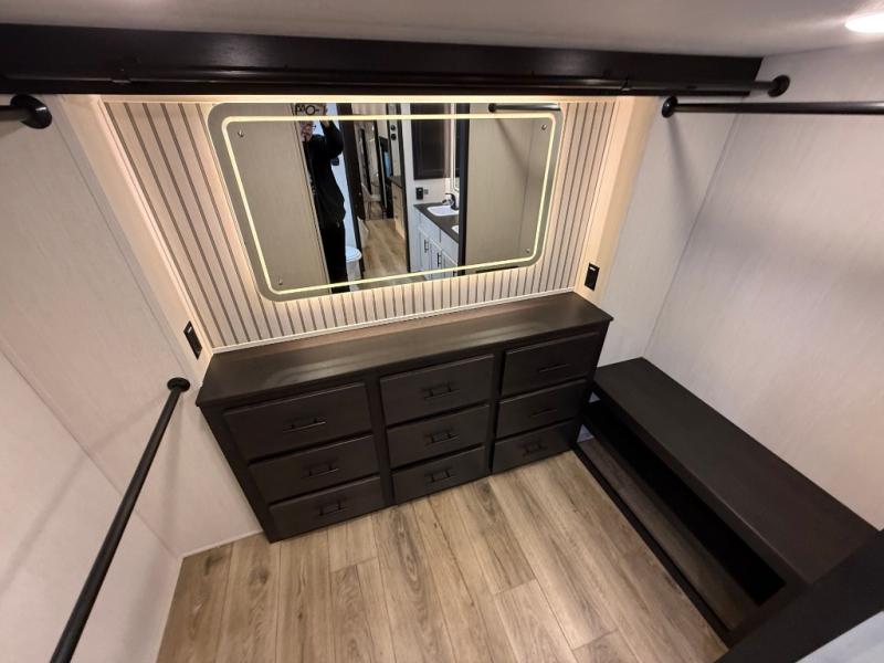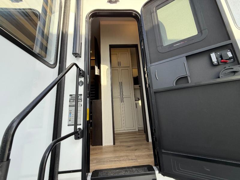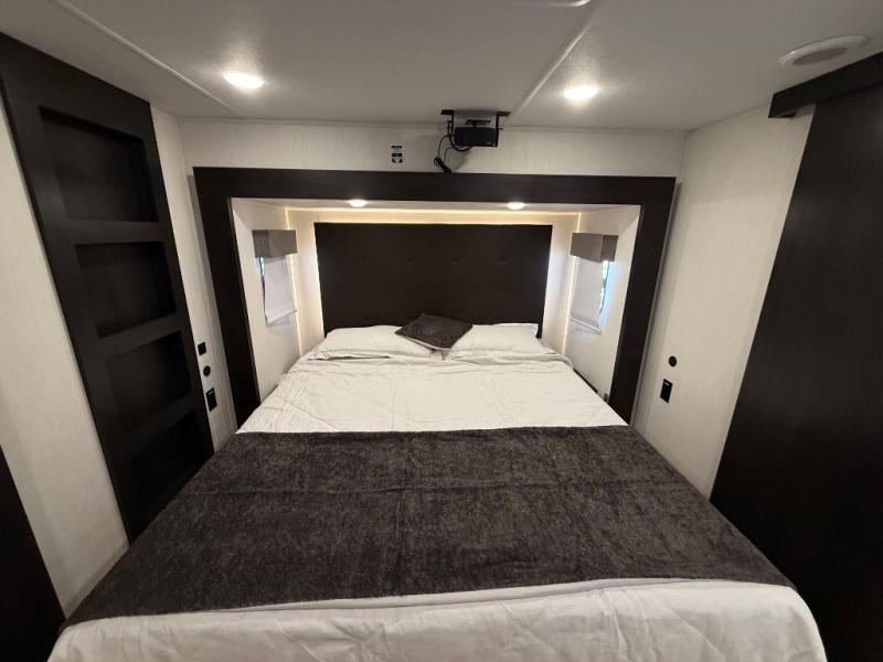 Get ready to elevate your travels to new heights with this show-stopping fifth wheel, designed for thrill-seekers. The rear kitchen is a culinary powerhouse, featuring a spacious layout, overhead cabinets, ample countertop, three-burner cooktop, microwave, oversized fridge, and pantry. In the living area section, the sectional sofa creates a warm and inviting space, perfect for socializing, relaxing, and making memories. The fireplace crackles with warmth, while the entertainment center provides endless entertainment options. Also, the dinette is a charming spot for meals, laughter, and storytelling. Unwind and recharge in style, with plenty of room to get ready for the day ahead, thanks to the full bath with dual sinks, ample dresser space, and a half-bath in the middle of this unit for added convenience. Moving to the main bedroom, the camper king bed is perfect for a restful night's sleep, and the dresser with hidden storage keeps your belongings organized, while the projector above the dresser adds a touch of magic to movie nights.
