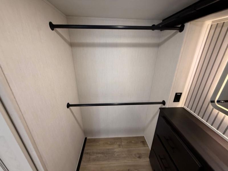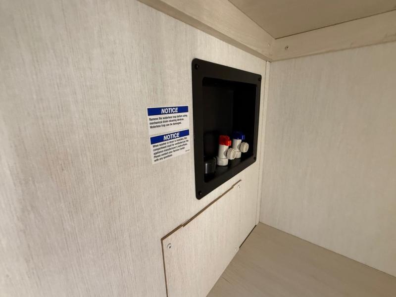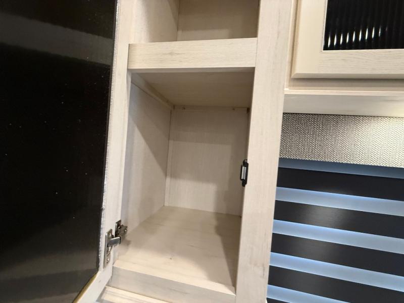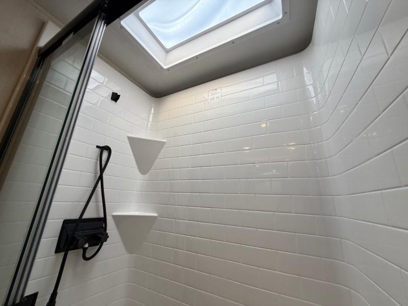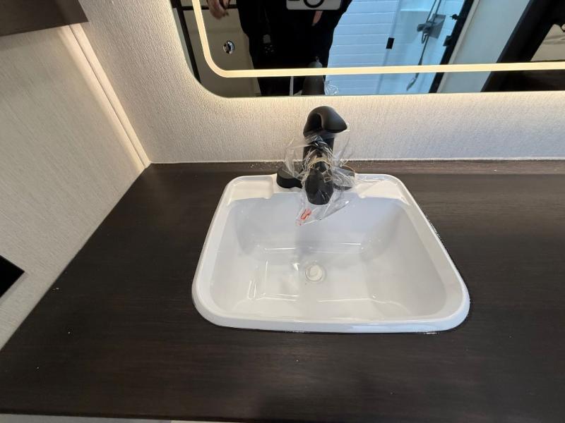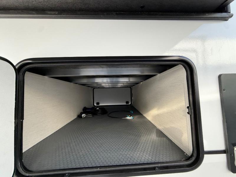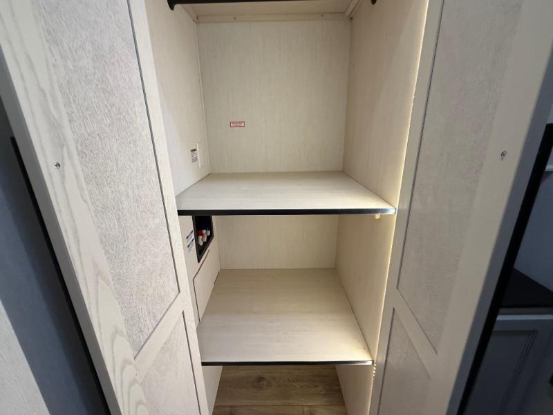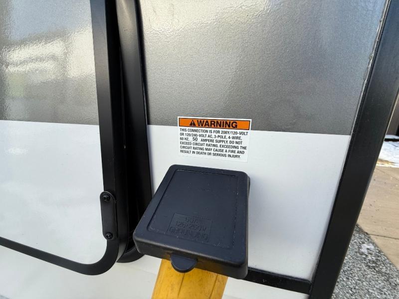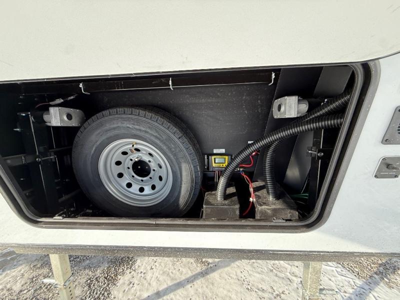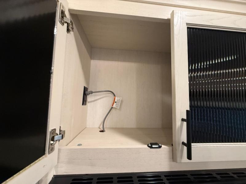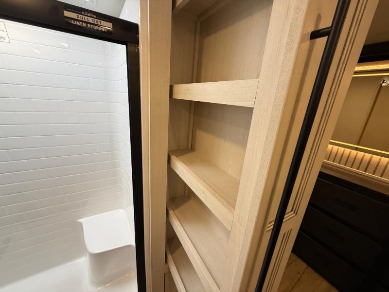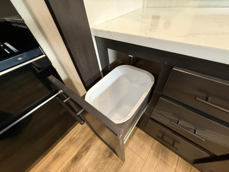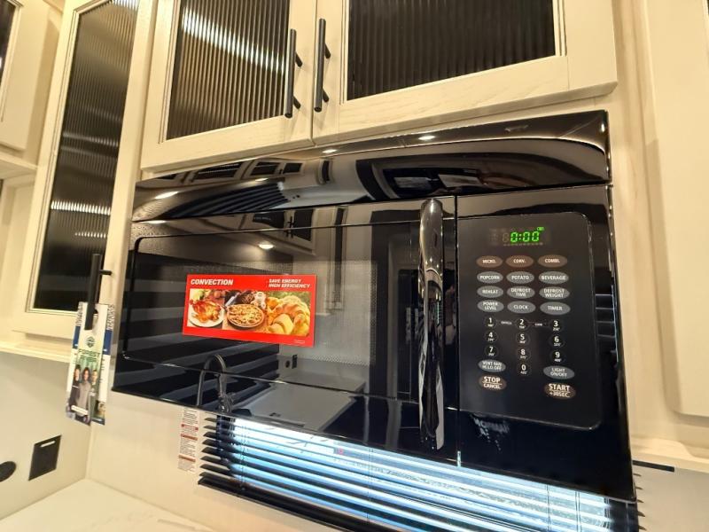 Get ready to elevate your travels to new heights with this show-stopping fifth wheel, designed for thrill-seekers. The rear kitchen is a culinary powerhouse, featuring a spacious layout, overhead cabinets, ample countertop, three-burner cooktop, microwave, oversized fridge, and pantry. In the living area section, the sectional sofa creates a warm and inviting space, perfect for socializing, relaxing, and making memories. The fireplace crackles with warmth, while the entertainment center provides endless entertainment options. Also, the dinette is a charming spot for meals, laughter, and storytelling. Unwind and recharge in style, with plenty of room to get ready for the day ahead, thanks to the full bath with dual sinks, ample dresser space, and a half-bath in the middle of this unit for added convenience. Moving to the main bedroom, the camper king bed is perfect for a restful night's sleep, and the dresser with hidden storage keeps your belongings organized, while the projector above the dresser adds a touch of magic to movie nights.