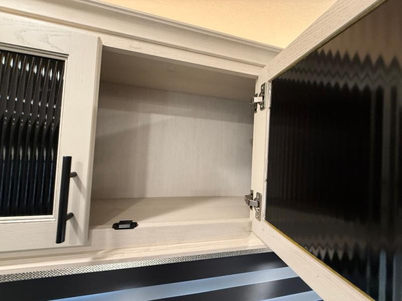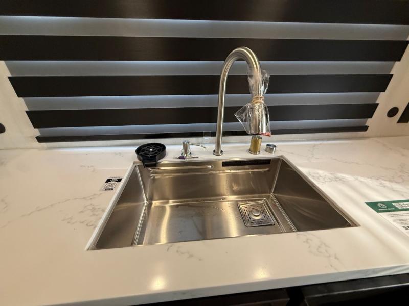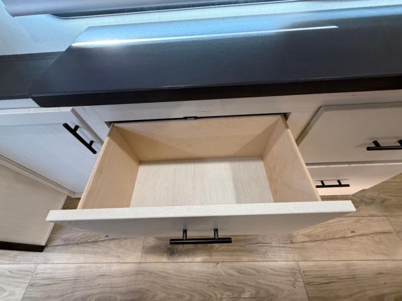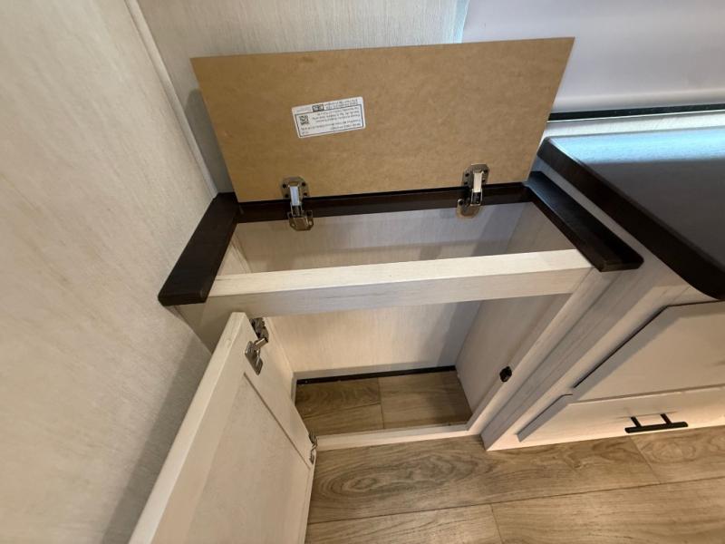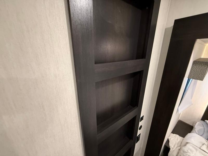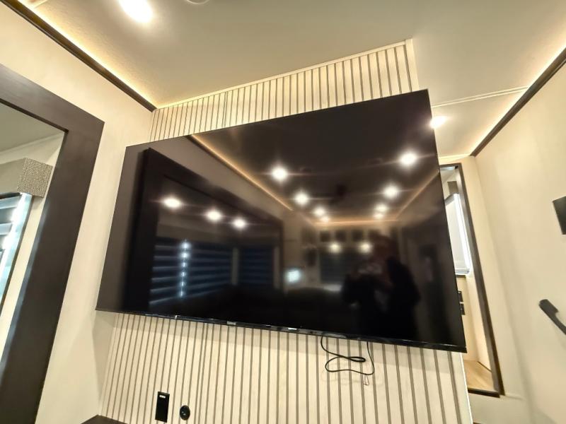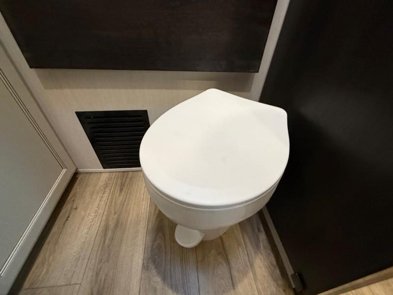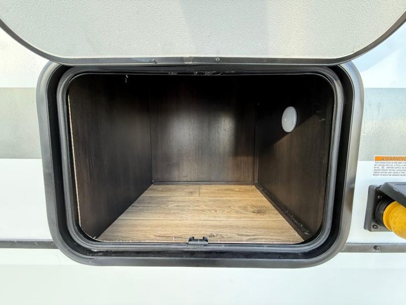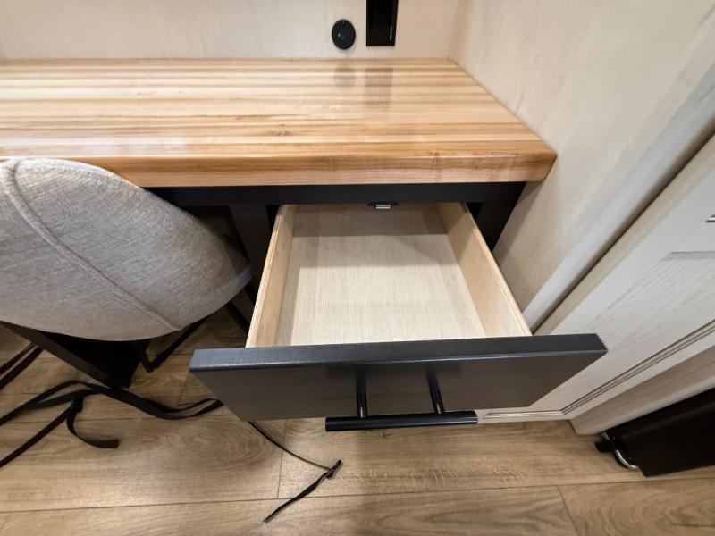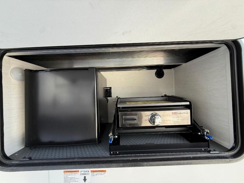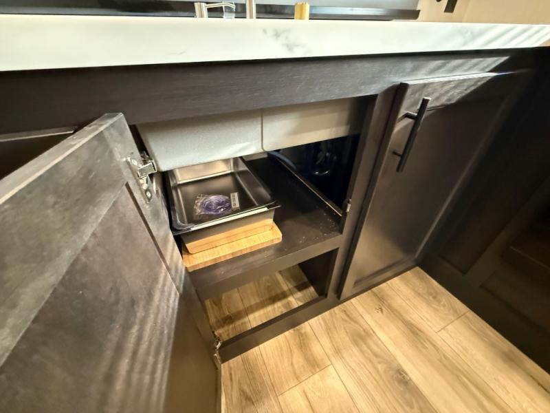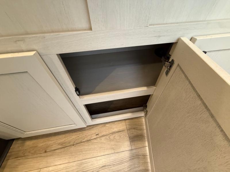 Get ready to elevate your travels to new heights with this show-stopping fifth wheel, designed for thrill-seekers. The rear kitchen is a culinary powerhouse, featuring a spacious layout, overhead cabinets, ample countertop, three-burner cooktop, microwave, oversized fridge, and pantry. In the living area section, the sectional sofa creates a warm and inviting space, perfect for socializing, relaxing, and making memories. The fireplace crackles with warmth, while the entertainment center provides endless entertainment options. Also, the dinette is a charming spot for meals, laughter, and storytelling. Unwind and recharge in style, with plenty of room to get ready for the day ahead, thanks to the full bath with dual sinks, ample dresser space, and a half-bath in the middle of this unit for added convenience. Moving to the main bedroom, the camper king bed is perfect for a restful night's sleep, and the dresser with hidden storage keeps your belongings organized, while the projector above the dresser adds a touch of magic to movie nights.