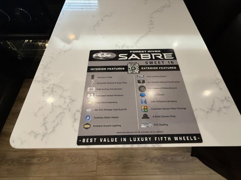 You will experience luxurious camping trips at an affordable price with any one of these Forest River Cherokee Sabre fifth wheels! These models are durable and ready to travel anytime of the year thanks to features like the high-gloss gel-coat front cap with LED lighting, the PVC roof membrane, and the forced air underbelly with enclosed gate valves. The electric auto-leveling system makes setting up easy and safe, and the adjustable power awning with LED lighting will create an inviting outdoor living space. Each model includes a universal docking station which includes a black tank flush and an outside shower, and adjustable stable steps for you to enter and exit the unit safely. Inside, you will love the design of the ambient accent lighting in the living area, the real wood lumbercore cabinetry, and the linoleum flooring!