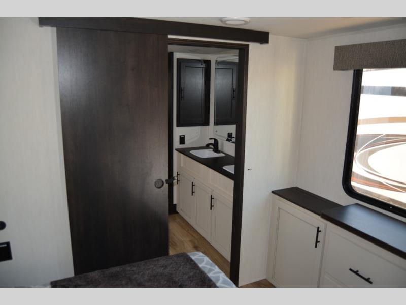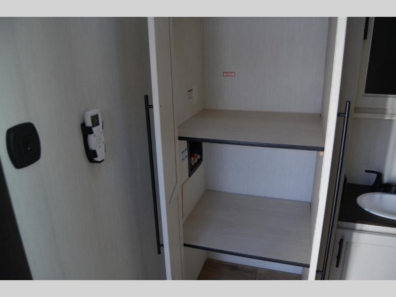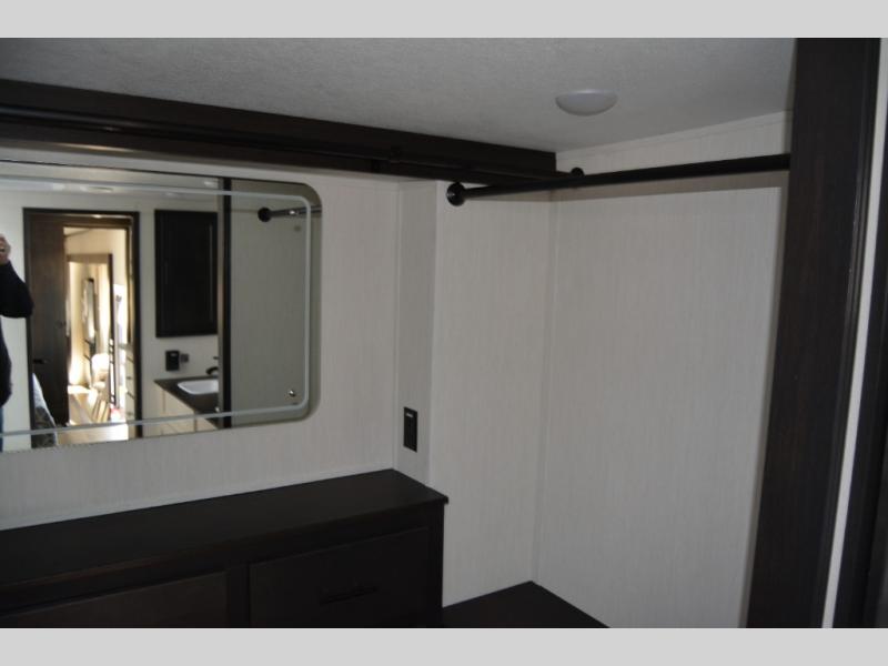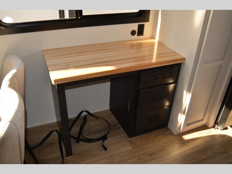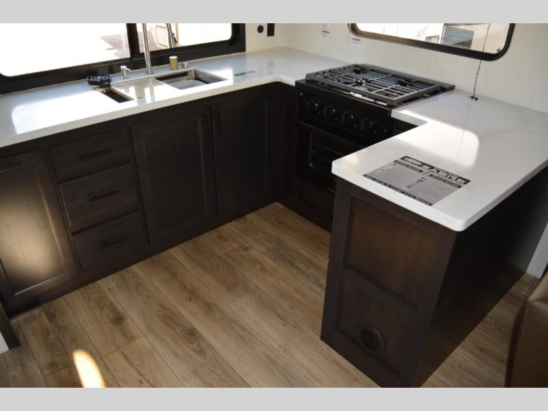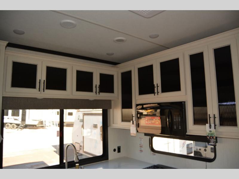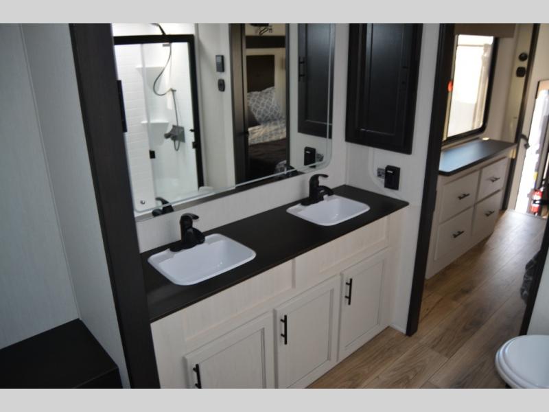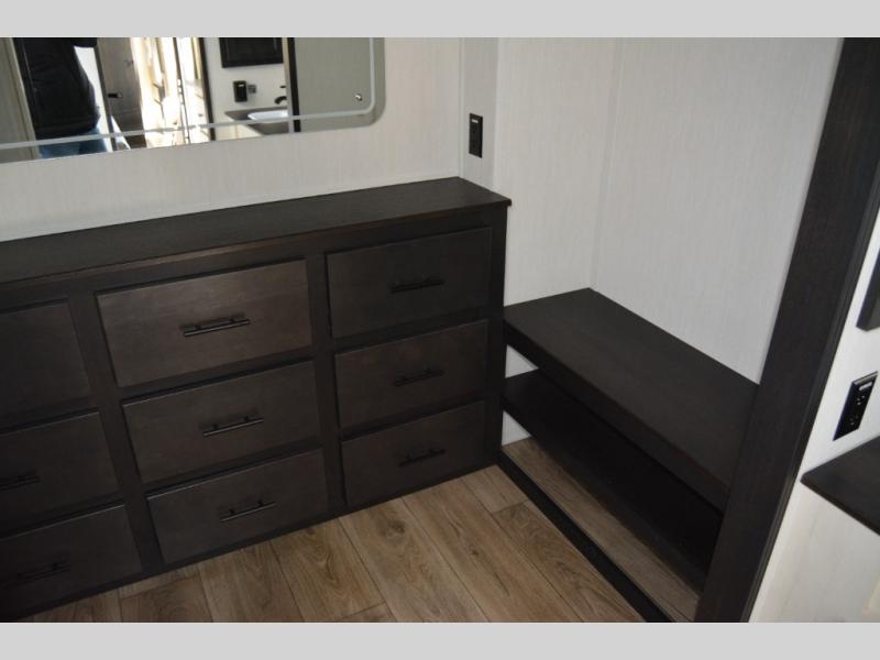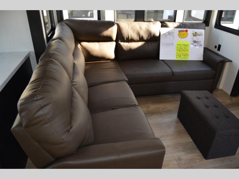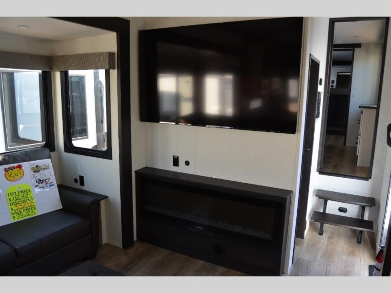 Get ready to elevate your travels to new heights with this show-stopping fifth wheel, designed for thrill-seekers. The rear kitchen is a culinary powerhouse, featuring a spacious layout, overhead cabinets, ample countertop, three-burner cooktop, microwave, oversized fridge, and pantry. In the living area section, the sectional sofa creates a warm and inviting space, perfect for socializing, relaxing, and making memories. The fireplace crackles with warmth, while the entertainment center provides endless entertainment options. Also, the dinette is a charming spot for meals, laughter, and storytelling. Unwind and recharge in style, with plenty of room to get ready for the day ahead, thanks to the full bath with dual sinks, ample dresser space, and a half-bath in the middle of this unit for added convenience. Moving to the main bedroom, the camper king bed is perfect for a restful night's sleep, and the dresser with hidden storage keeps your belongings organized, while the projector above the dresser adds a touch of magic to movie nights.