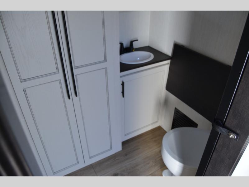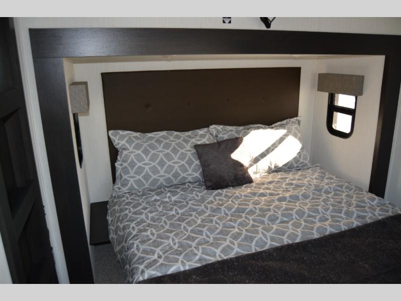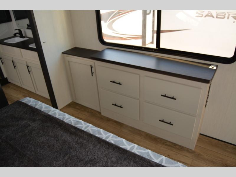 You will experience luxurious camping trips at an affordable price with any one of these Forest River Cherokee Sabre fifth wheels! These models are durable and ready to travel anytime of the year thanks to features like the high-gloss gel-coat front cap with LED lighting, the PVC roof membrane, and the forced air underbelly with enclosed gate valves. The electric auto-leveling system makes setting up easy and safe, and the adjustable power awning with LED lighting will create an inviting outdoor living space. Each model includes a universal docking station which includes a black tank flush and an outside shower, and adjustable stable steps for you to enter and exit the unit safely. Inside, you will love the design of the ambient accent lighting in the living area, the real wood lumbercore cabinetry, and the linoleum flooring!