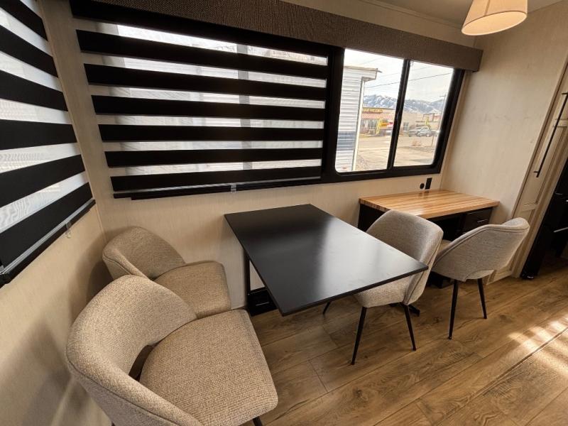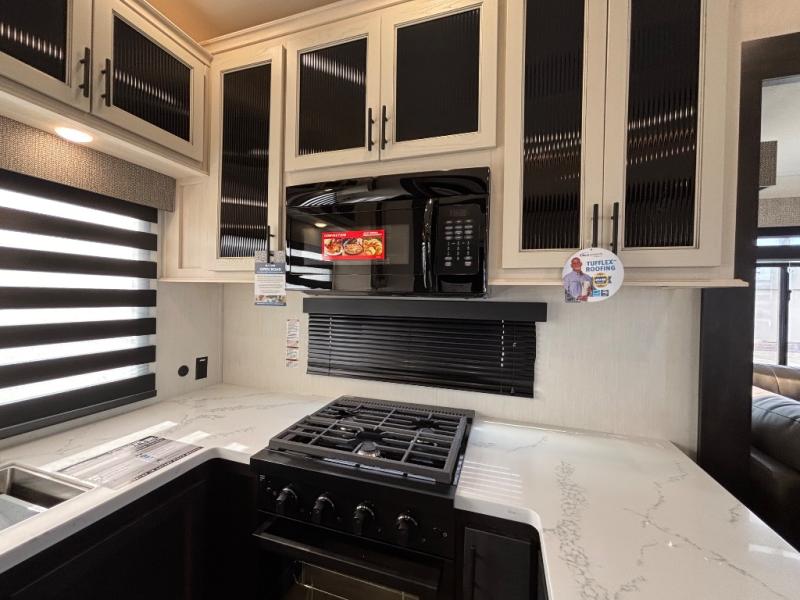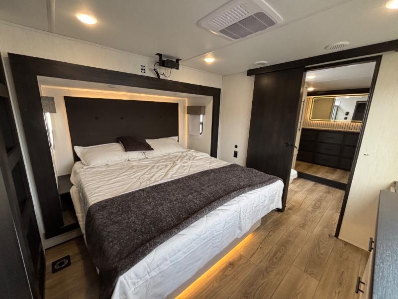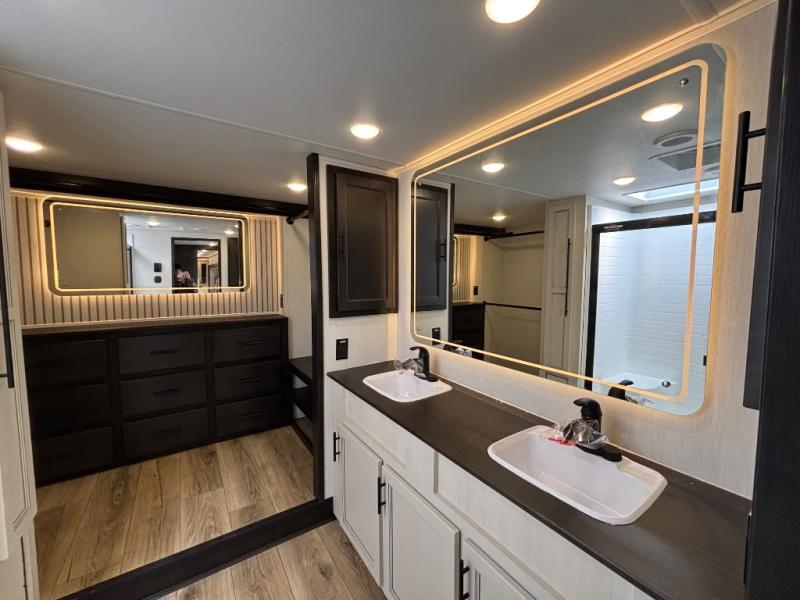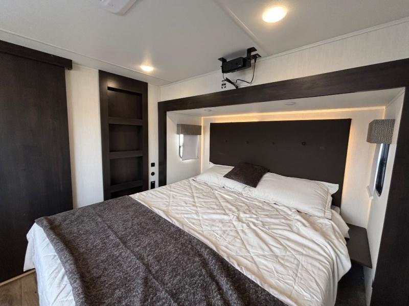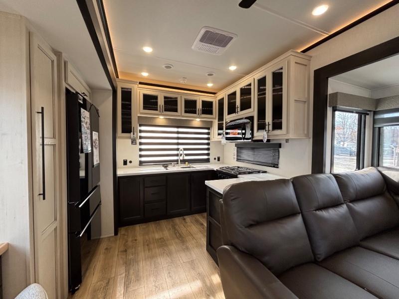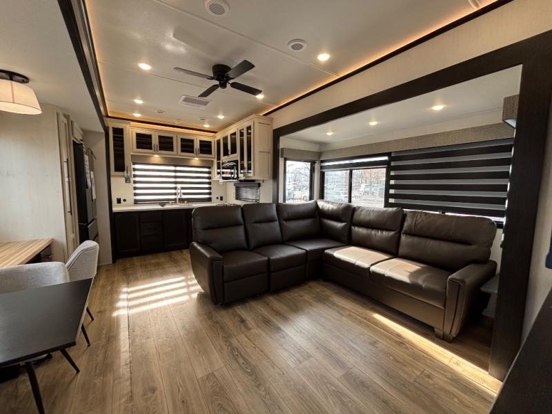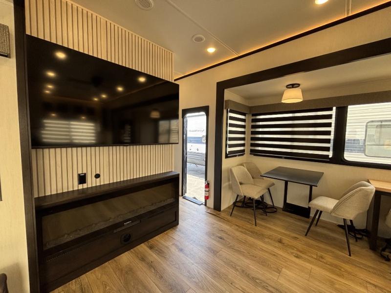 Get ready to elevate your travels to new heights with this show-stopping fifth wheel, designed for thrill-seekers. The rear kitchen is a culinary powerhouse, featuring a spacious layout, overhead cabinets, ample countertop, three-burner cooktop, microwave, oversized fridge, and pantry. In the living area section, the sectional sofa creates a warm and inviting space, perfect for socializing, relaxing, and making memories. The fireplace crackles with warmth, while the entertainment center provides endless entertainment options. Also, the dinette is a charming spot for meals, laughter, and storytelling. Unwind and recharge in style, with plenty of room to get ready for the day ahead, thanks to the full bath with dual sinks, ample dresser space, and a half-bath in the middle of this unit for added convenience. Moving to the main bedroom, the camper king bed is perfect for a restful night's sleep, and the dresser with hidden storage keeps your belongings organized, while the projector above the dresser adds a touch of magic to movie nights.
