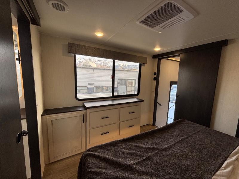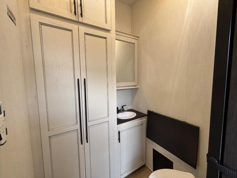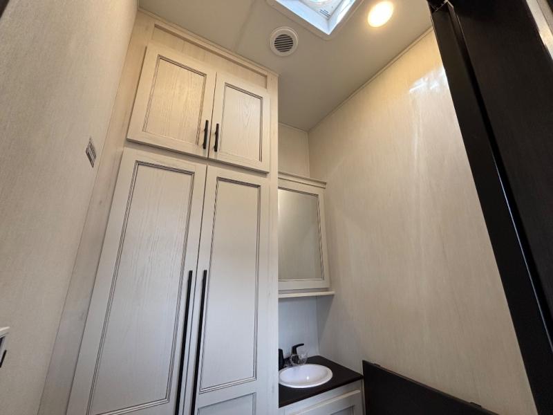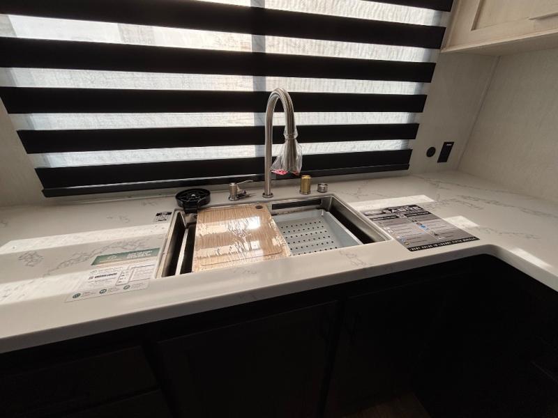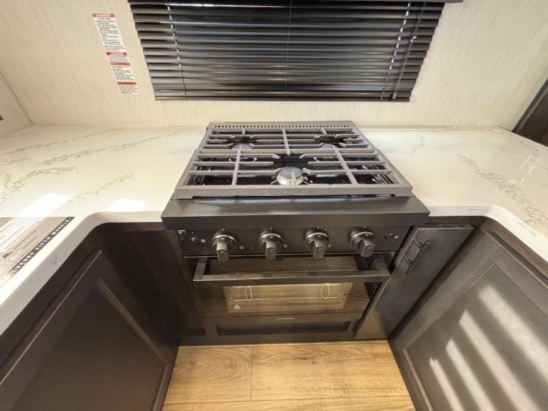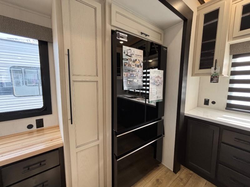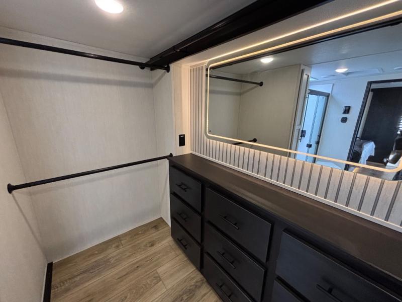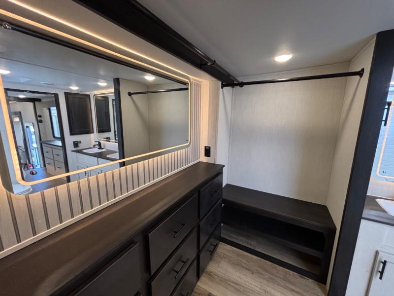 Get ready to elevate your travels to new heights with this show-stopping fifth wheel, designed for thrill-seekers. The rear kitchen is a culinary powerhouse, featuring a spacious layout, overhead cabinets, ample countertop, three-burner cooktop, microwave, oversized fridge, and pantry. In the living area section, the sectional sofa creates a warm and inviting space, perfect for socializing, relaxing, and making memories. The fireplace crackles with warmth, while the entertainment center provides endless entertainment options. Also, the dinette is a charming spot for meals, laughter, and storytelling. Unwind and recharge in style, with plenty of room to get ready for the day ahead, thanks to the full bath with dual sinks, ample dresser space, and a half-bath in the middle of this unit for added convenience. Moving to the main bedroom, the camper king bed is perfect for a restful night's sleep, and the dresser with hidden storage keeps your belongings organized, while the projector above the dresser adds a touch of magic to movie nights.