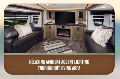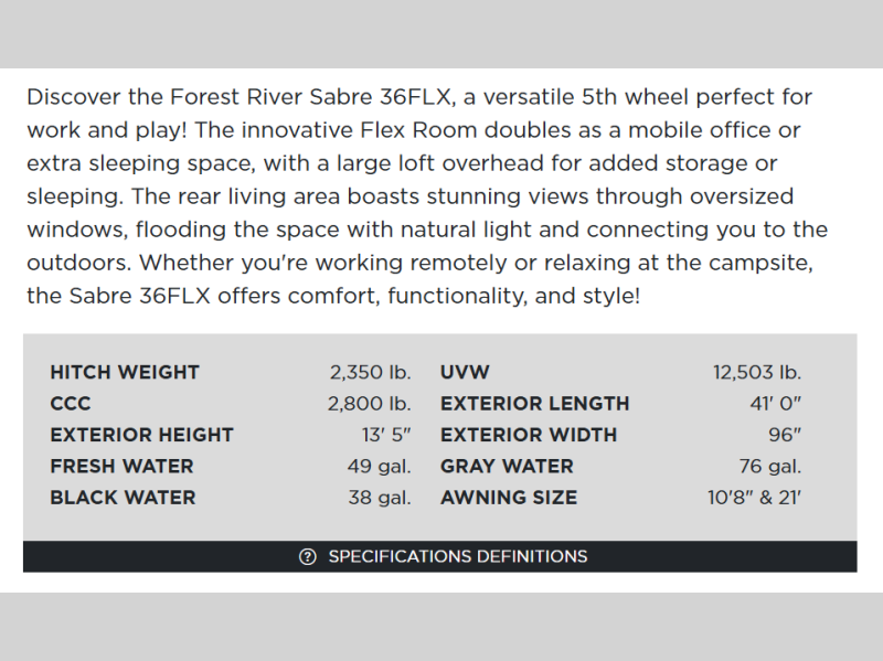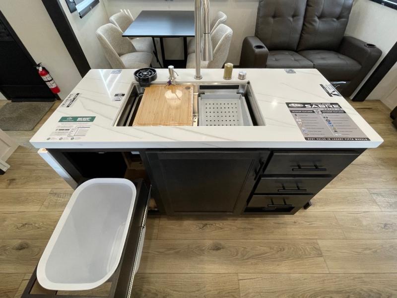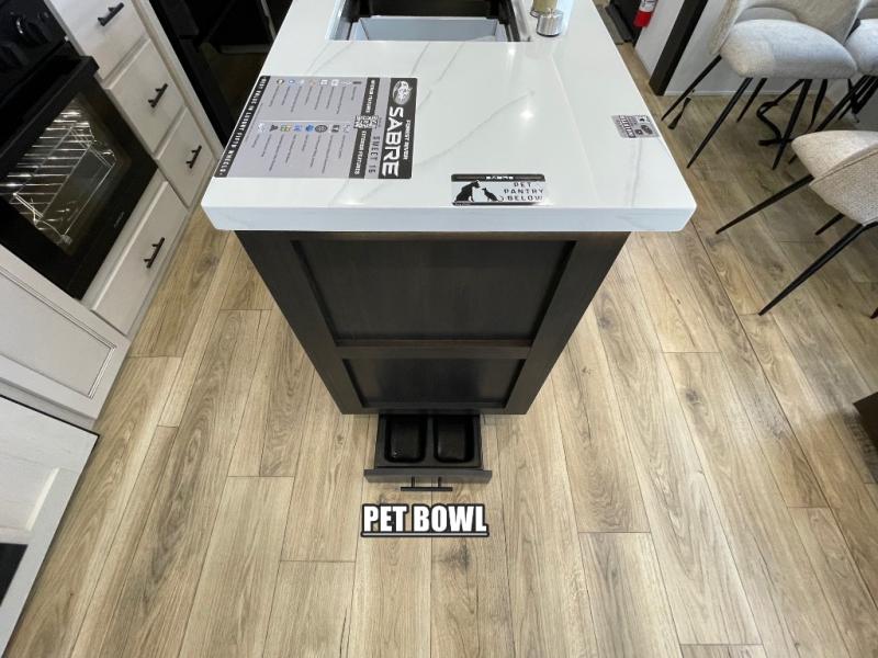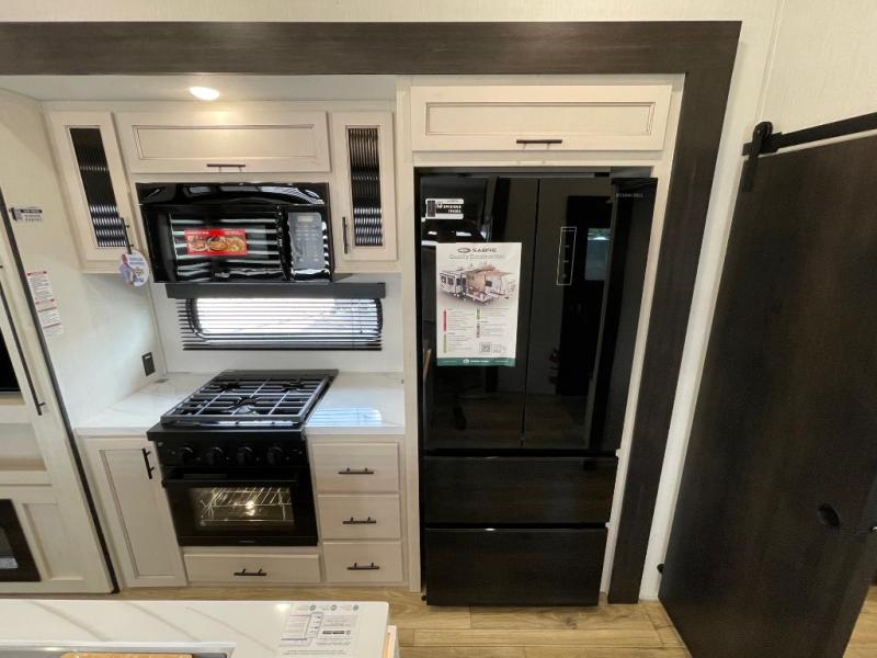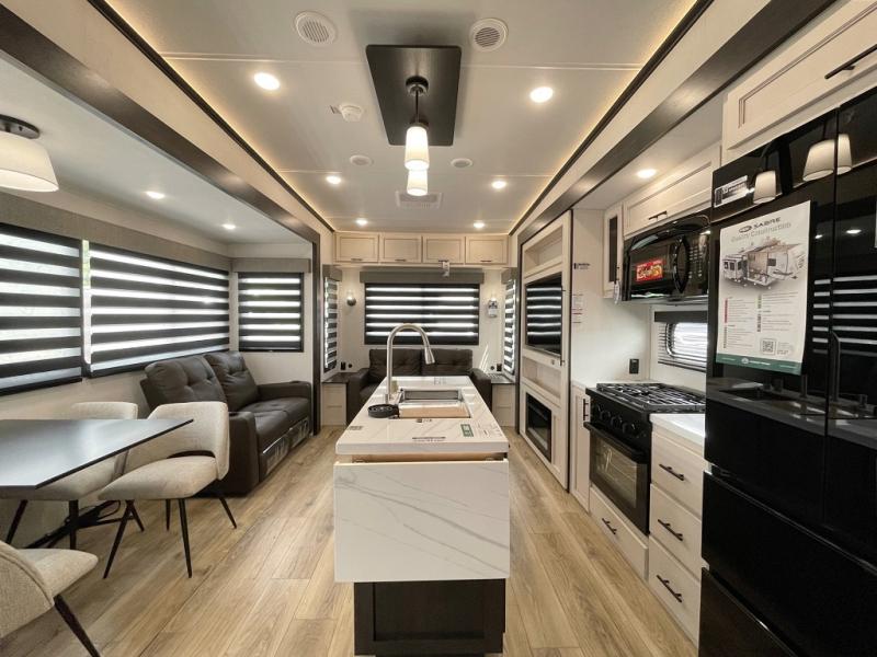 You will experience luxurious camping trips at an affordable price with any one of these Forest River Cherokee Sabre fifth wheels! These models are durable and ready to travel anytime of the year thanks to features like the high-gloss gel-coat front cap with LED lighting, the PVC roof membrane, and the forced air underbelly with enclosed gate valves. The electric auto-leveling system makes setting up easy and safe, and the adjustable power awning with LED lighting will create an inviting outdoor living space. Each model includes a universal docking station which includes a black tank flush and an outside shower, and adjustable stable steps for you to enter and exit the unit safely. Inside, you will love the design of the ambient accent lighting in the living area, the real wood lumbercore cabinetry, and the linoleum flooring!