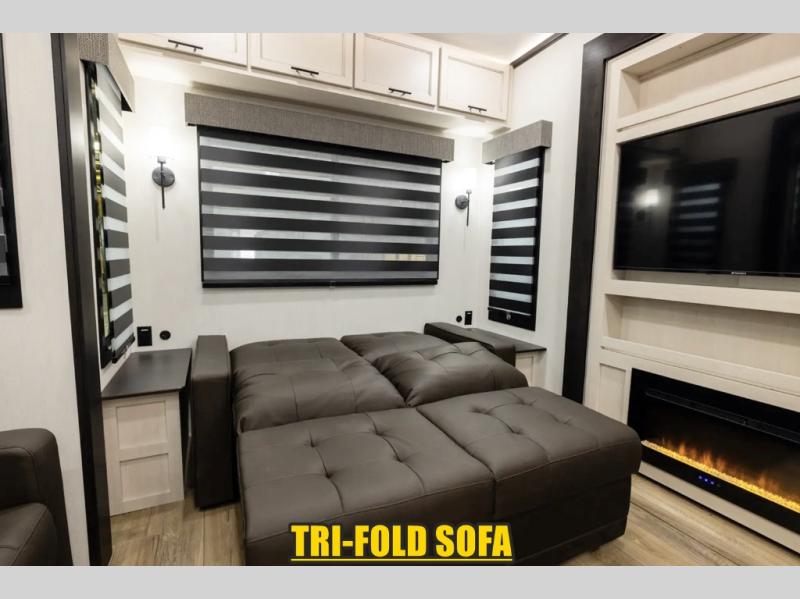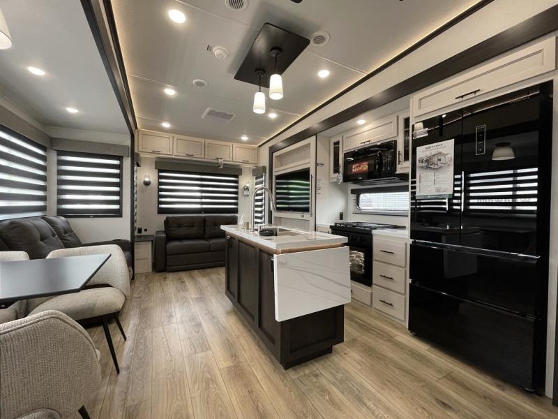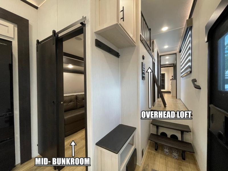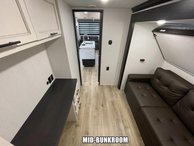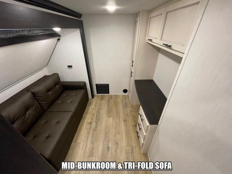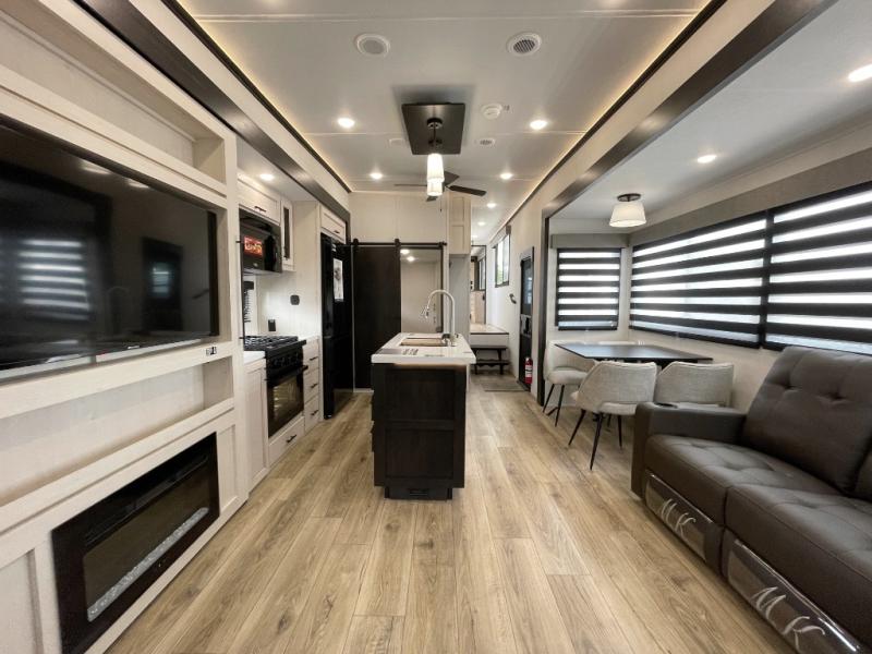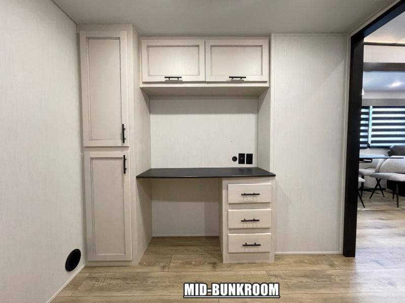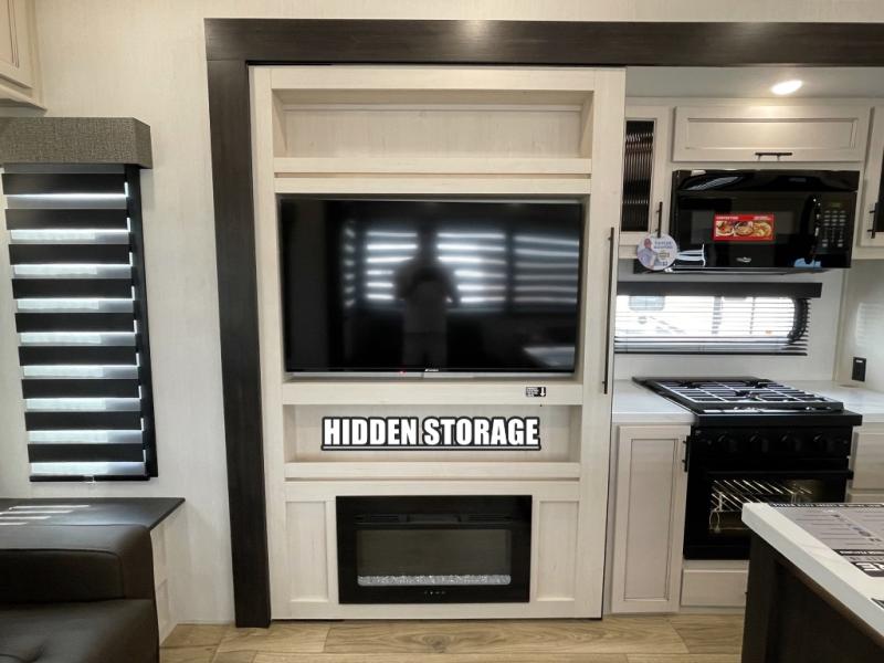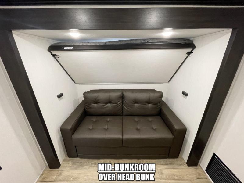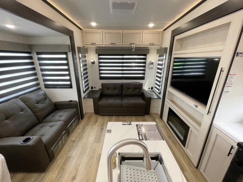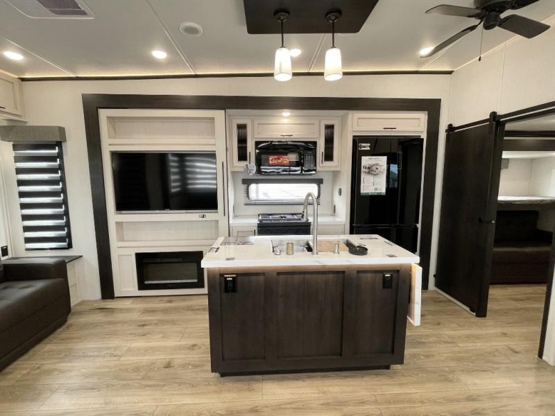 There is much to love in this fifth wheel! Starting with the second bedroom which has a slide that houses a flip-up bunk above a tri-fold sofa across from a desk with drawers, a drop zone, and a wardrobe, plus above all of that is a storage/bunk loft. The rear living area includes a tri-fold sofa, a TV with a hidden pantry behind, and theater seating for two making this space another area at night for guests. In the morning, you can prepare breakfast on the kitchen island, then dine together at the versatile dinette/desk. The full bath will allow you to stay clean throughout your trip, and you'll feel right at home in the front private bedroom with a camper king bed, a dresser, and front wardrobe. Outside, a kitchen and two power awnings create an inviting space!