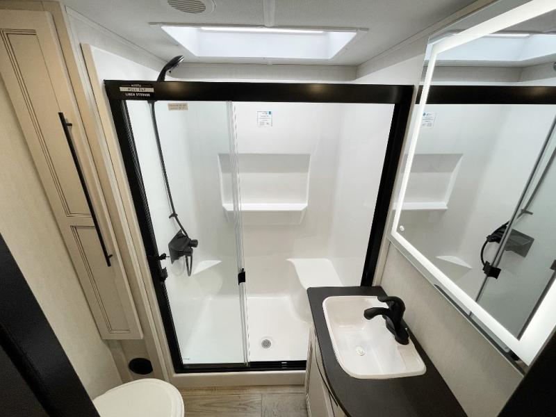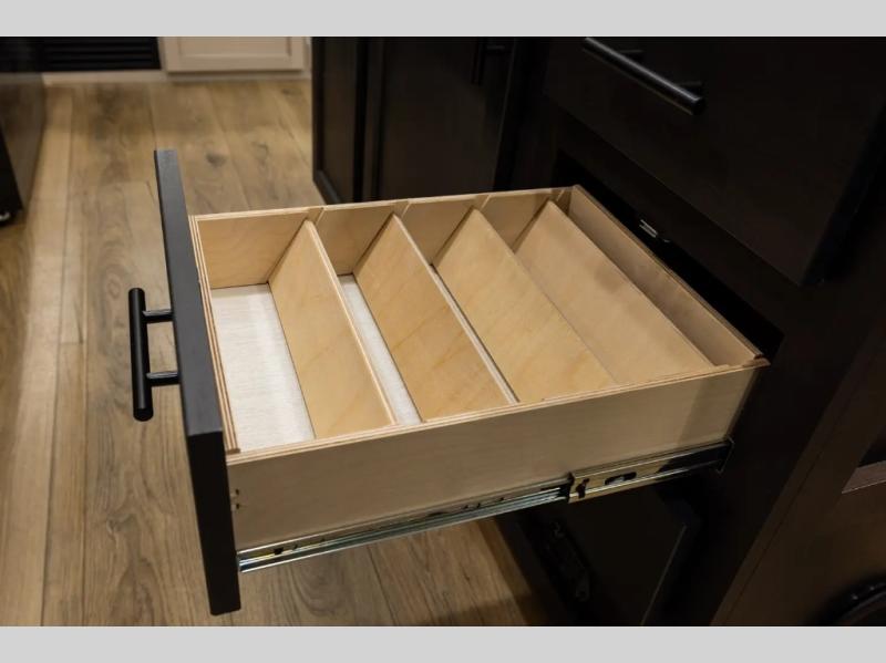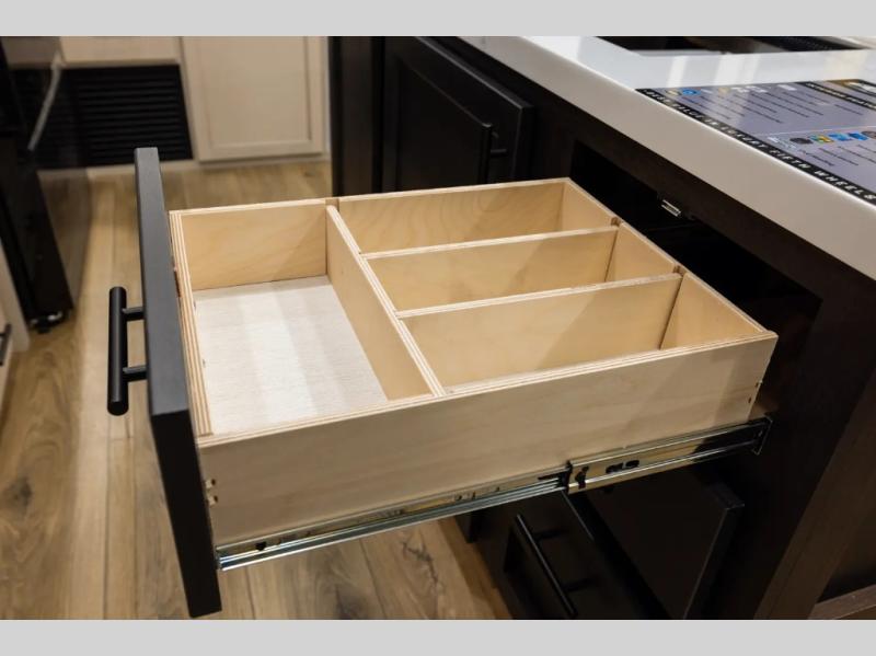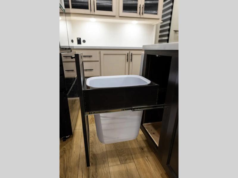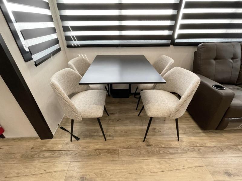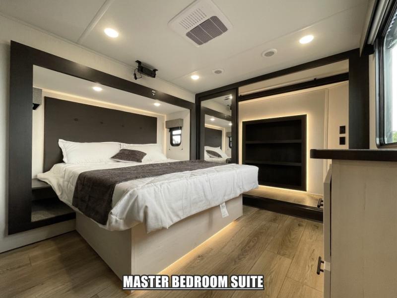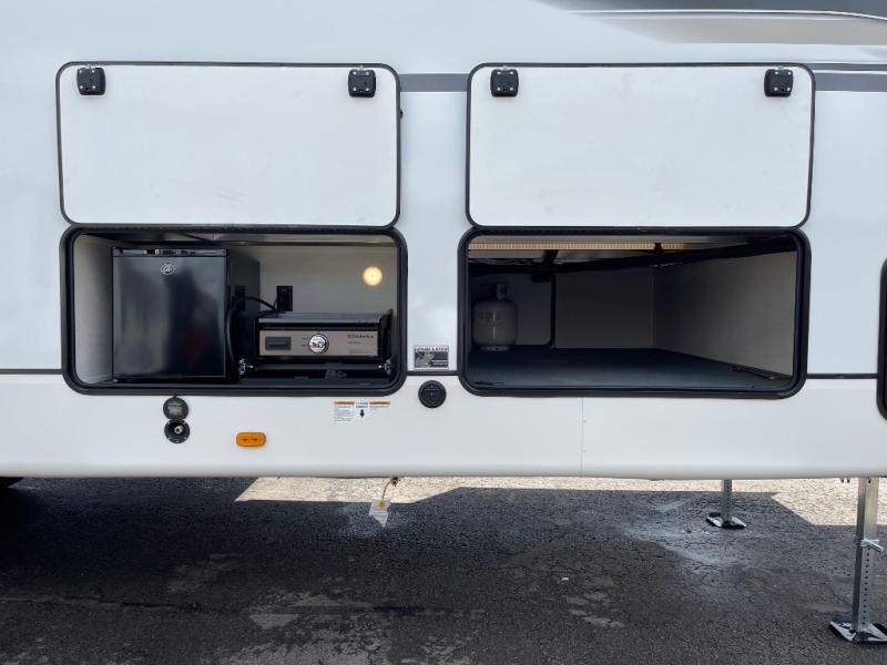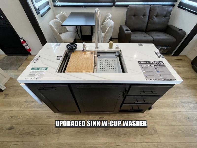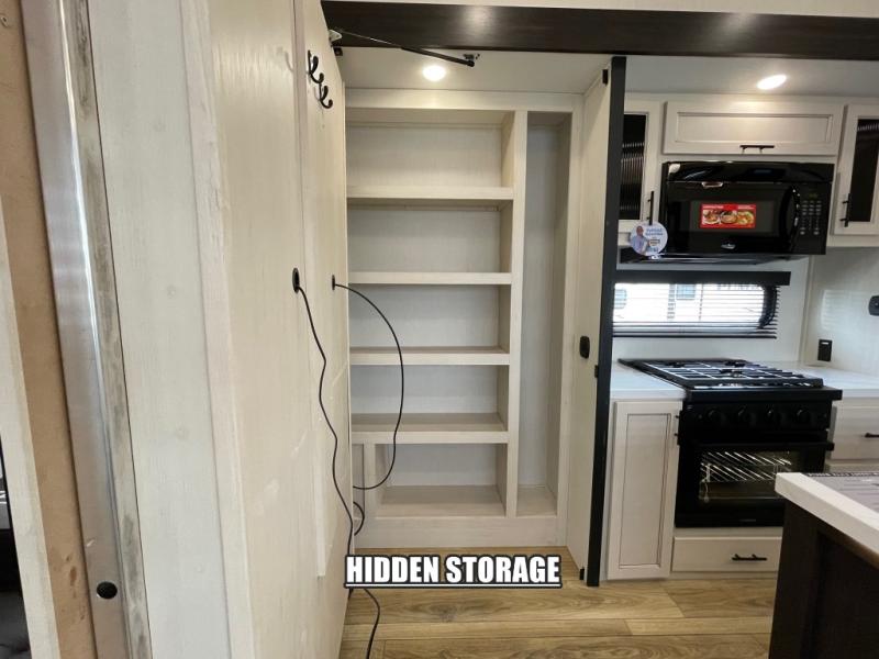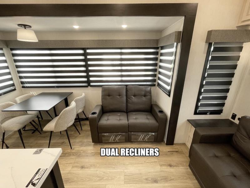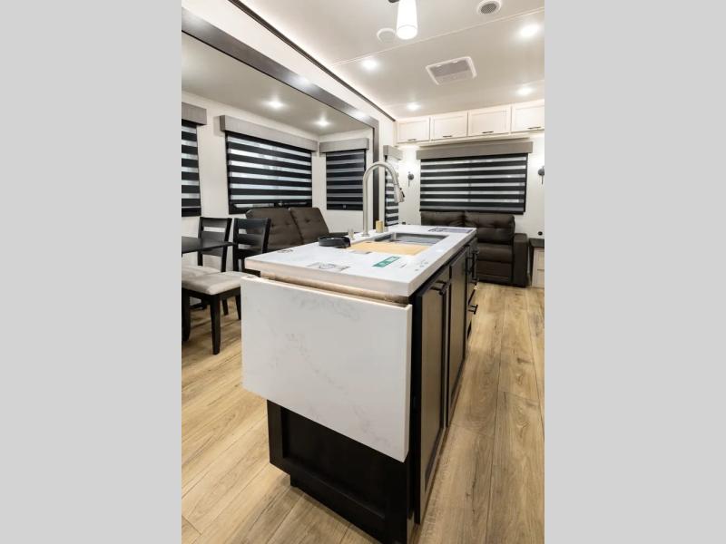 There is much to love in this fifth wheel! Starting with the second bedroom which has a slide that houses a flip-up bunk above a tri-fold sofa across from a desk with drawers, a drop zone, and a wardrobe, plus above all of that is a storage/bunk loft. The rear living area includes a tri-fold sofa, a TV with a hidden pantry behind, and theater seating for two making this space another area at night for guests. In the morning, you can prepare breakfast on the kitchen island, then dine together at the versatile dinette/desk. The full bath will allow you to stay clean throughout your trip, and you'll feel right at home in the front private bedroom with a camper king bed, a dresser, and front wardrobe. Outside, a kitchen and two power awnings create an inviting space!