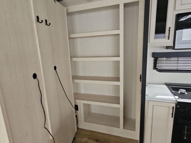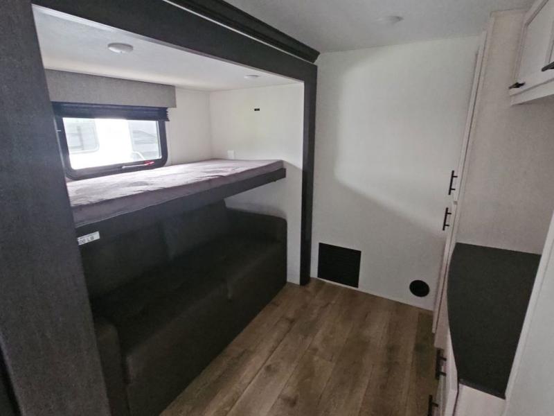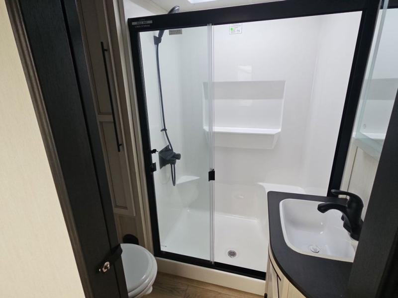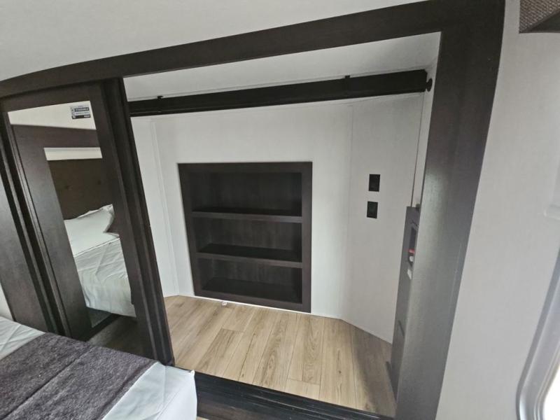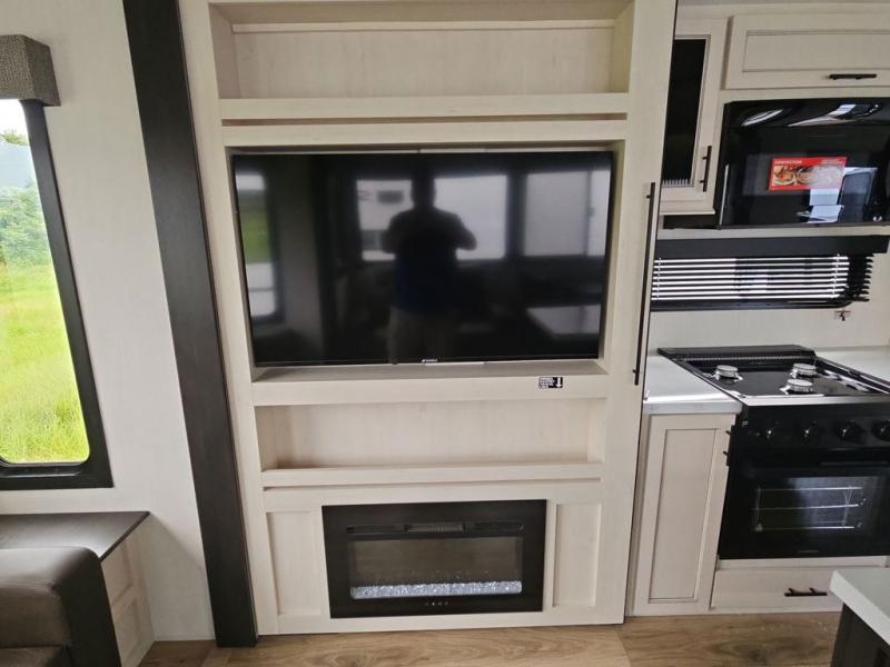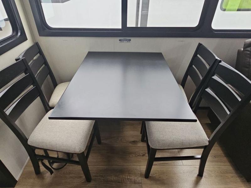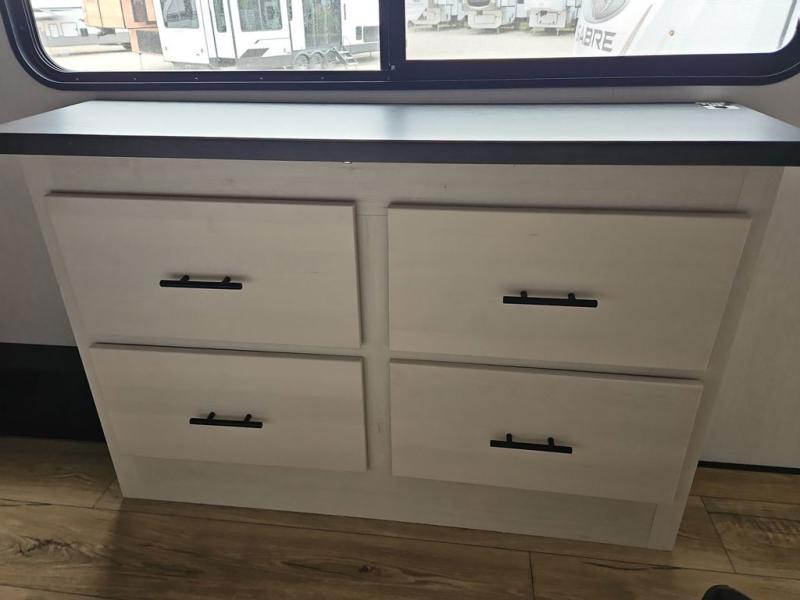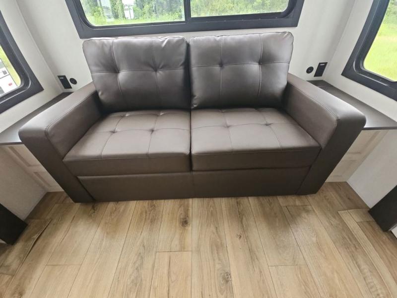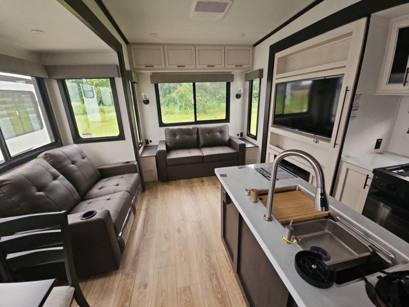There is much to love in this fifth wheel! Starting with the second bedroom which has a slide that houses a flip-up bunk above a tri-fold sofa across from a desk with drawers, a drop zone, and a wardrobe, plus above all of that is a storage/bunk loft. The rear living area includes a tri-fold sofa, a TV with a hidden pantry behind, and theater seating for two making this space another area at night for guests. In the morning, you can prepare breakfast on the kitchen island, then dine together at the versatile dinette/desk. The full bath will allow you to stay clean throughout your trip, and you'll feel right at home in the front private bedroom with a camper king bed, a dresser, and front wardrobe. Outside, a kitchen and two power awnings create an inviting space!