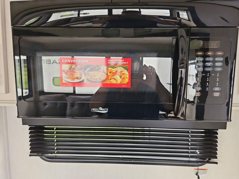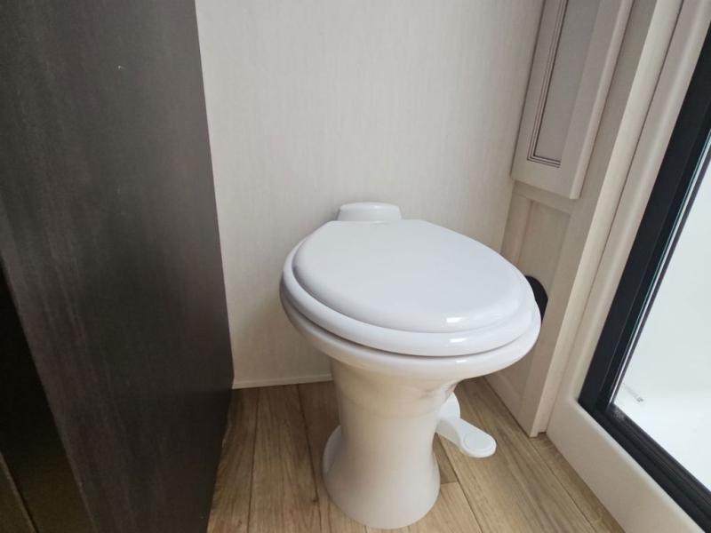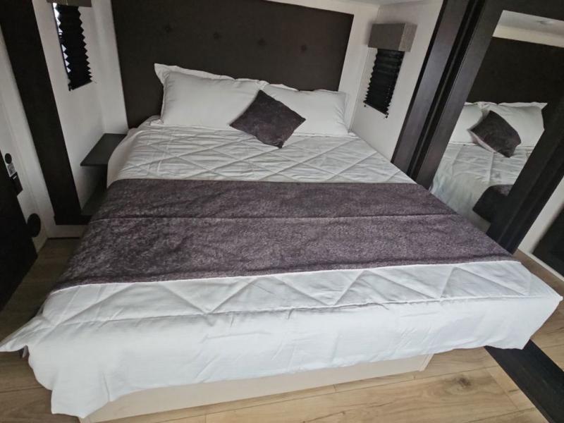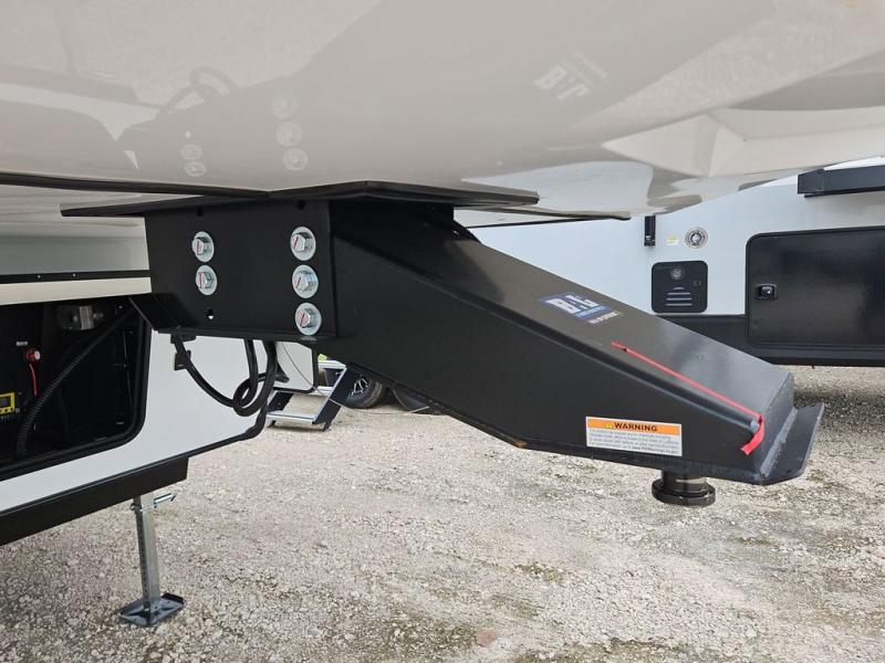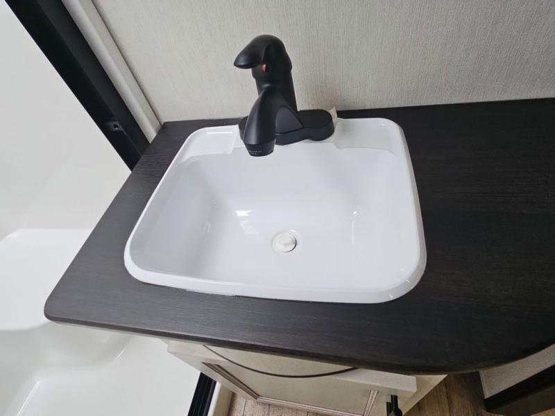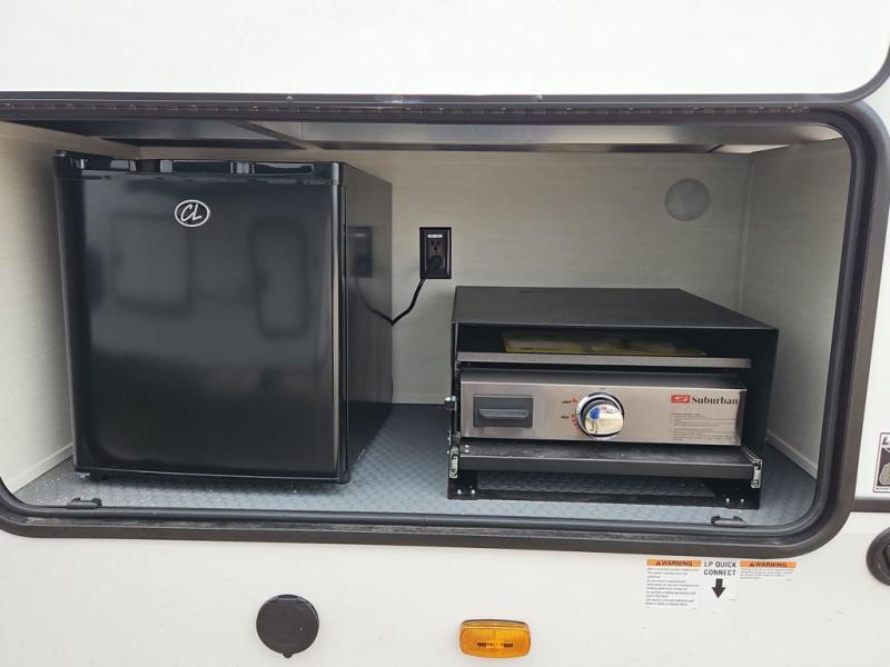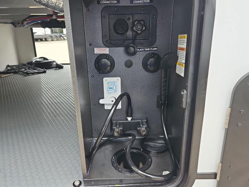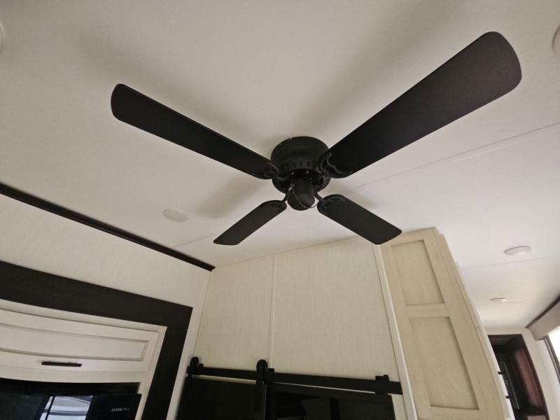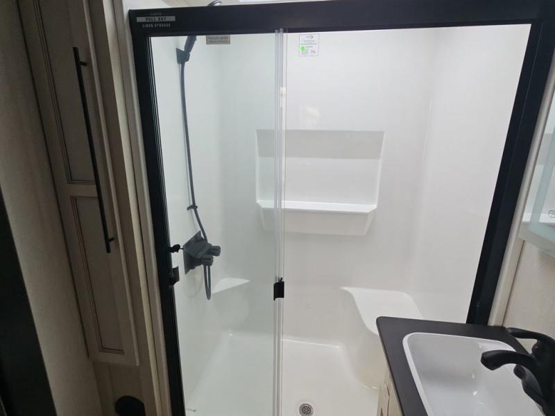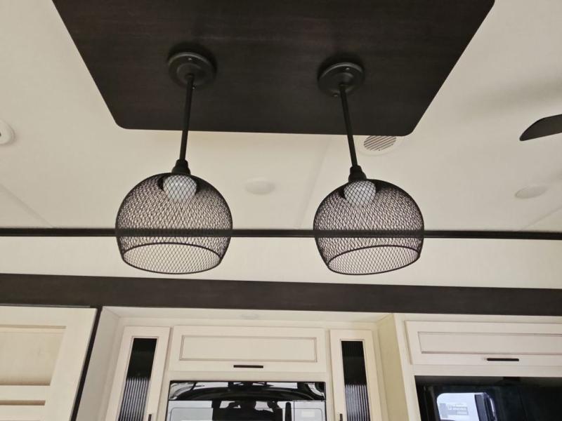 There is much to love in this fifth wheel! Starting with the second bedroom which has a slide that houses a flip-up bunk above a tri-fold sofa across from a desk with drawers, a drop zone, and a wardrobe, plus above all of that is a storage/bunk loft. The rear living area includes a tri-fold sofa, a TV with a hidden pantry behind, and theater seating for two making this space another area at night for guests. In the morning, you can prepare breakfast on the kitchen island, then dine together at the versatile dinette/desk. The full bath will allow you to stay clean throughout your trip, and you'll feel right at home in the front private bedroom with a camper king bed, a dresser, and front wardrobe. Outside, a kitchen and two power awnings create an inviting space!