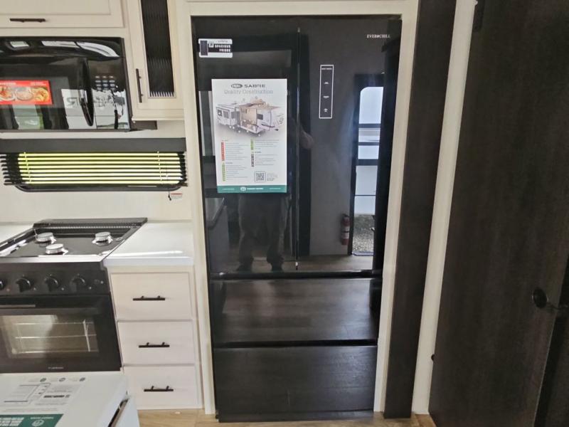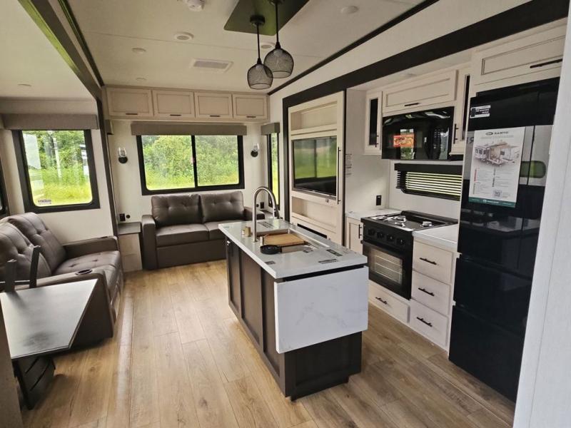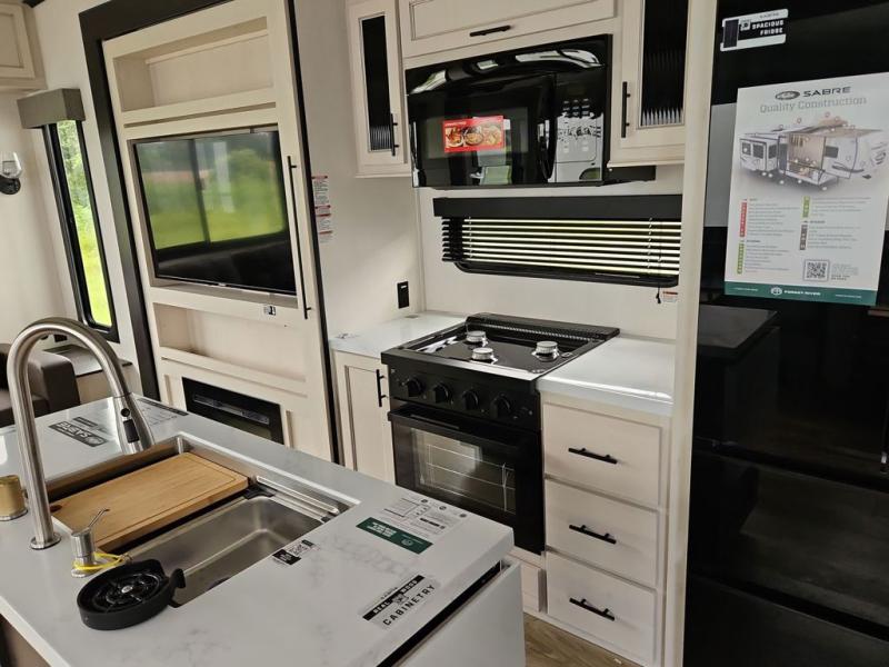 You will experience luxurious camping trips at an affordable price with any one of these Forest River Cherokee Sabre fifth wheels! These models are durable and ready to travel anytime of the year thanks to features like the high-gloss gel-coat front cap with LED lighting, the PVC roof membrane, and the forced air underbelly with enclosed gate valves. The electric auto-leveling system makes setting up easy and safe, and the adjustable power awning with LED lighting will create an inviting outdoor living space. Each model includes a universal docking station which includes a black tank flush and an outside shower, and adjustable stable steps for you to enter and exit the unit safely. Inside, you will love the design of the ambient accent lighting in the living area, the real wood lumbercore cabinetry, and the linoleum flooring!