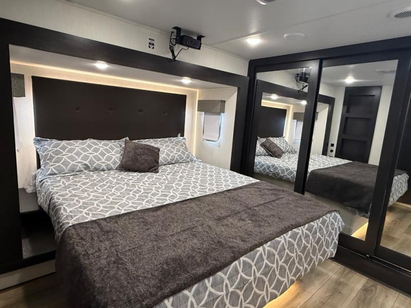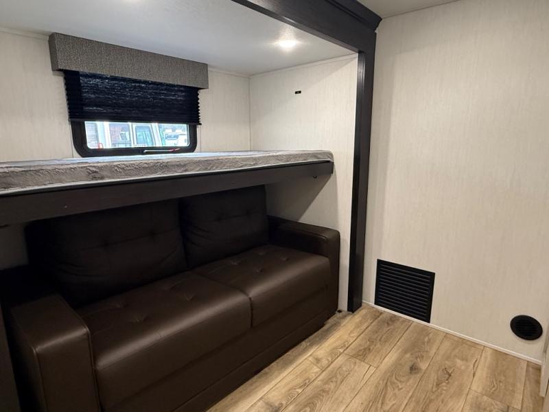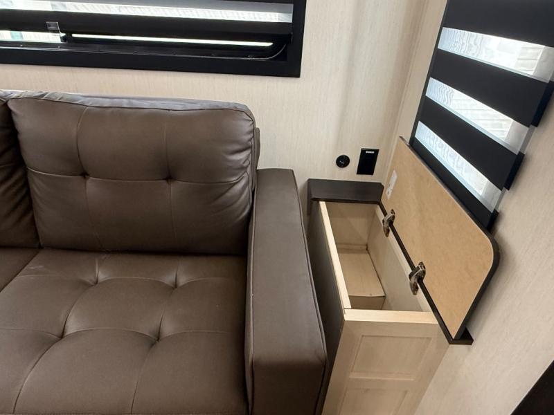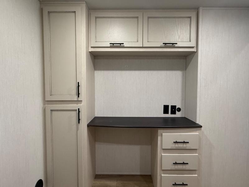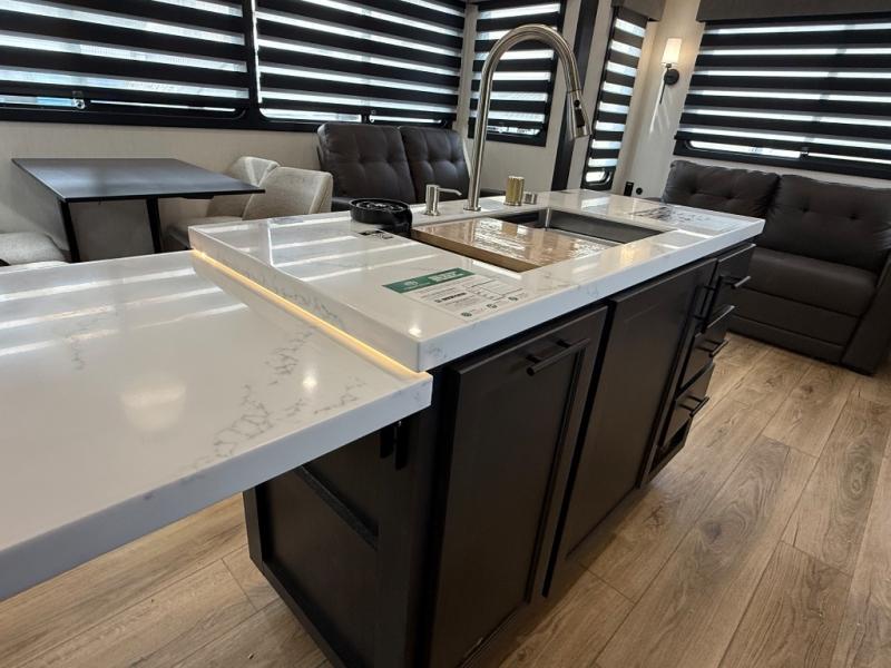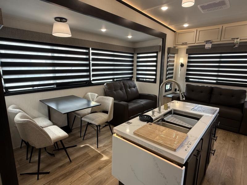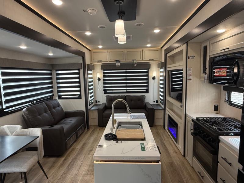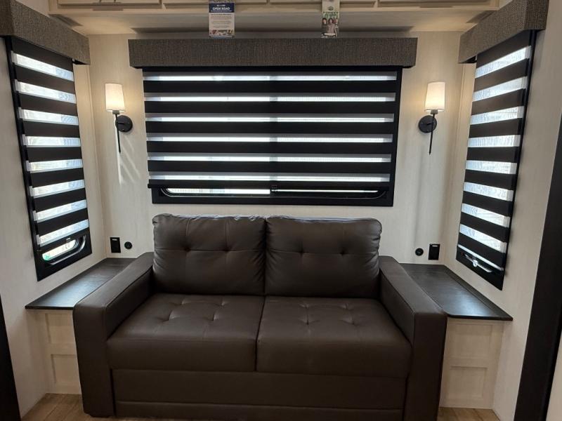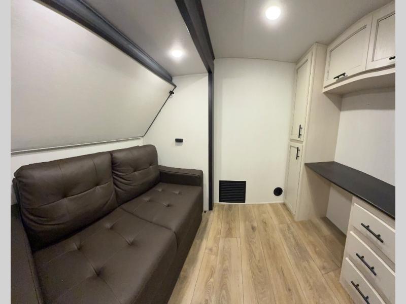 There is much to love in this fifth wheel! Starting with the second bedroom which has a slide that houses a flip-up bunk above a tri-fold sofa across from a desk with drawers, a drop zone, and a wardrobe, plus above all of that is a storage/bunk loft. The rear living area includes a tri-fold sofa, a TV with a hidden pantry behind, and theater seating for two making this space another area at night for guests. In the morning, you can prepare breakfast on the kitchen island, then dine together at the versatile dinette/desk. The full bath will allow you to stay clean throughout your trip, and you'll feel right at home in the front private bedroom with a camper king bed, a dresser, and front wardrobe. Outside, a kitchen and two power awnings create an inviting space!