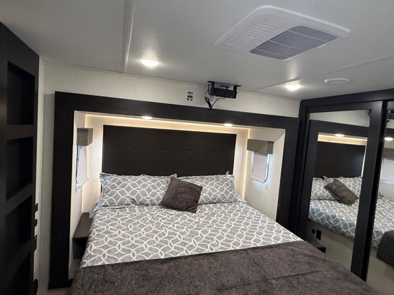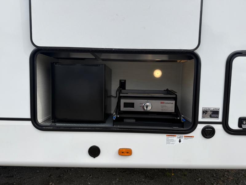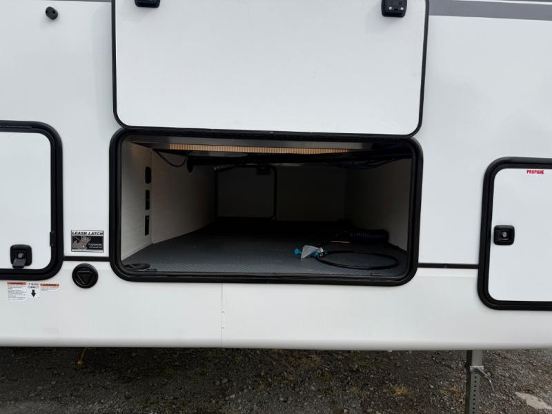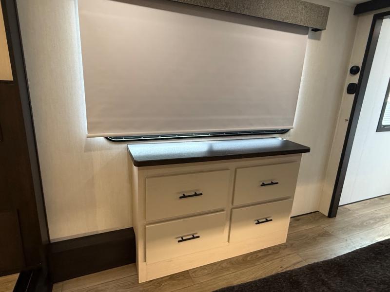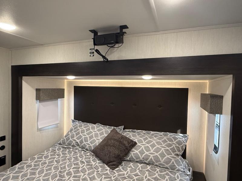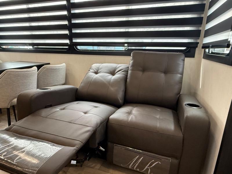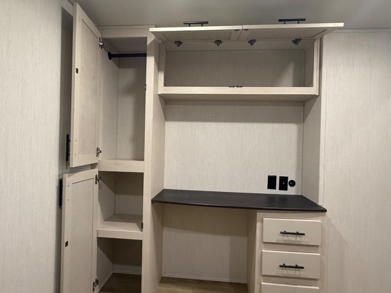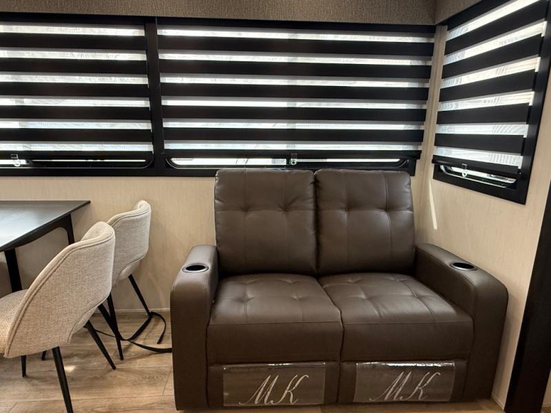 There is much to love in this fifth wheel! Starting with the second bedroom which has a slide that houses a flip-up bunk above a tri-fold sofa across from a desk with drawers, a drop zone, and a wardrobe, plus above all of that is a storage/bunk loft. The rear living area includes a tri-fold sofa, a TV with a hidden pantry behind, and theater seating for two making this space another area at night for guests. In the morning, you can prepare breakfast on the kitchen island, then dine together at the versatile dinette/desk. The full bath will allow you to stay clean throughout your trip, and you'll feel right at home in the front private bedroom with a camper king bed, a dresser, and front wardrobe. Outside, a kitchen and two power awnings create an inviting space!