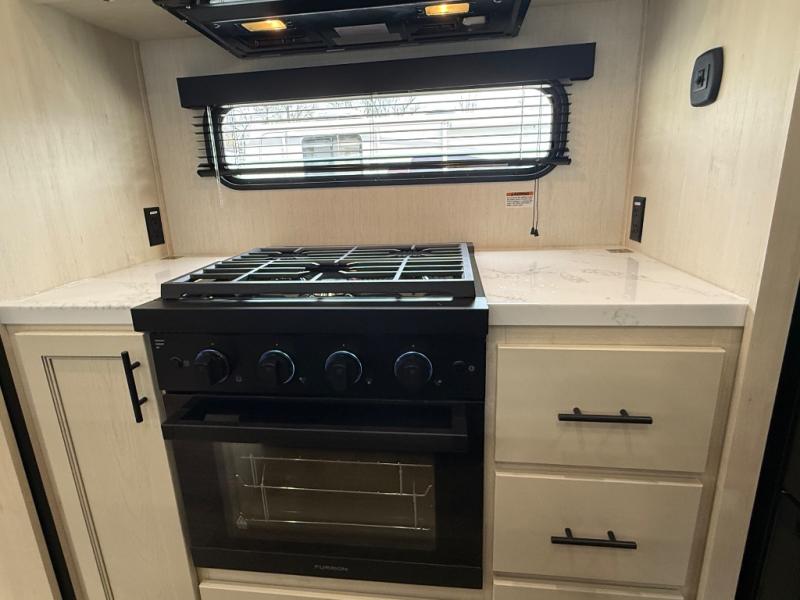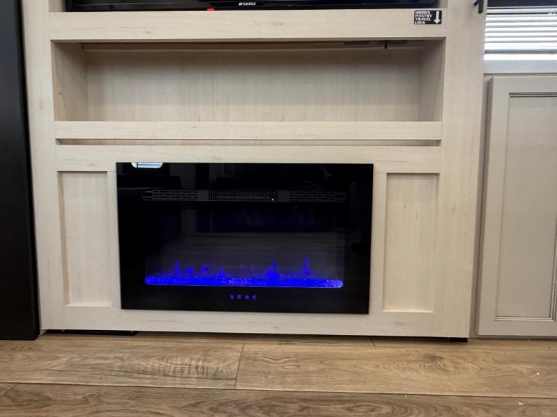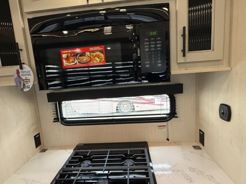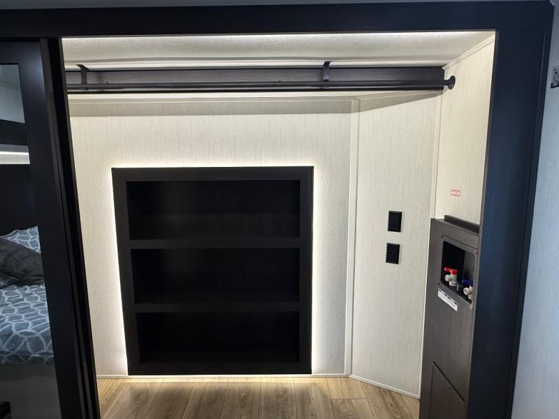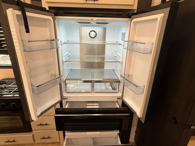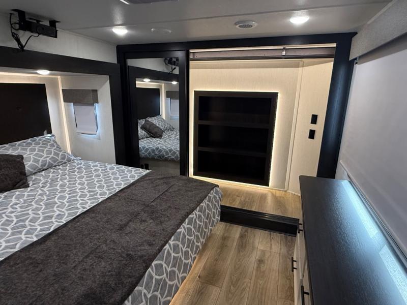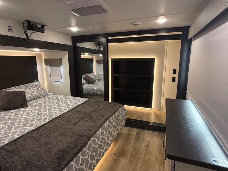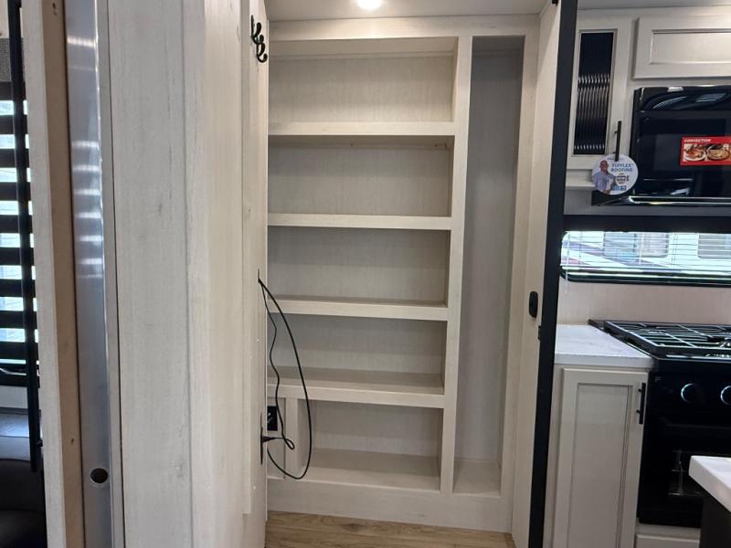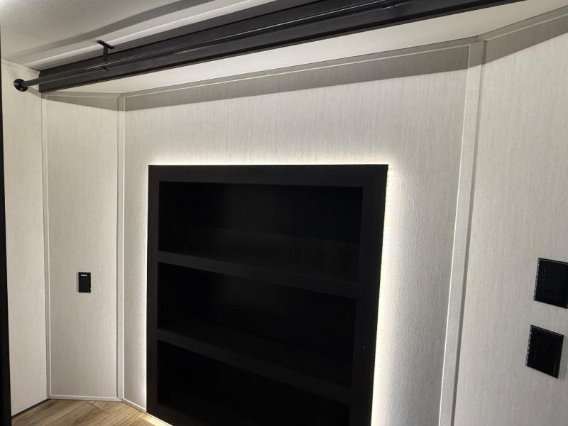 There is much to love in this fifth wheel! Starting with the second bedroom which has a slide that houses a flip-up bunk above a tri-fold sofa across from a desk with drawers, a drop zone, and a wardrobe, plus above all of that is a storage/bunk loft. The rear living area includes a tri-fold sofa, a TV with a hidden pantry behind, and theater seating for two making this space another area at night for guests. In the morning, you can prepare breakfast on the kitchen island, then dine together at the versatile dinette/desk. The full bath will allow you to stay clean throughout your trip, and you'll feel right at home in the front private bedroom with a camper king bed, a dresser, and front wardrobe. Outside, a kitchen and two power awnings create an inviting space!