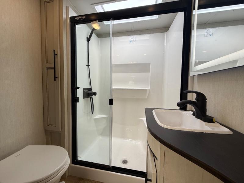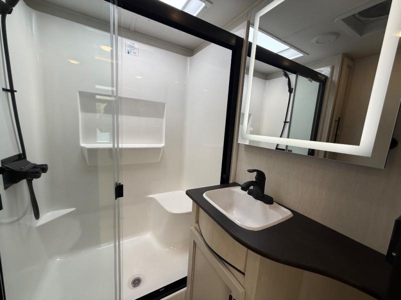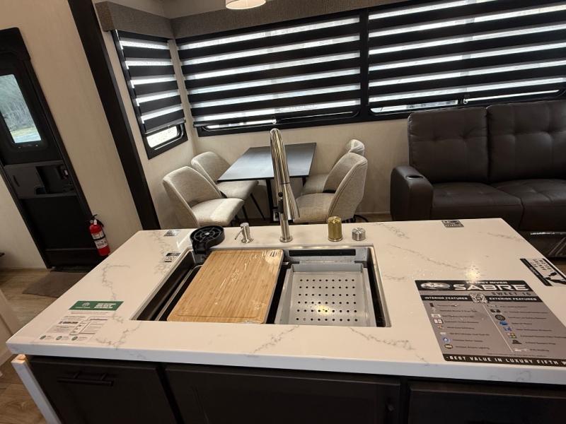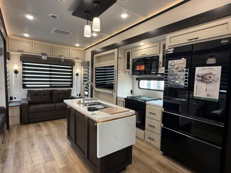 You will experience luxurious camping trips at an affordable price with any one of these Forest River Cherokee Sabre fifth wheels! These models are durable and ready to travel anytime of the year thanks to features like the high-gloss gel-coat front cap with LED lighting, the PVC roof membrane, and the forced air underbelly with enclosed gate valves. The electric auto-leveling system makes setting up easy and safe, and the adjustable power awning with LED lighting will create an inviting outdoor living space. Each model includes a universal docking station which includes a black tank flush and an outside shower, and adjustable stable steps for you to enter and exit the unit safely. Inside, you will love the design of the ambient accent lighting in the living area, the real wood lumbercore cabinetry, and the linoleum flooring!