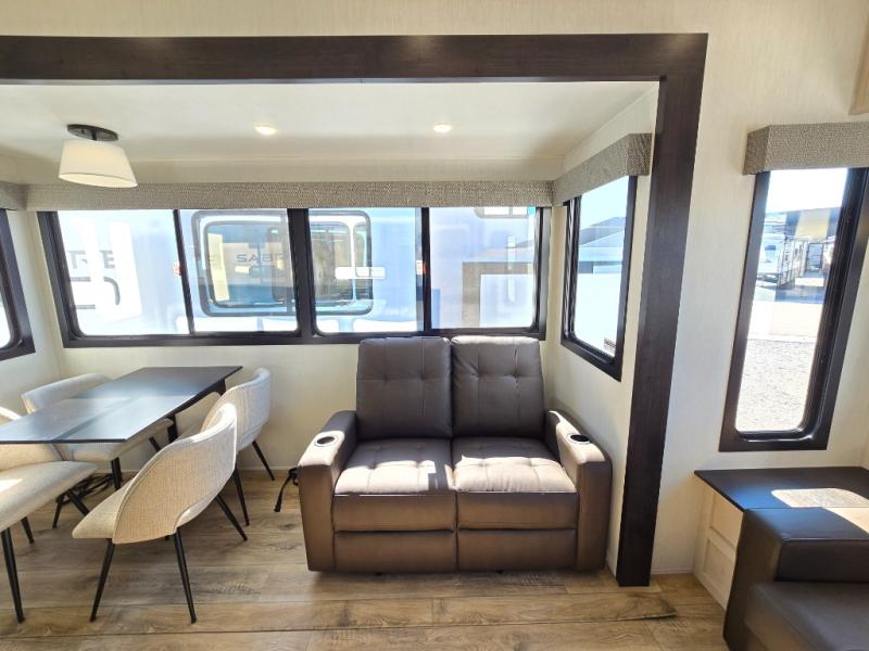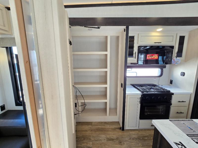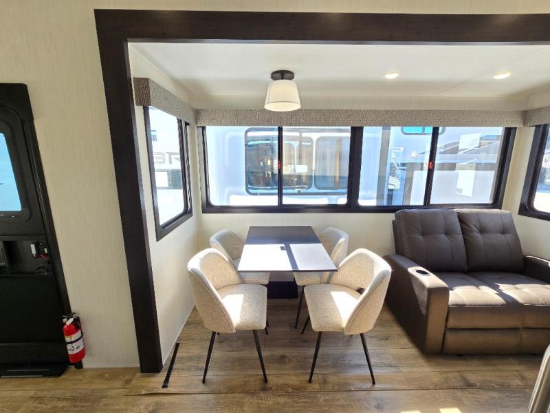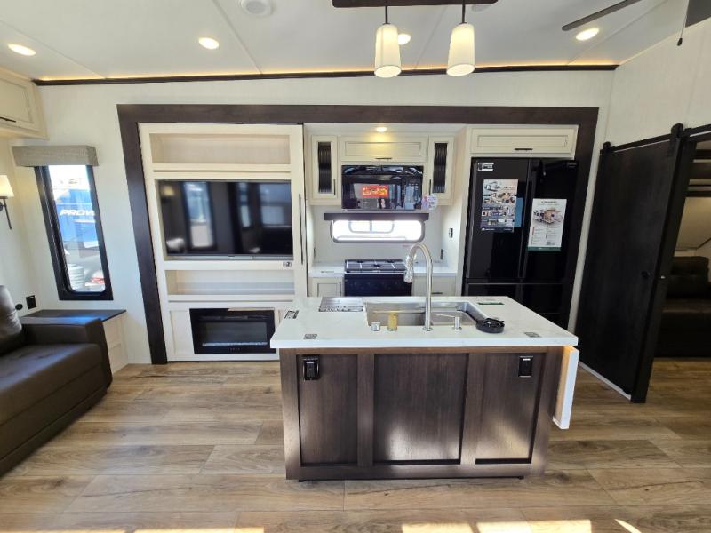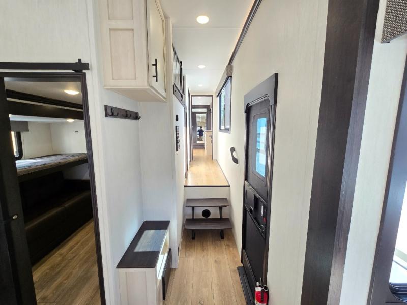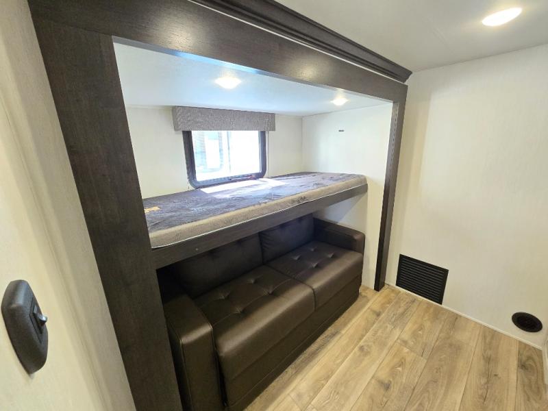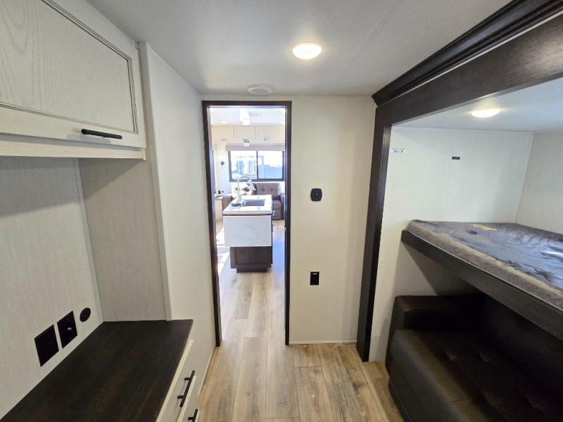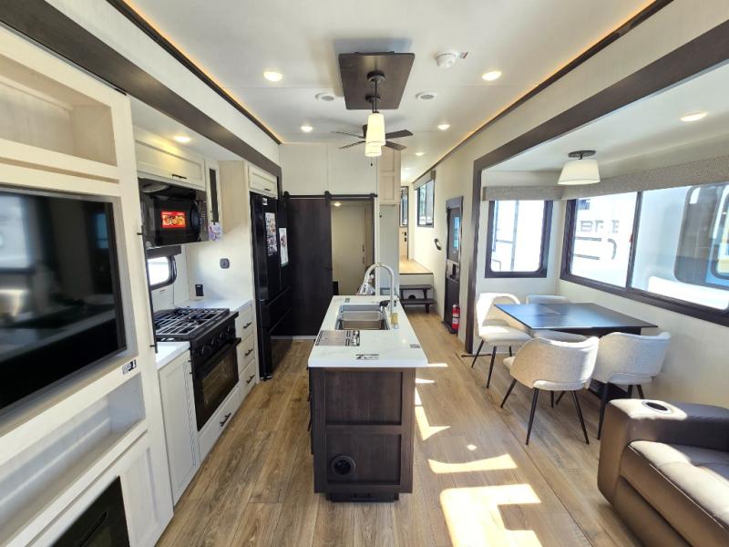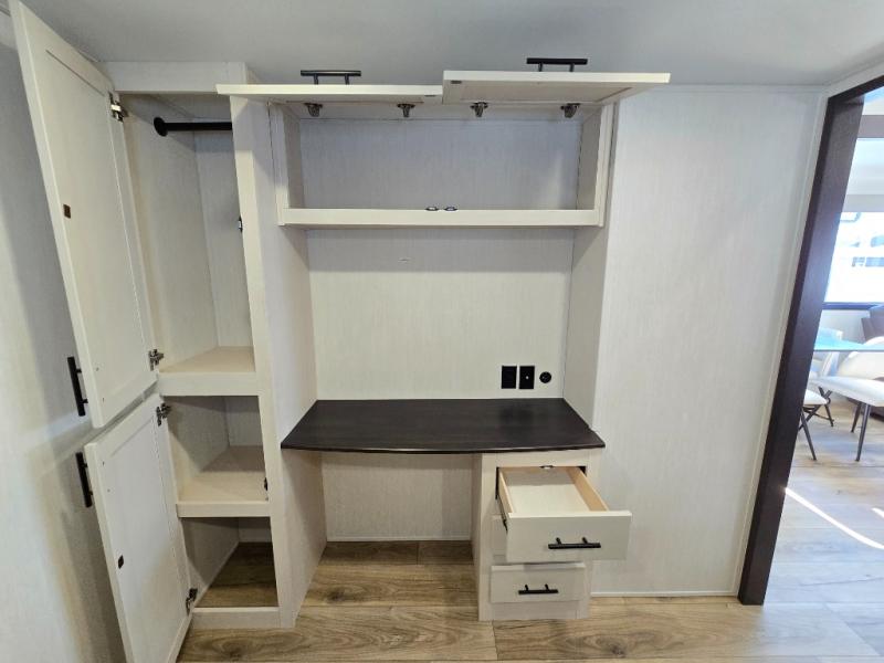 There is much to love in this fifth wheel! Starting with the second bedroom which has a slide that houses a flip-up bunk above a tri-fold sofa across from a desk with drawers, a drop zone, and a wardrobe, plus above all of that is a storage/bunk loft. The rear living area includes a tri-fold sofa, a TV with a hidden pantry behind, and theater seating for two making this space another area at night for guests. In the morning, you can prepare breakfast on the kitchen island, then dine together at the versatile dinette/desk. The full bath will allow you to stay clean throughout your trip, and you'll feel right at home in the front private bedroom with a camper king bed, a dresser, and front wardrobe. Outside, a kitchen and two power awnings create an inviting space!