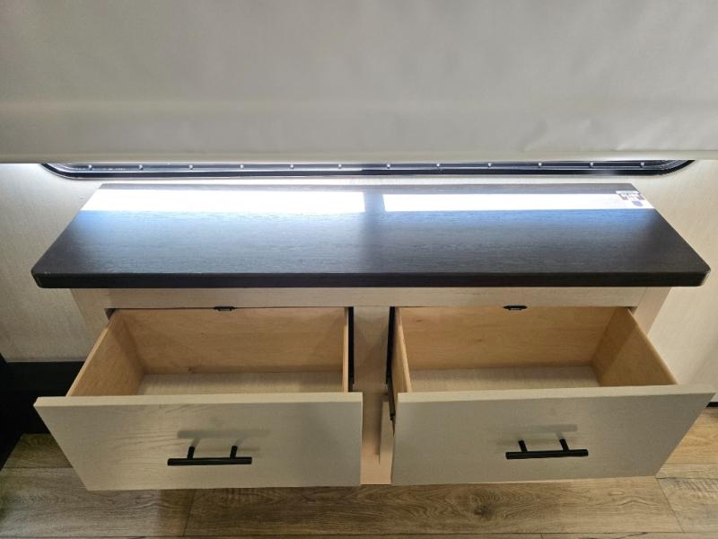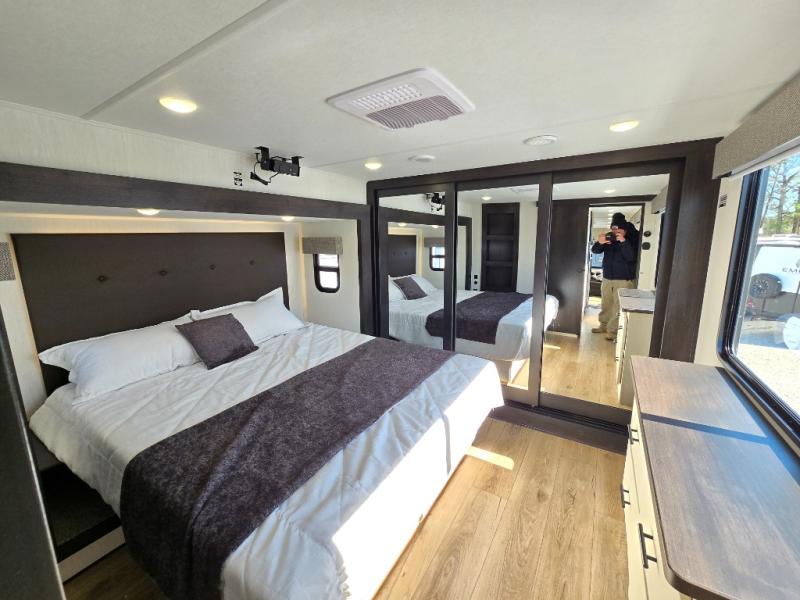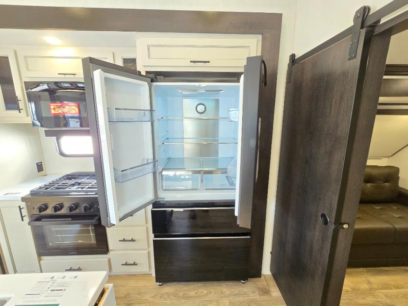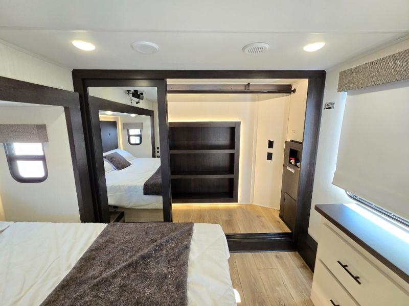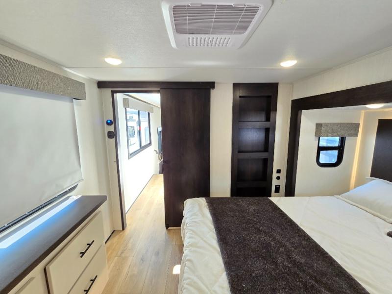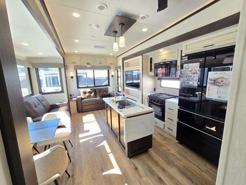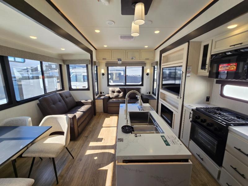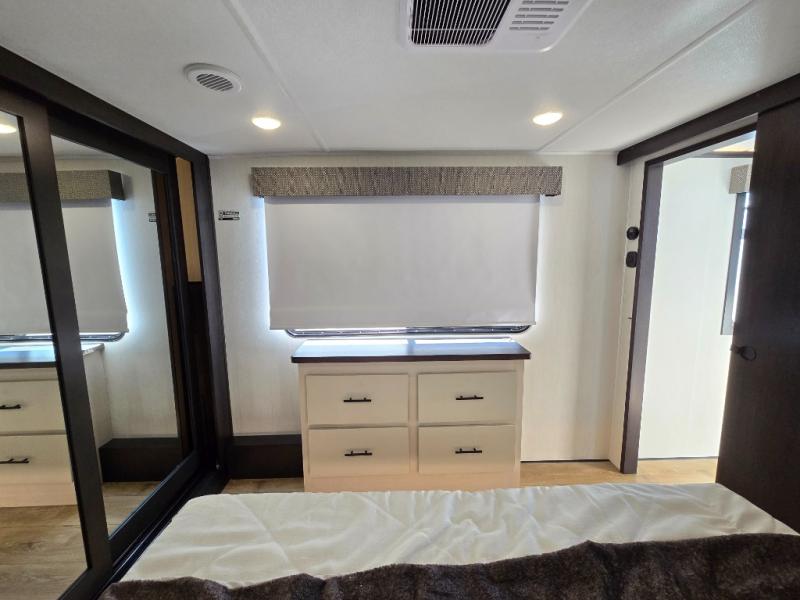 There is much to love in this fifth wheel! Starting with the second bedroom which has a slide that houses a flip-up bunk above a tri-fold sofa across from a desk with drawers, a drop zone, and a wardrobe, plus above all of that is a storage/bunk loft. The rear living area includes a tri-fold sofa, a TV with a hidden pantry behind, and theater seating for two making this space another area at night for guests. In the morning, you can prepare breakfast on the kitchen island, then dine together at the versatile dinette/desk. The full bath will allow you to stay clean throughout your trip, and you'll feel right at home in the front private bedroom with a camper king bed, a dresser, and front wardrobe. Outside, a kitchen and two power awnings create an inviting space!