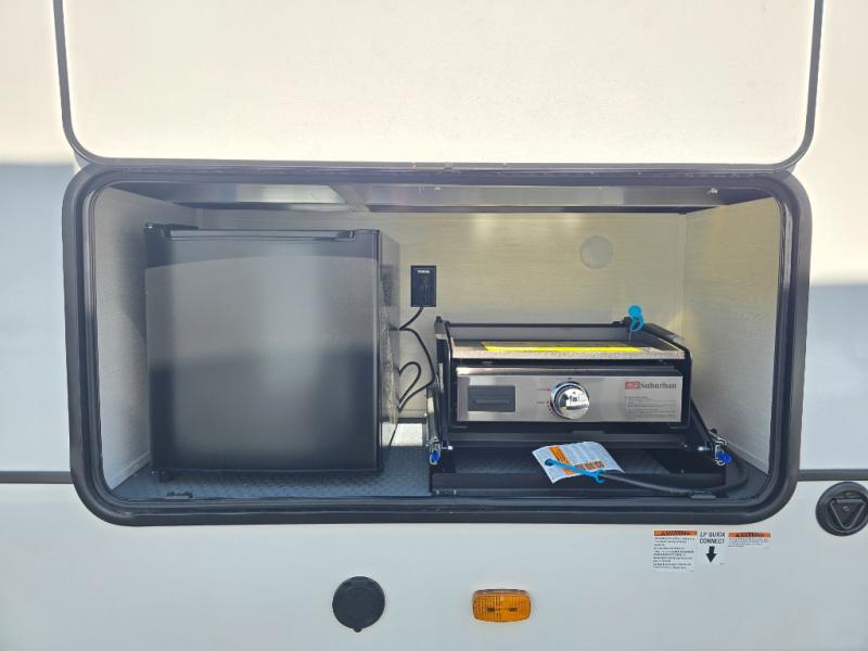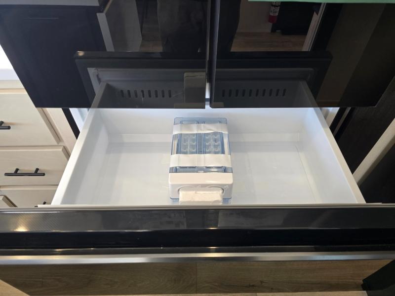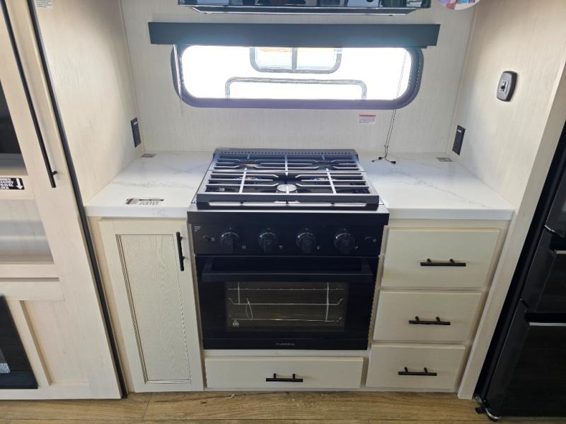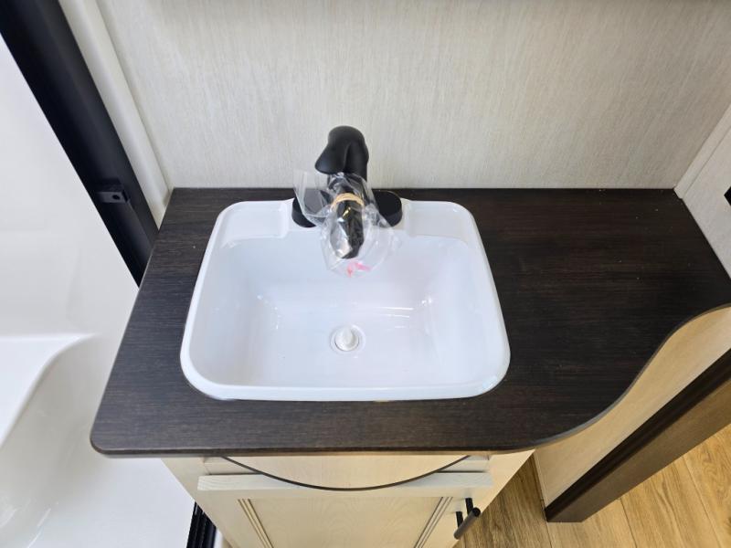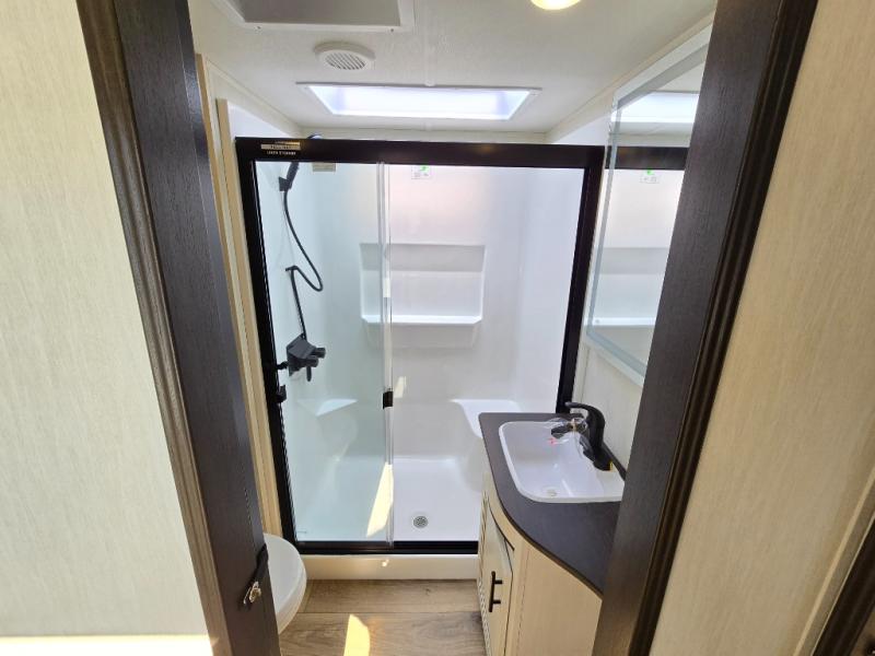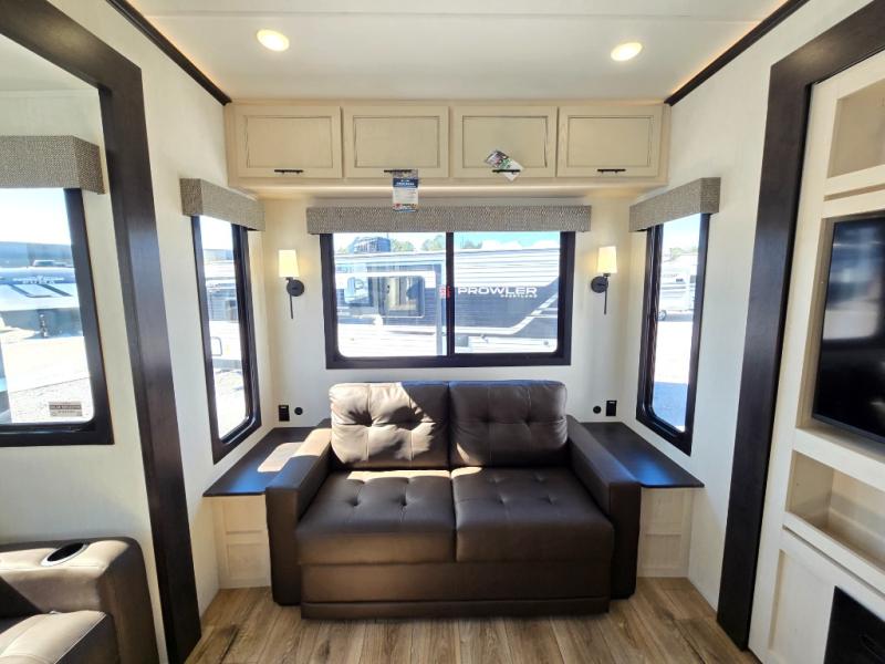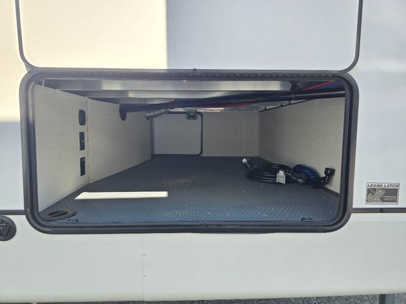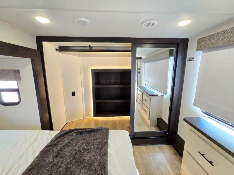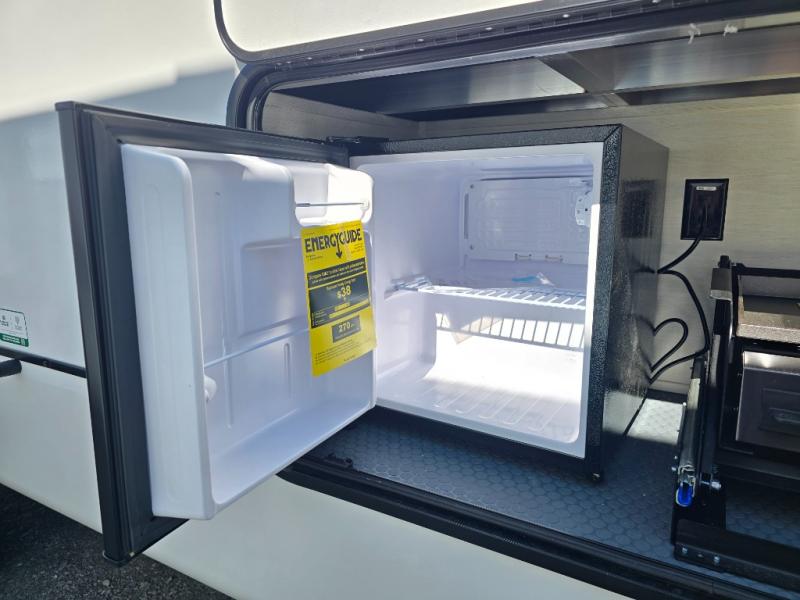 There is much to love in this fifth wheel! Starting with the second bedroom which has a slide that houses a flip-up bunk above a tri-fold sofa across from a desk with drawers, a drop zone, and a wardrobe, plus above all of that is a storage/bunk loft. The rear living area includes a tri-fold sofa, a TV with a hidden pantry behind, and theater seating for two making this space another area at night for guests. In the morning, you can prepare breakfast on the kitchen island, then dine together at the versatile dinette/desk. The full bath will allow you to stay clean throughout your trip, and you'll feel right at home in the front private bedroom with a camper king bed, a dresser, and front wardrobe. Outside, a kitchen and two power awnings create an inviting space!