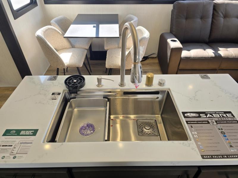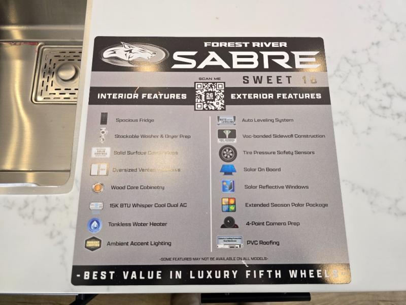 You will experience luxurious camping trips at an affordable price with any one of these Forest River Cherokee Sabre fifth wheels! These models are durable and ready to travel anytime of the year thanks to features like the high-gloss gel-coat front cap with LED lighting, the PVC roof membrane, and the forced air underbelly with enclosed gate valves. The electric auto-leveling system makes setting up easy and safe, and the adjustable power awning with LED lighting will create an inviting outdoor living space. Each model includes a universal docking station which includes a black tank flush and an outside shower, and adjustable stable steps for you to enter and exit the unit safely. Inside, you will love the design of the ambient accent lighting in the living area, the real wood lumbercore cabinetry, and the linoleum flooring!