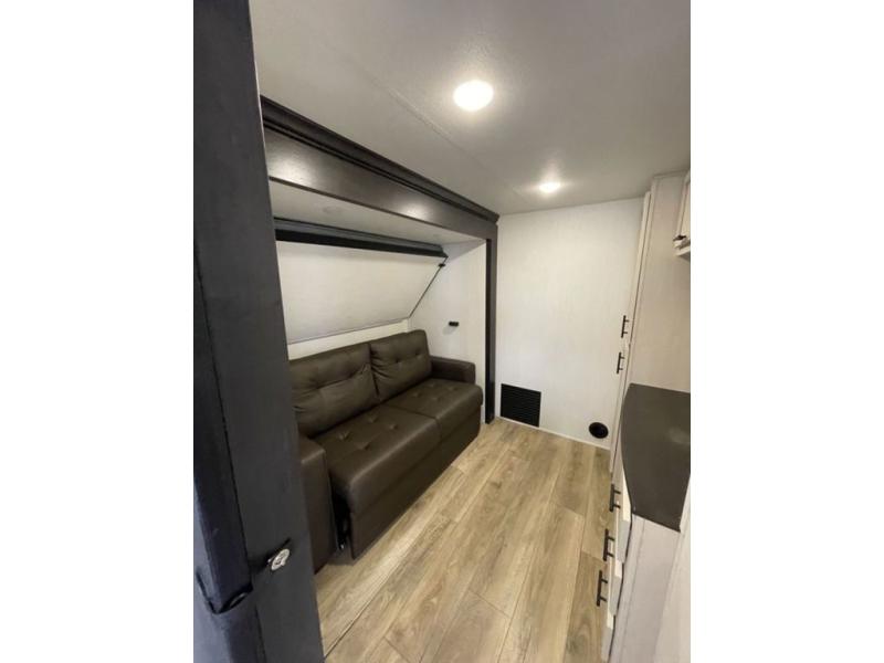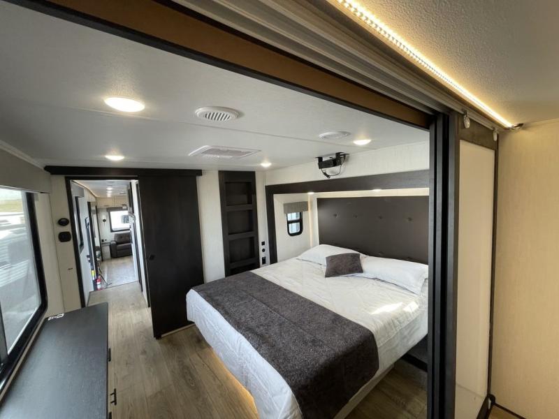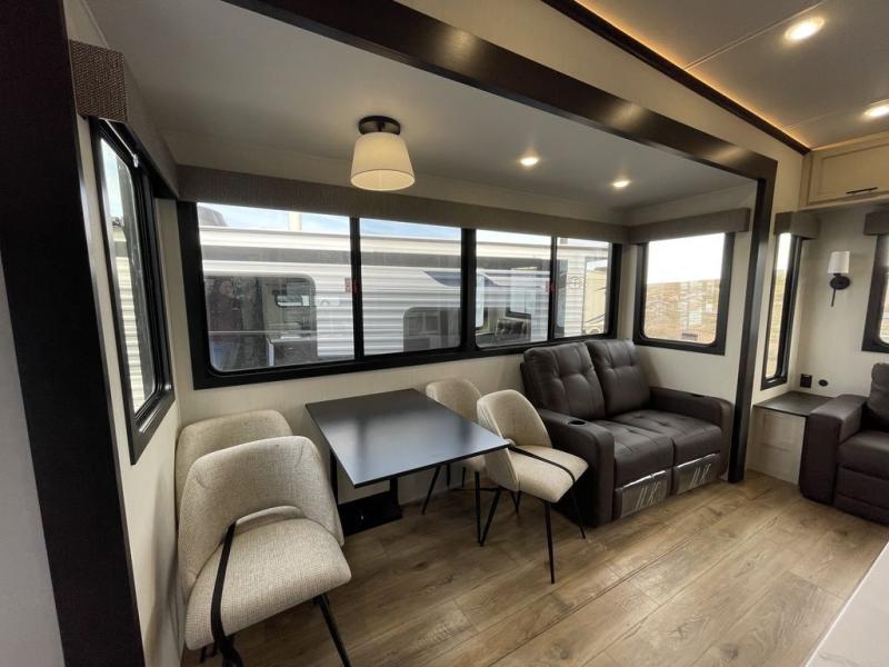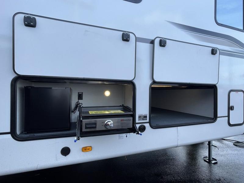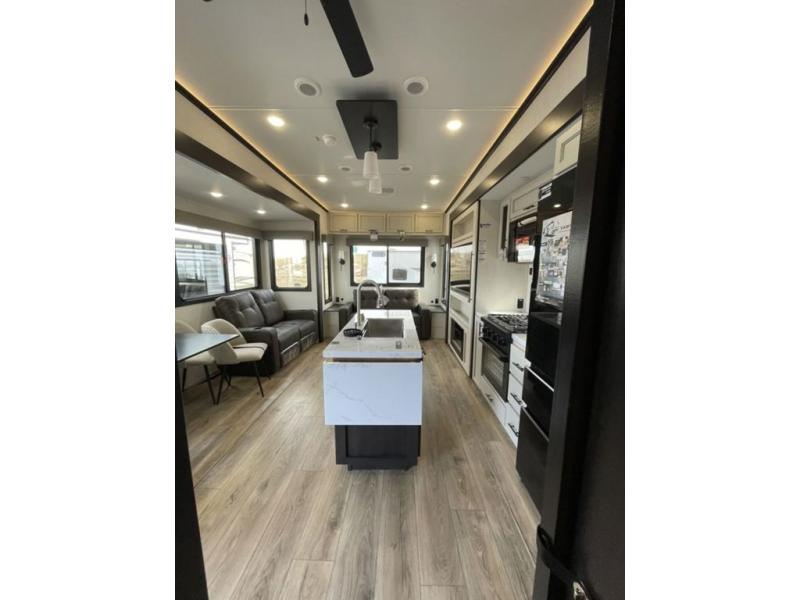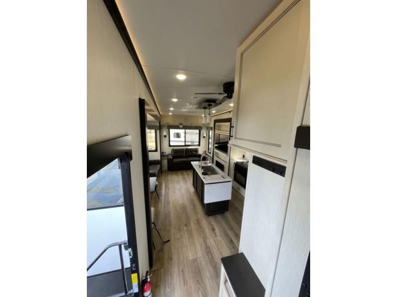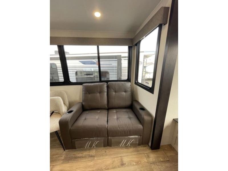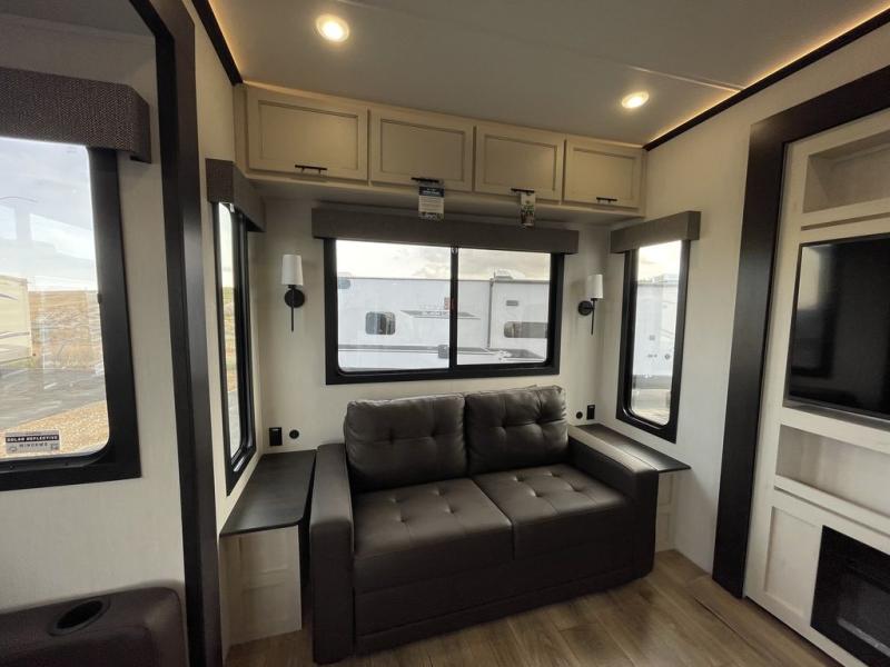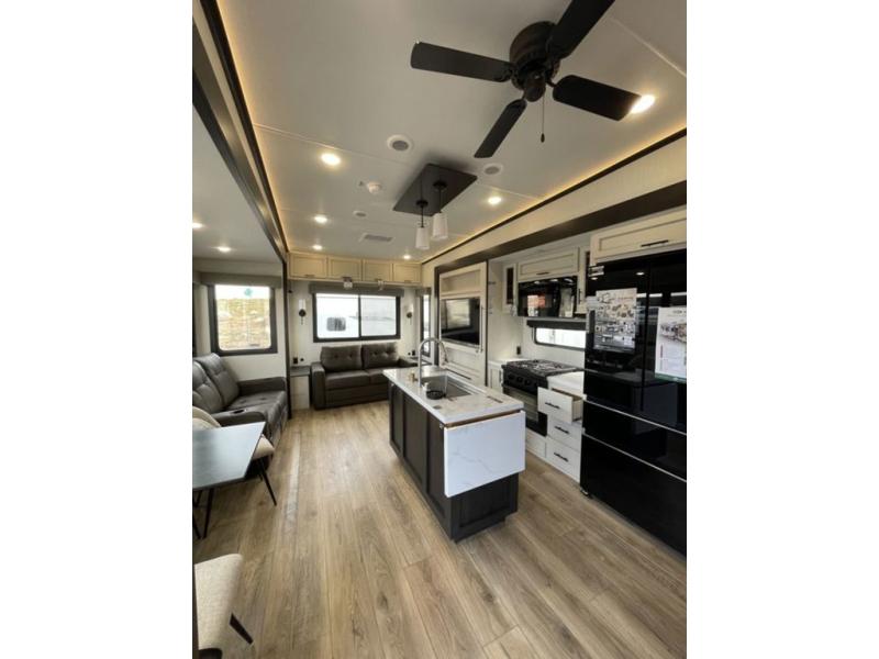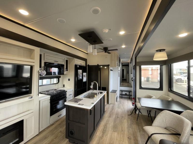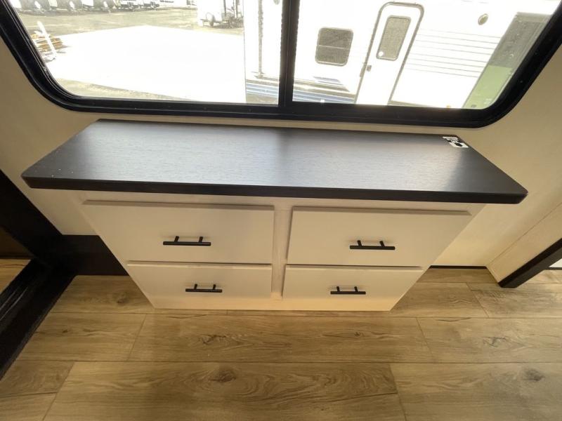 There is much to love in this fifth wheel! Starting with the second bedroom which has a slide that houses a flip-up bunk above a tri-fold sofa across from a desk with drawers, a drop zone, and a wardrobe, plus above all of that is a storage/bunk loft. The rear living area includes a tri-fold sofa, a TV with a hidden pantry behind, and theater seating for two making this space another area at night for guests. In the morning, you can prepare breakfast on the kitchen island, then dine together at the versatile dinette/desk. The full bath will allow you to stay clean throughout your trip, and you'll feel right at home in the front private bedroom with a camper king bed, a dresser, and front wardrobe. Outside, a kitchen and two power awnings create an inviting space!