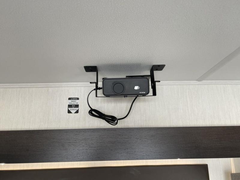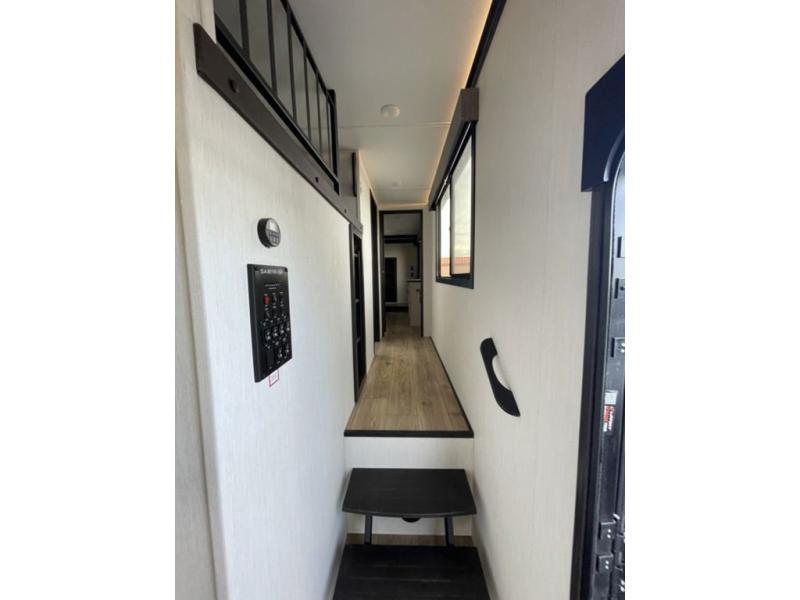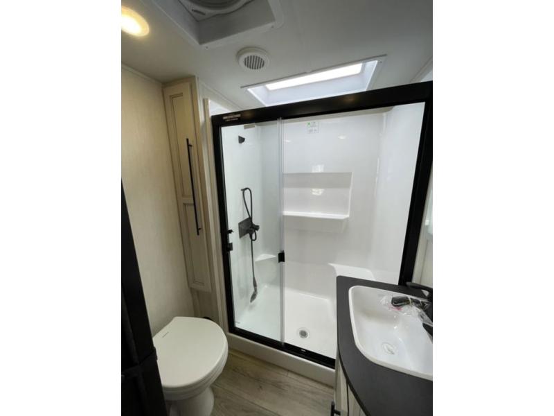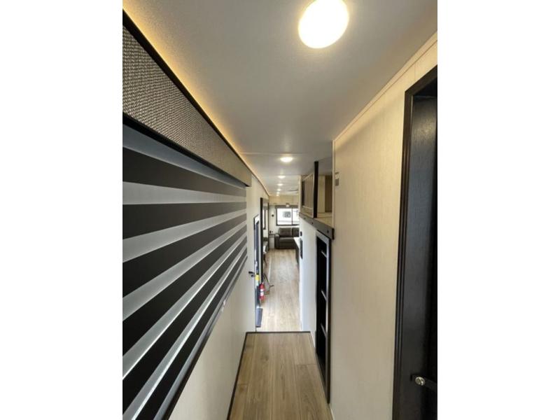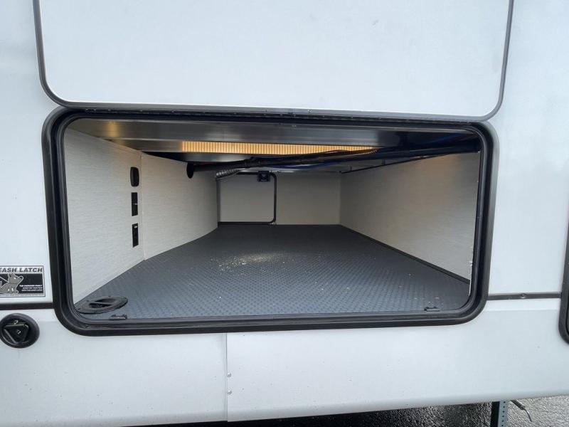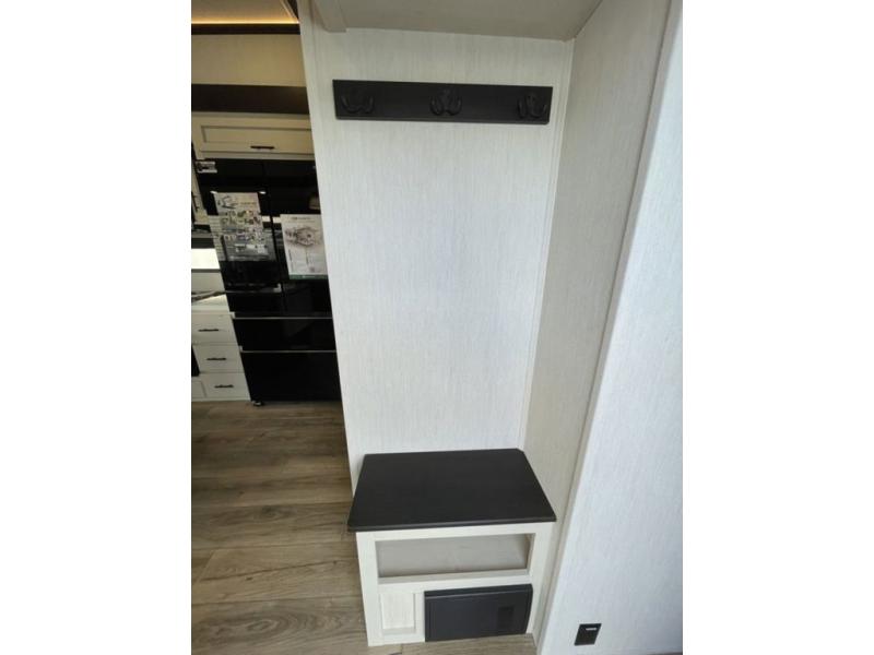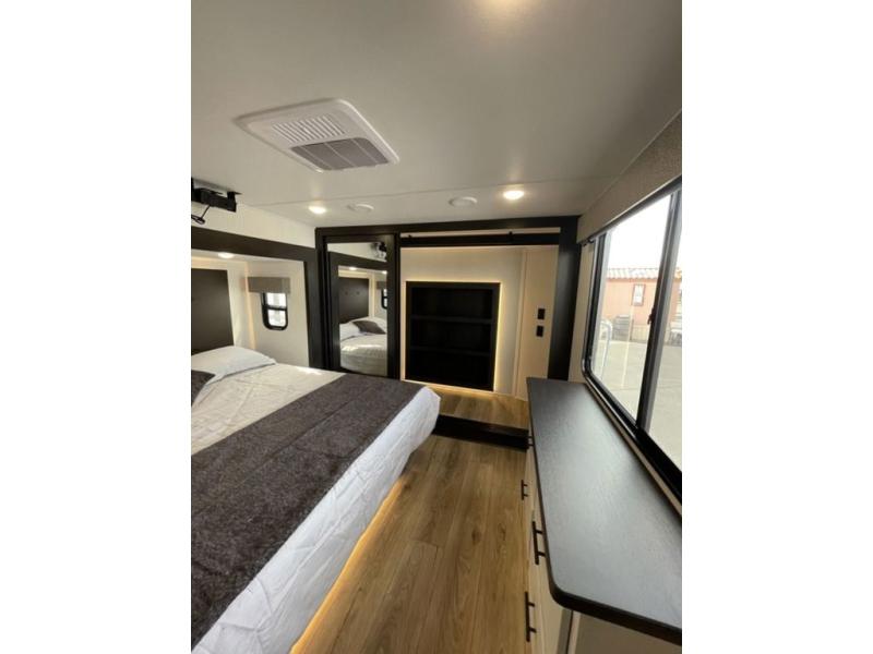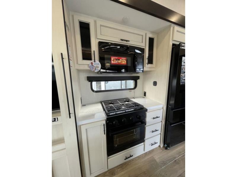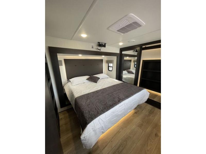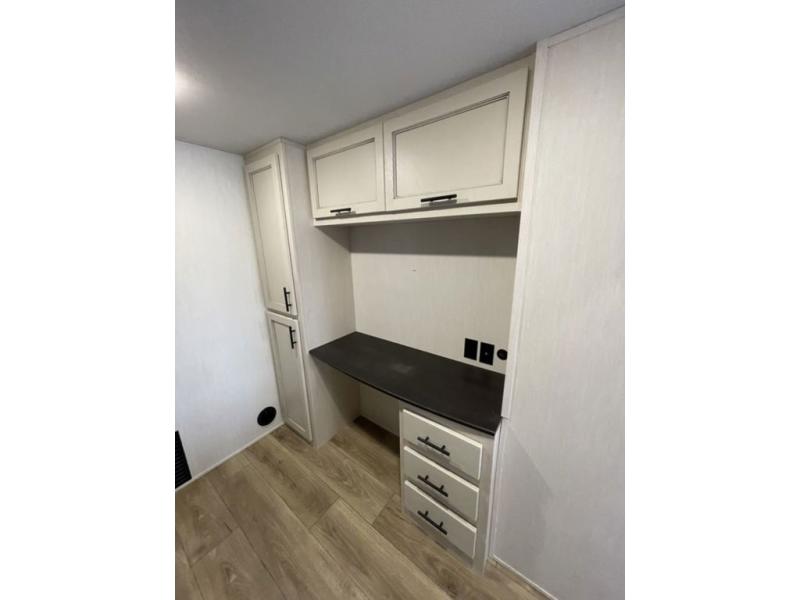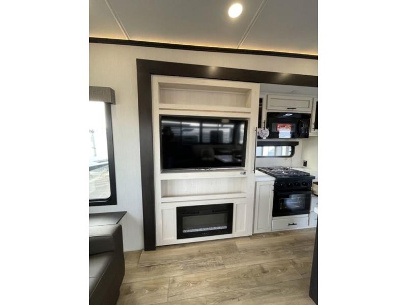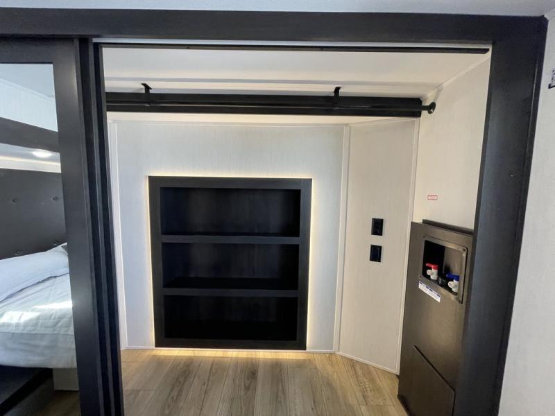 There is much to love in this fifth wheel! Starting with the second bedroom which has a slide that houses a flip-up bunk above a tri-fold sofa across from a desk with drawers, a drop zone, and a wardrobe, plus above all of that is a storage/bunk loft. The rear living area includes a tri-fold sofa, a TV with a hidden pantry behind, and theater seating for two making this space another area at night for guests. In the morning, you can prepare breakfast on the kitchen island, then dine together at the versatile dinette/desk. The full bath will allow you to stay clean throughout your trip, and you'll feel right at home in the front private bedroom with a camper king bed, a dresser, and front wardrobe. Outside, a kitchen and two power awnings create an inviting space!