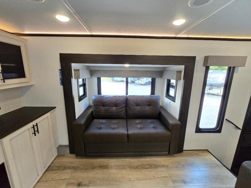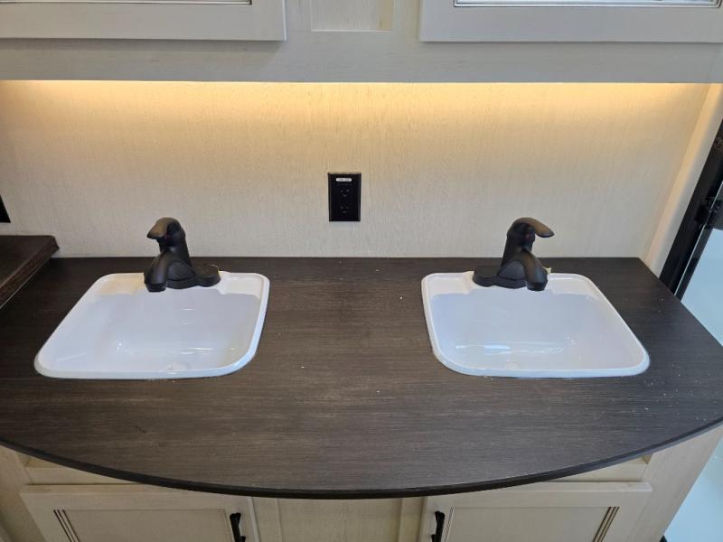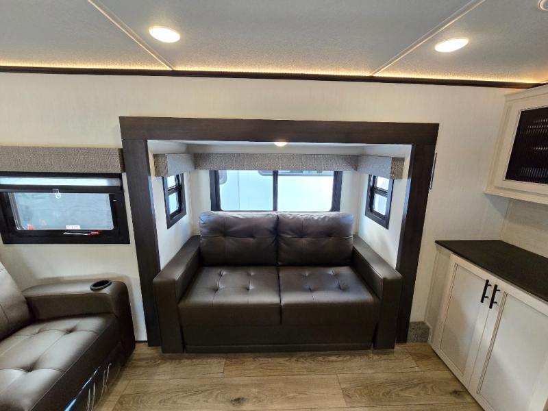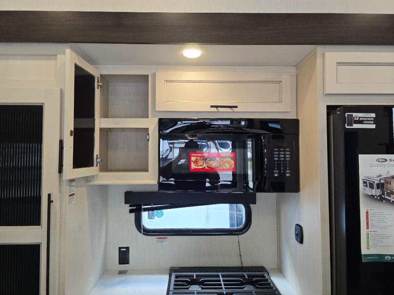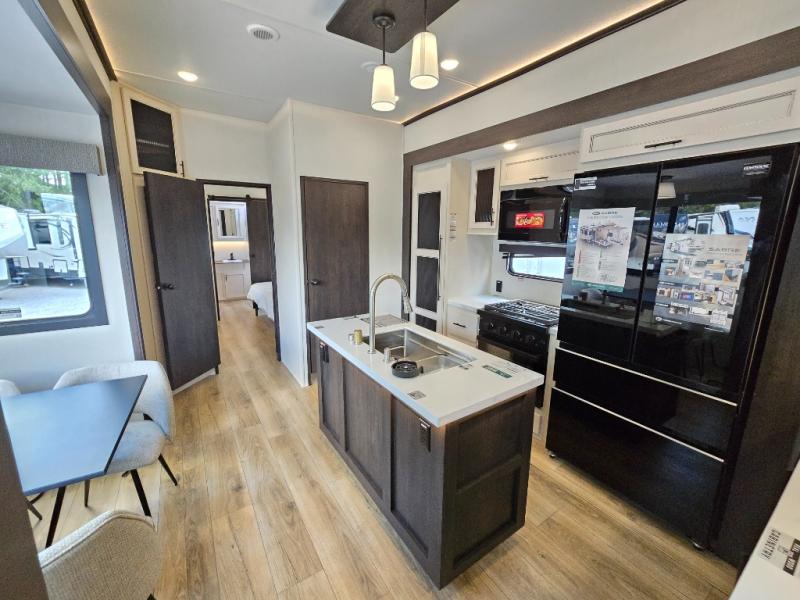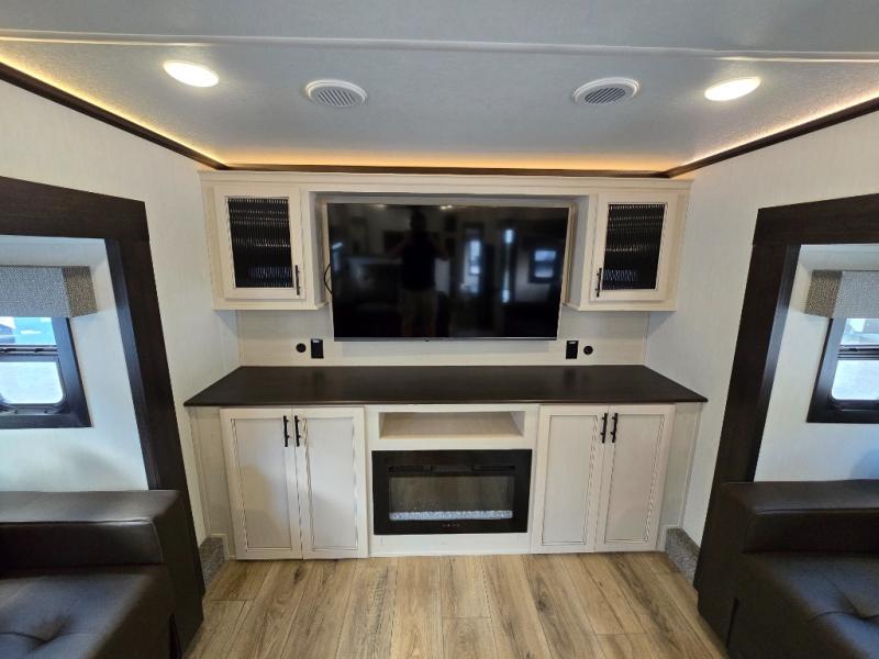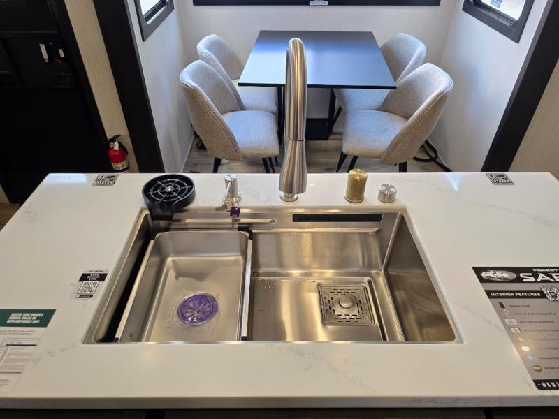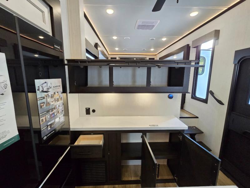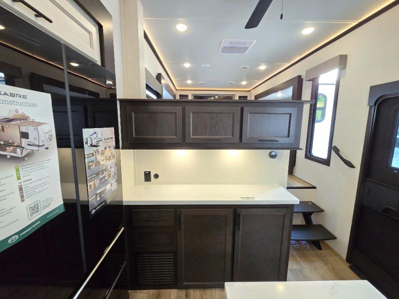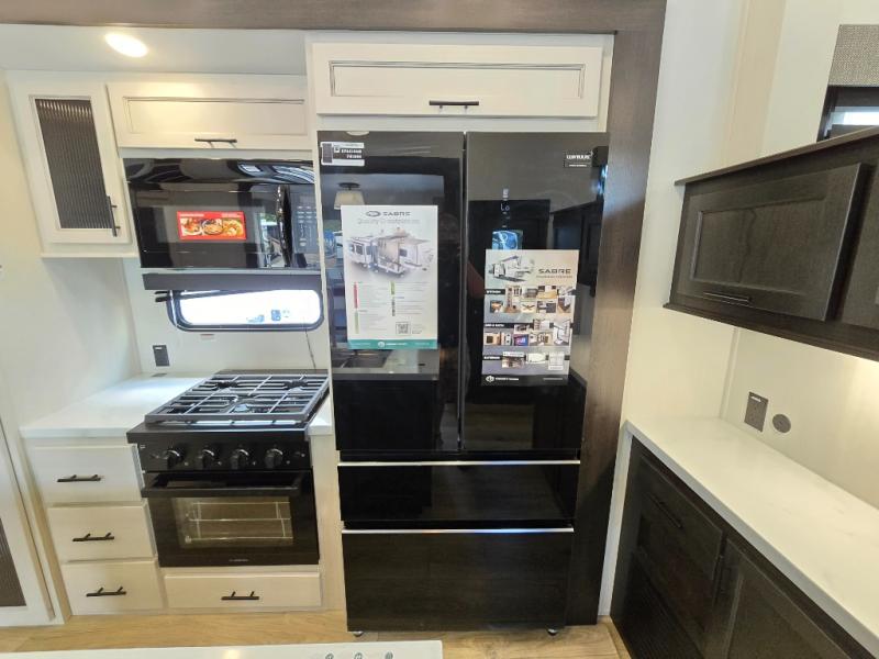 This Sabre fifth wheel with a full and half bath is sure to be a crowd pleaser! The front living area is the perfect place for everyone to visit each other comfortably on the two tri-fold sofas that can be transformed into extra sleeping spaces, or at the theater seating for complete relaxation. You will also find an entertainment center with a fireplace and a TV. This Sabre has a kitchen filled with convenient features, such as a residential size refrigerator, a kitchen island, and a kitchen pantry. The rear master suite has access to its very own full bathroom with a double-sink vanity for two to get ready at once, and a wardrobe with washer and dryer prep for convenience!