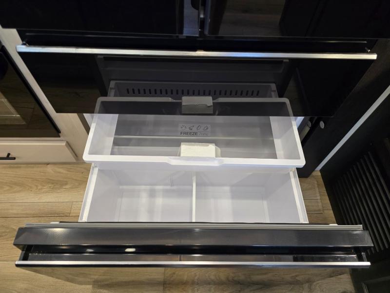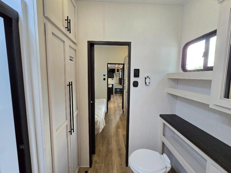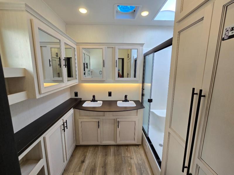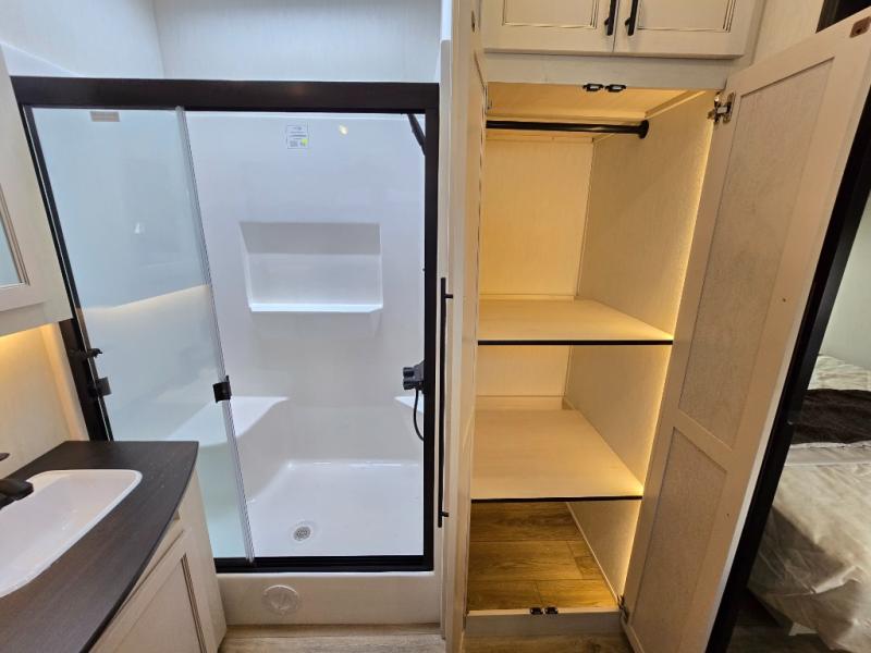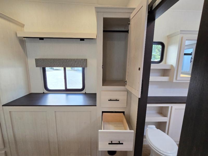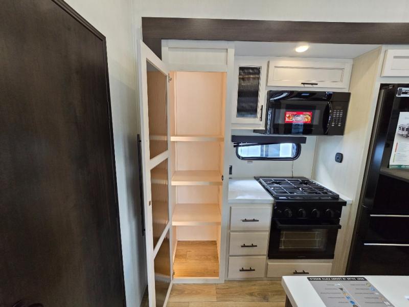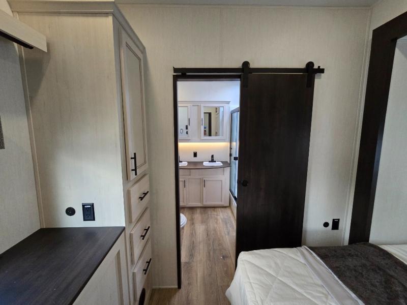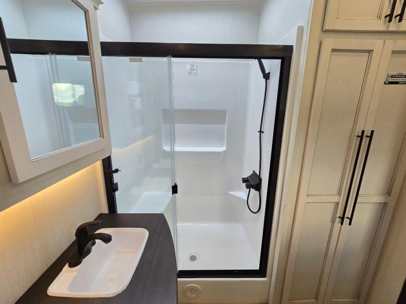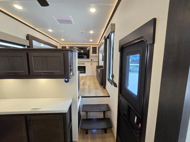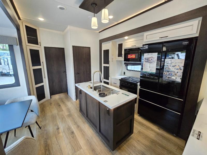 This Sabre fifth wheel with a full and half bath is sure to be a crowd pleaser! The front living area is the perfect place for everyone to visit each other comfortably on the two tri-fold sofas that can be transformed into extra sleeping spaces, or at the theater seating for complete relaxation. You will also find an entertainment center with a fireplace and a TV. This Sabre has a kitchen filled with convenient features, such as a residential size refrigerator, a kitchen island, and a kitchen pantry. The rear master suite has access to its very own full bathroom with a double-sink vanity for two to get ready at once, and a wardrobe with washer and dryer prep for convenience!