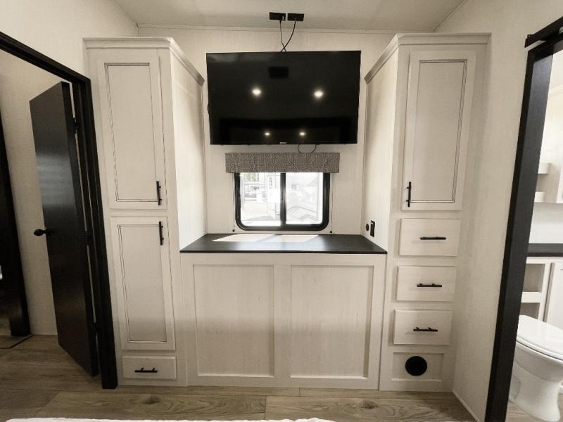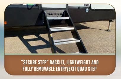 You will experience luxurious camping trips at an affordable price with any one of these Forest River Cherokee Sabre fifth wheels! These models are durable and ready to travel anytime of the year thanks to features like the high-gloss gel-coat front cap with LED lighting, the PVC roof membrane, and the forced air underbelly with enclosed gate valves. The electric auto-leveling system makes setting up easy and safe, and the adjustable power awning with LED lighting will create an inviting outdoor living space. Each model includes a universal docking station which includes a black tank flush and an outside shower, and adjustable stable steps for you to enter and exit the unit safely. Inside, you will love the design of the ambient accent lighting in the living area, the real wood lumbercore cabinetry, and the linoleum flooring!