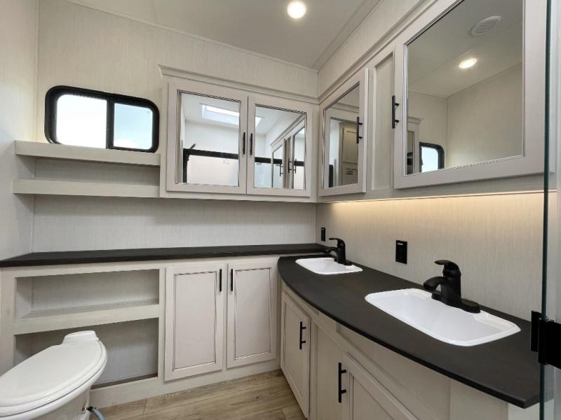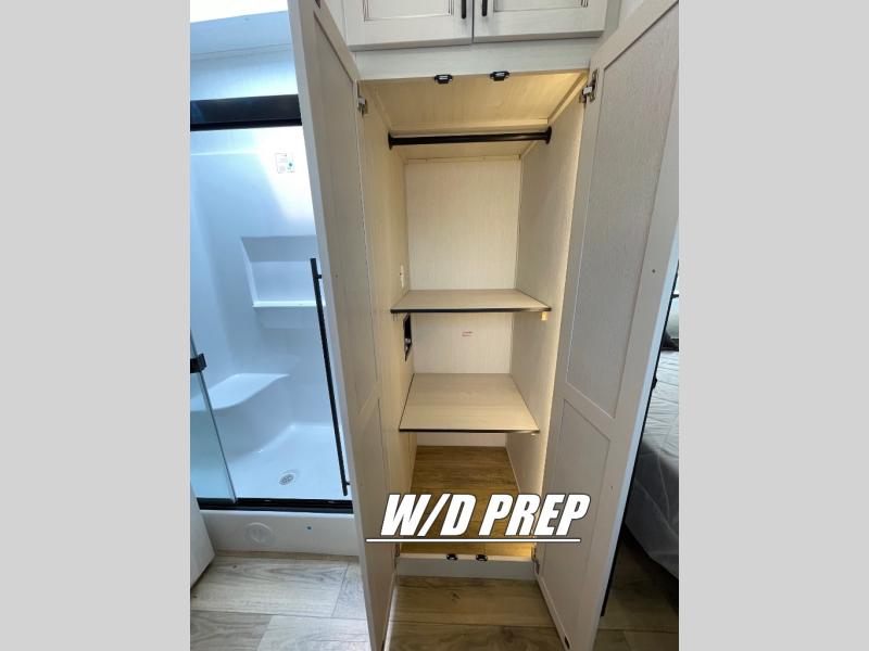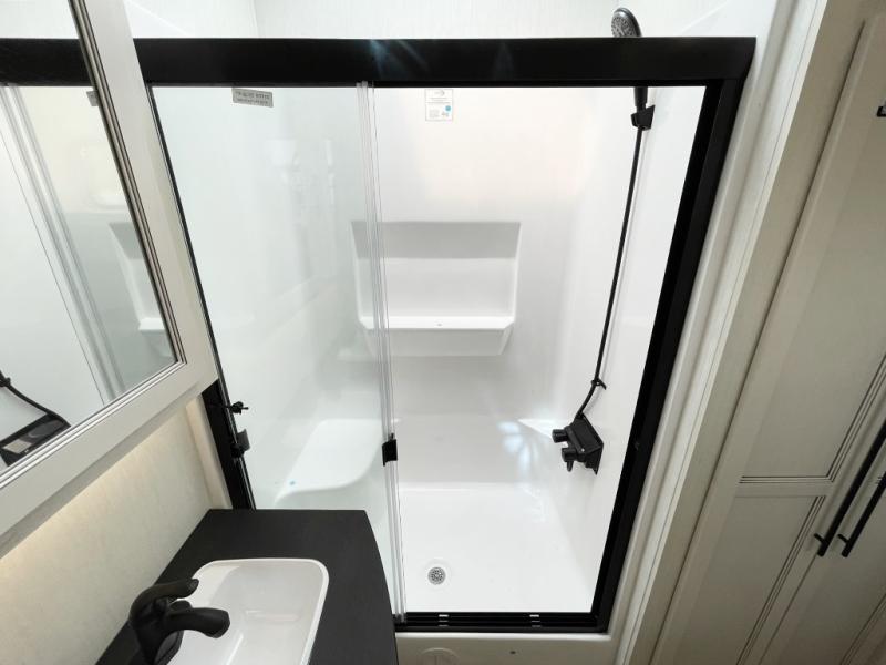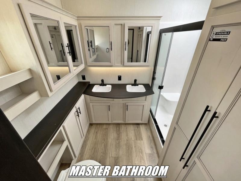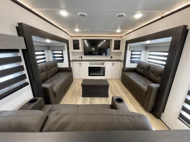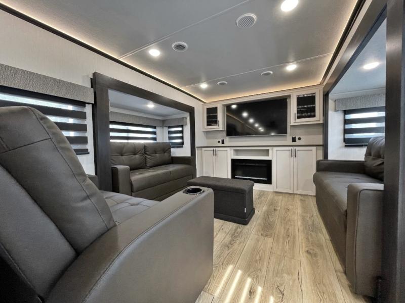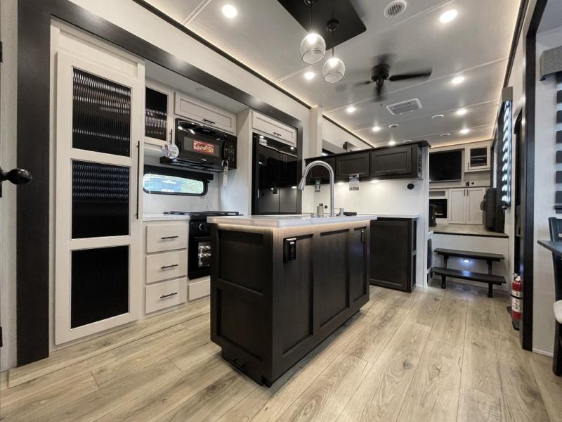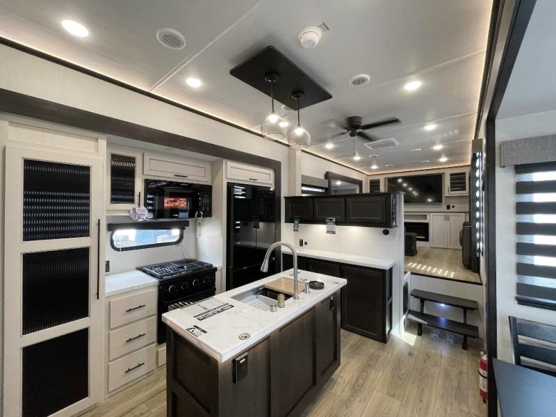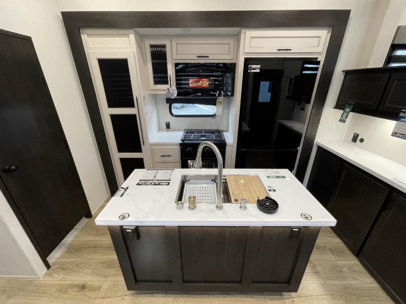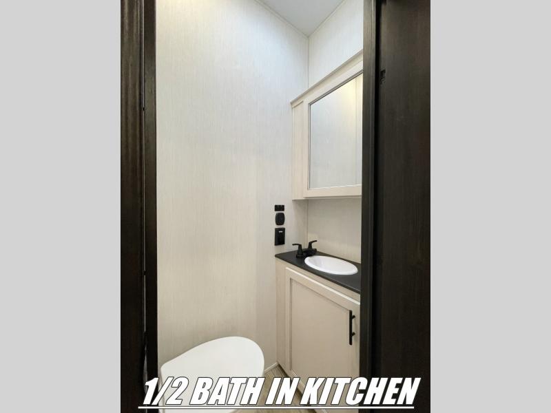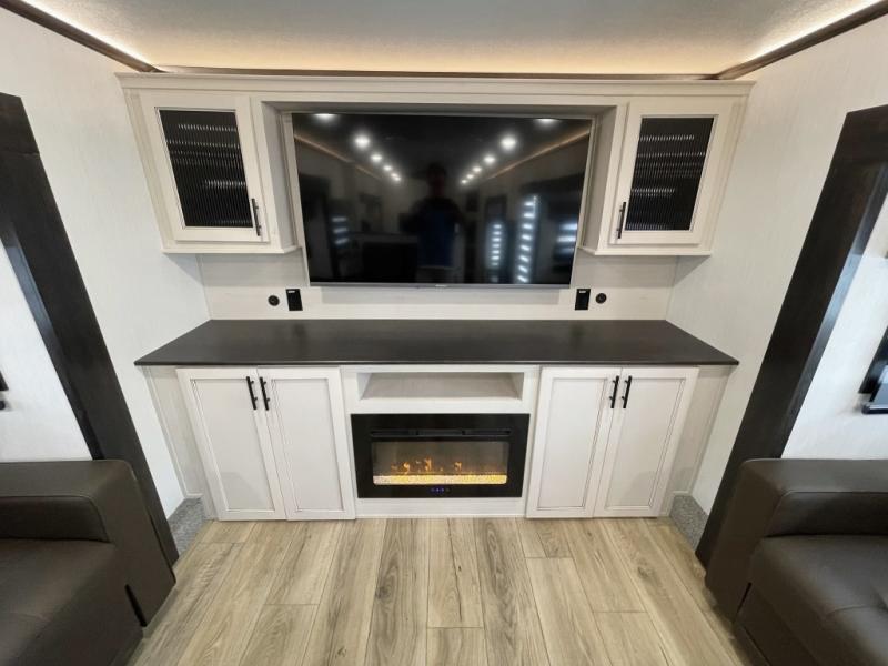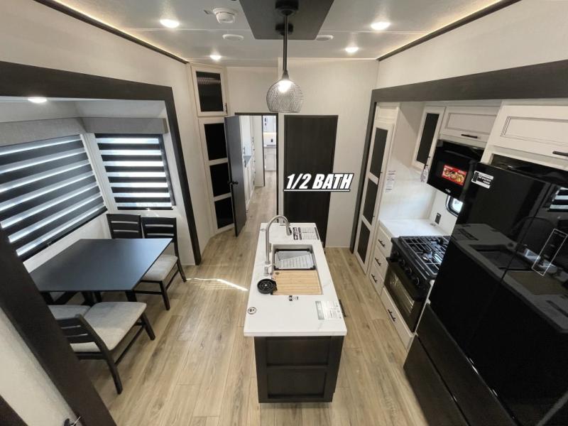 This Sabre fifth wheel with a full and half bath is sure to be a crowd pleaser! The front living area is the perfect place for everyone to visit each other comfortably on the two tri-fold sofas that can be transformed into extra sleeping spaces, or at the theater seating for complete relaxation. You will also find an entertainment center with a fireplace and a TV. This Sabre has a kitchen filled with convenient features, such as a residential size refrigerator, a kitchen island, and a kitchen pantry. The rear master suite has access to its very own full bathroom with a double-sink vanity for two to get ready at once, and a wardrobe with washer and dryer prep for convenience!