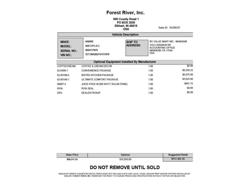 Forest River Cherokee Sabre fifth wheel 37FLH highlights: