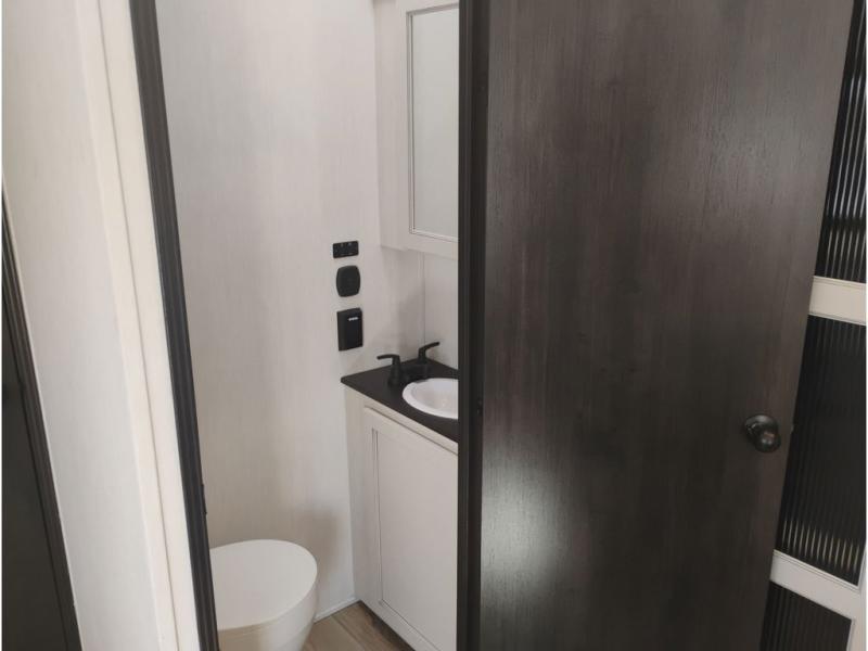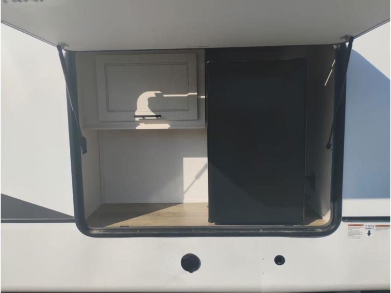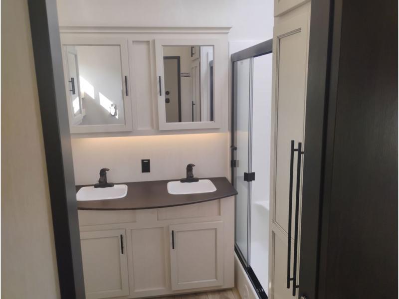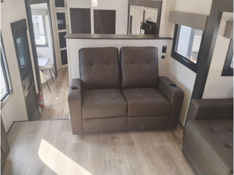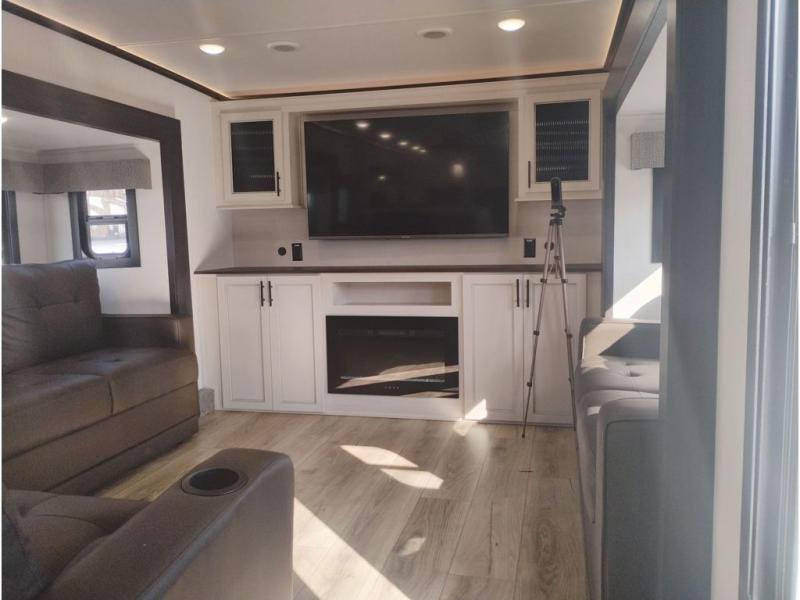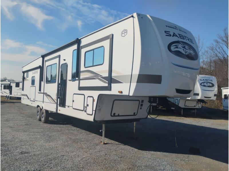 This Sabre fifth wheel with a full and half bath is sure to be a crowd pleaser! The front living area is the perfect place for everyone to visit each other comfortably on the two tri-fold sofas that can be transformed into extra sleeping spaces, or at the theater seating for complete relaxation. You will also find an entertainment center with a fireplace and a TV. This Sabre has a kitchen filled with convenient features, such as a residential size refrigerator, a kitchen island, and a kitchen pantry. The rear master suite has access to its very own full bathroom with a double-sink vanity for two to get ready at once, and a wardrobe with washer and dryer prep for convenience!