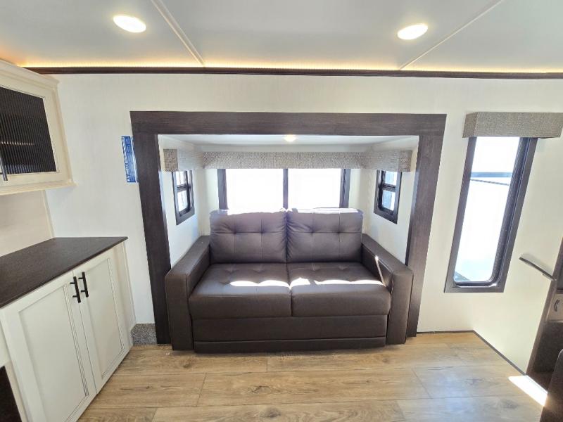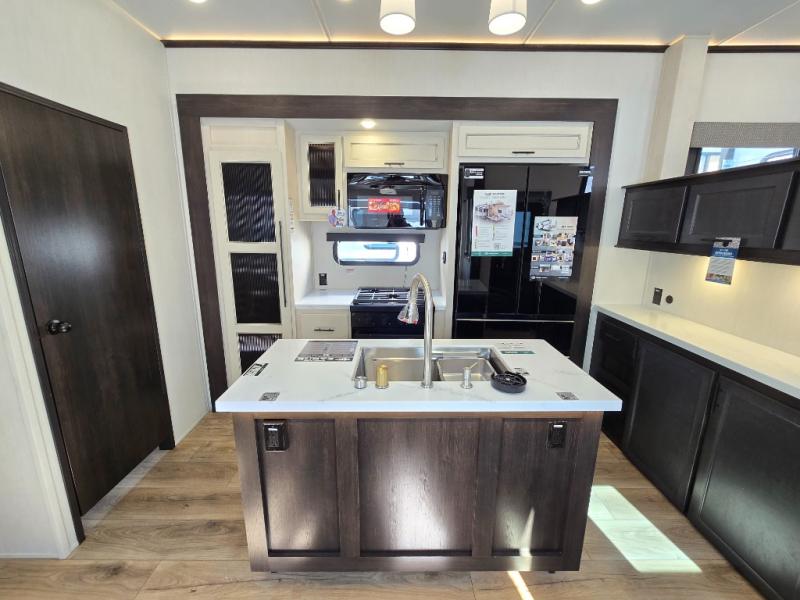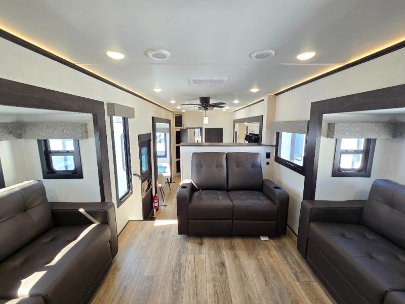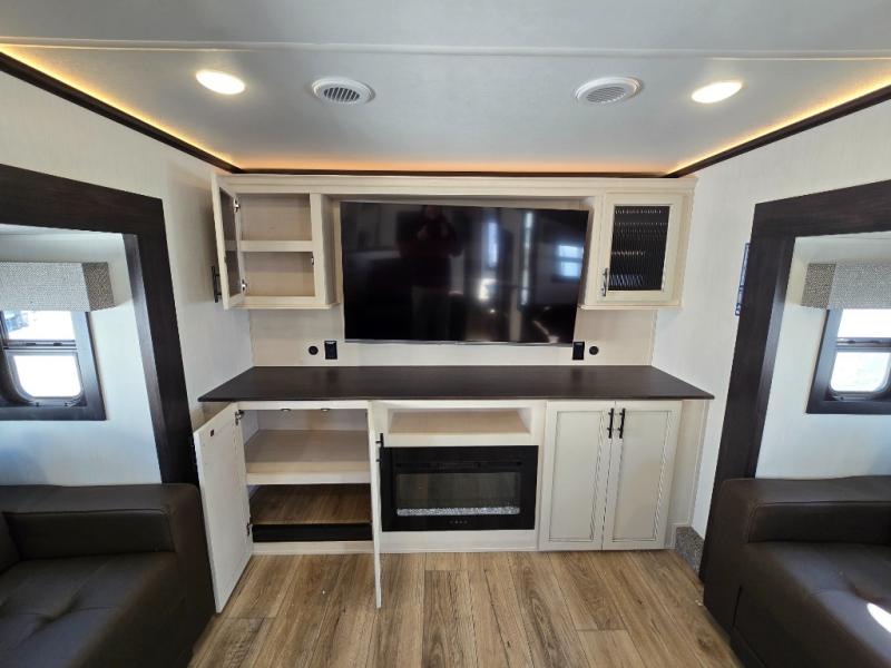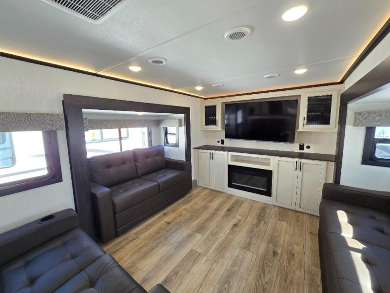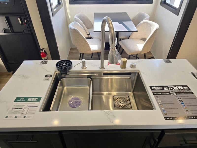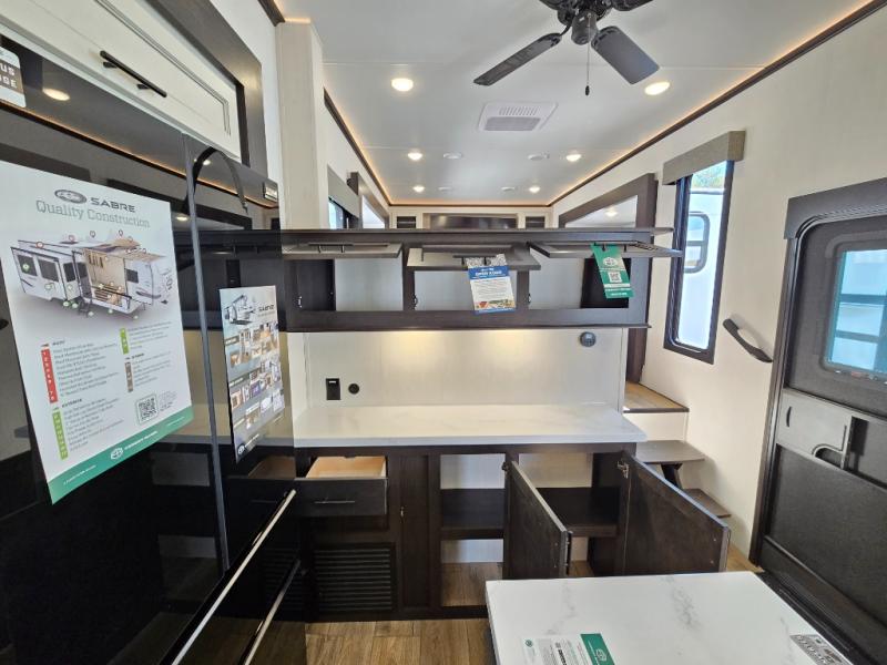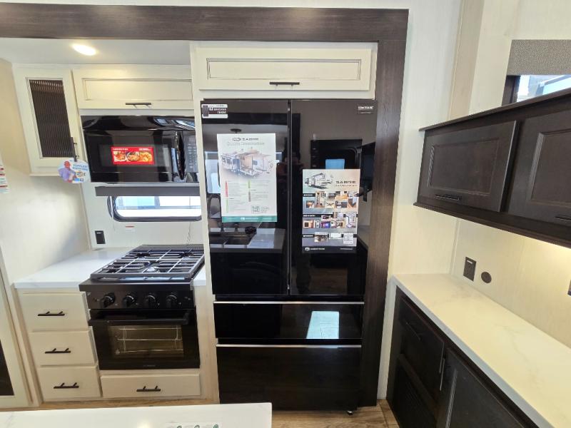 This Sabre fifth wheel with a full and half bath is sure to be a crowd pleaser! The front living area is the perfect place for everyone to visit each other comfortably on the two tri-fold sofas that can be transformed into extra sleeping spaces, or at the theater seating for complete relaxation. You will also find an entertainment center with a fireplace and a TV. This Sabre has a kitchen filled with convenient features, such as a residential size refrigerator, a kitchen island, and a kitchen pantry. The rear master suite has access to its very own full bathroom with a double-sink vanity for two to get ready at once, and a wardrobe with washer and dryer prep for convenience!