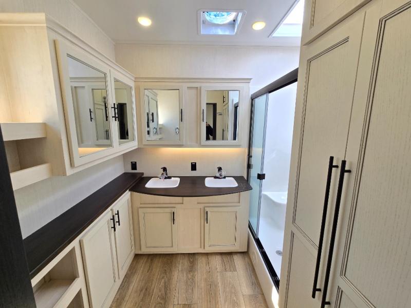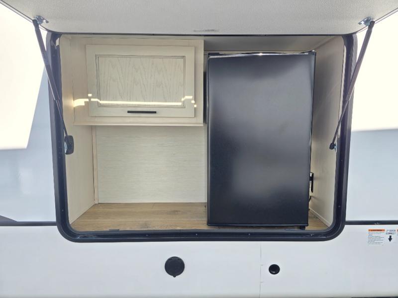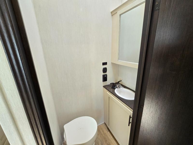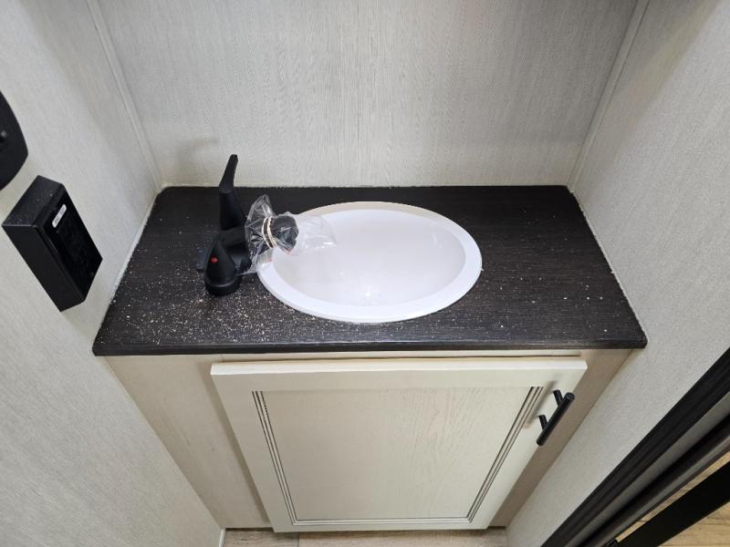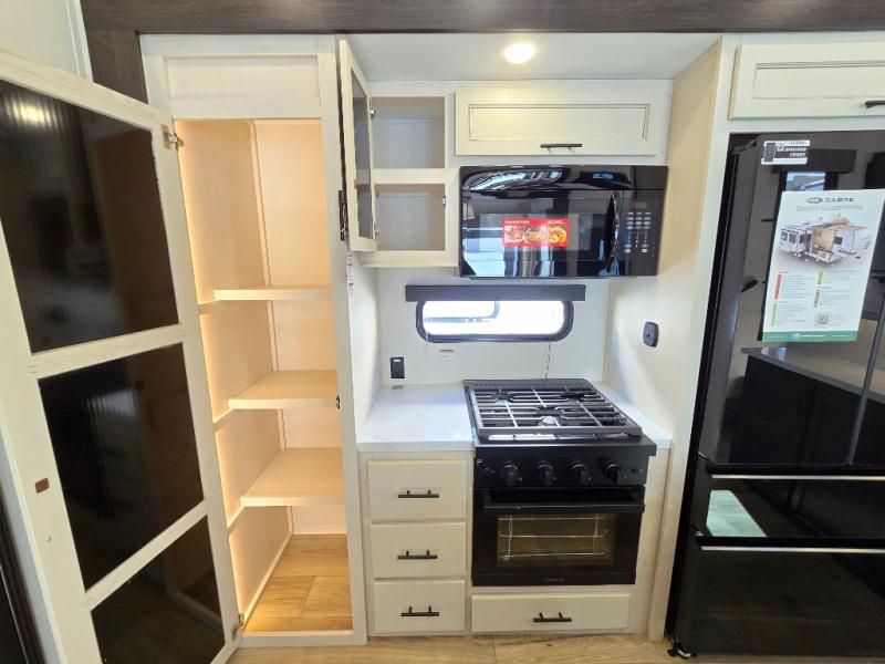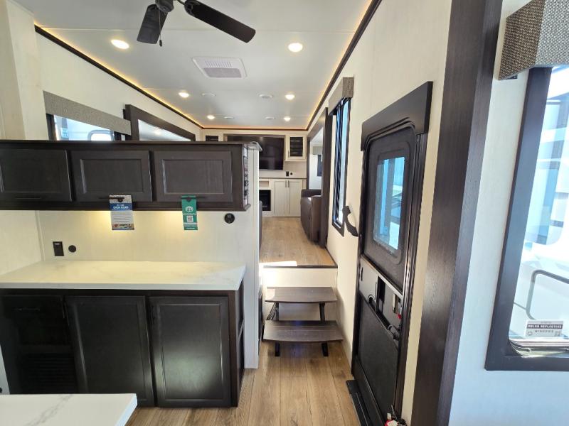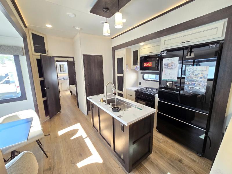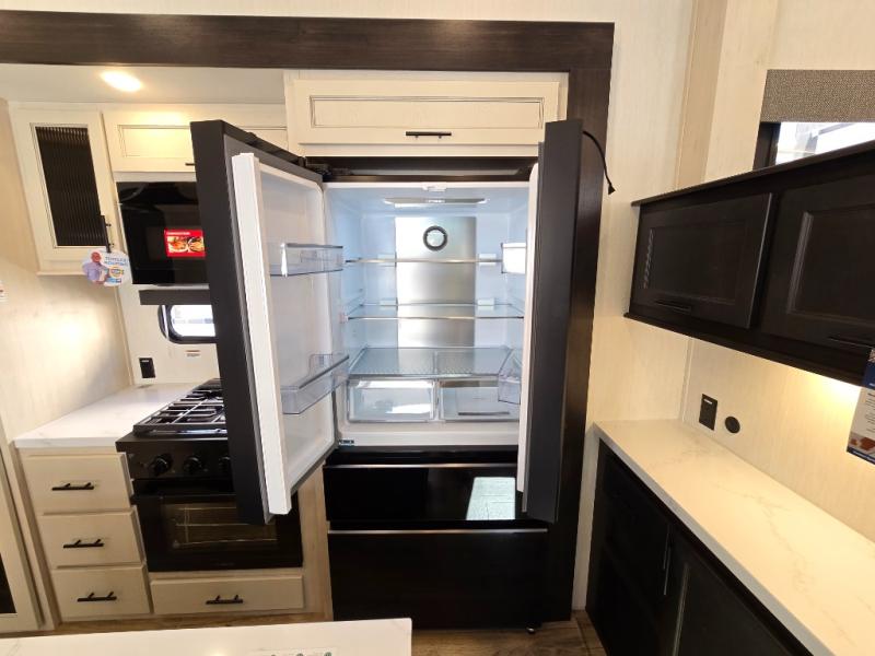 This Sabre fifth wheel with a full and half bath is sure to be a crowd pleaser! The front living area is the perfect place for everyone to visit each other comfortably on the two tri-fold sofas that can be transformed into extra sleeping spaces, or at the theater seating for complete relaxation. You will also find an entertainment center with a fireplace and a TV. This Sabre has a kitchen filled with convenient features, such as a residential size refrigerator, a kitchen island, and a kitchen pantry. The rear master suite has access to its very own full bathroom with a double-sink vanity for two to get ready at once, and a wardrobe with washer and dryer prep for convenience!