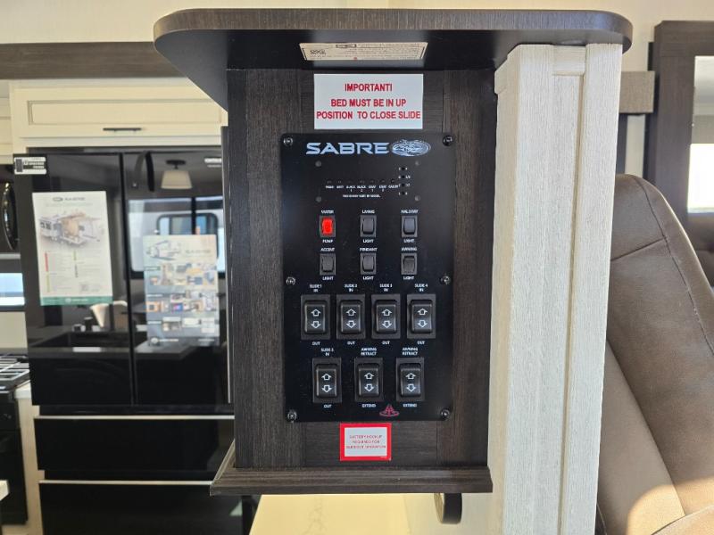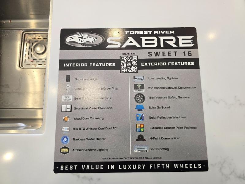 You will experience luxurious camping trips at an affordable price with any one of these Forest River Cherokee Sabre fifth wheels! These models are durable and ready to travel anytime of the year thanks to features like the high-gloss gel-coat front cap with LED lighting, the PVC roof membrane, and the forced air underbelly with enclosed gate valves. The electric auto-leveling system makes setting up easy and safe, and the adjustable power awning with LED lighting will create an inviting outdoor living space. Each model includes a universal docking station which includes a black tank flush and an outside shower, and adjustable stable steps for you to enter and exit the unit safely. Inside, you will love the design of the ambient accent lighting in the living area, the real wood lumbercore cabinetry, and the linoleum flooring!