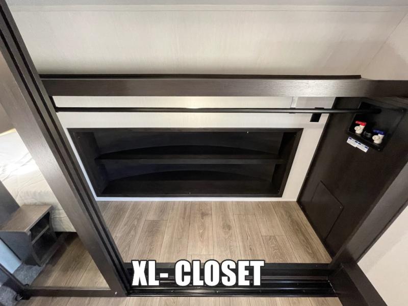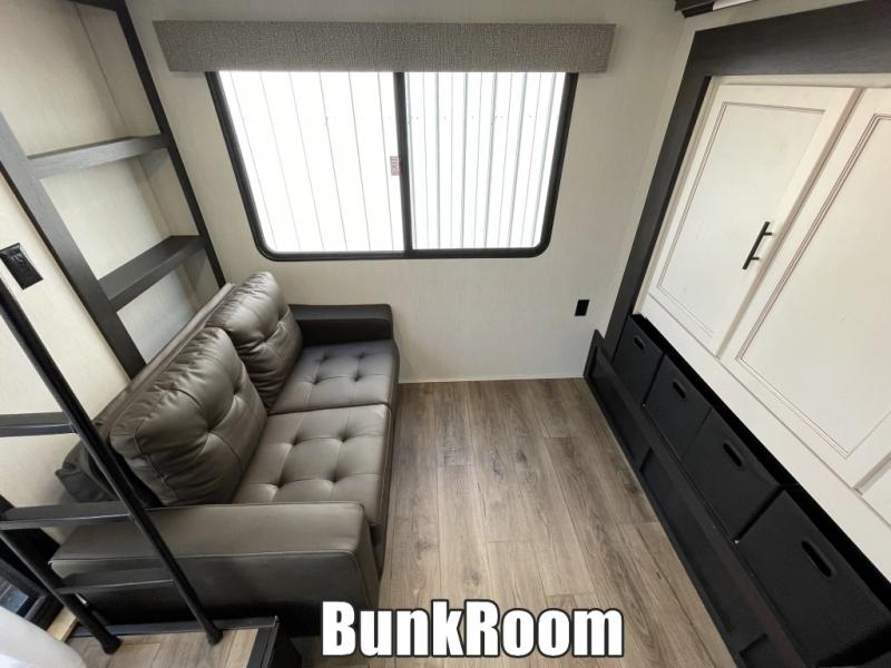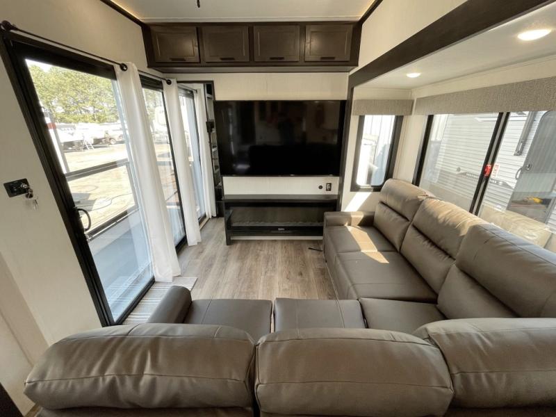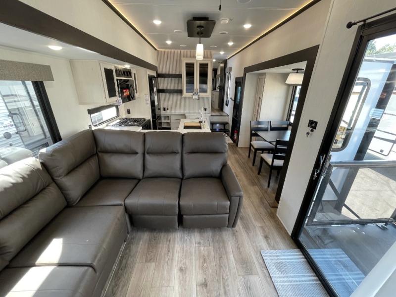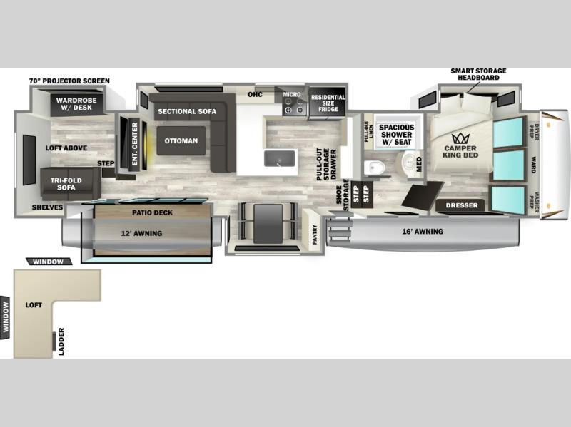This is the perfect fifth wheel if you enjoy camping with friends and family! You'll have the front private bedroom with a camper king bed slide all to yourselves, while your guests take the rear den. There is a tri-fold sofa here, along with a wardrobe with a desk, additional shelves plus a loft above this room for even more sleeping or storage space! The main living room features an L-shaped sectional sofa, a fireplace and an entertainment center. And the patio deck with a 12' awning is right off of this room so you can visit with friends indoors or outdoors! There is generous counter space in the full kitchen, along with a pull-out storage drawer and a versatile dinette/desk. There are many more stand-out features found in this fifth wheel, including washer and dryer prep in the front bedroom, a 70" projector screen in the rear den, a second power awning, and the list goes on!