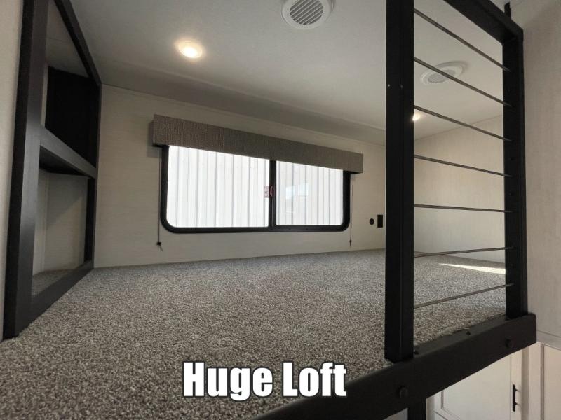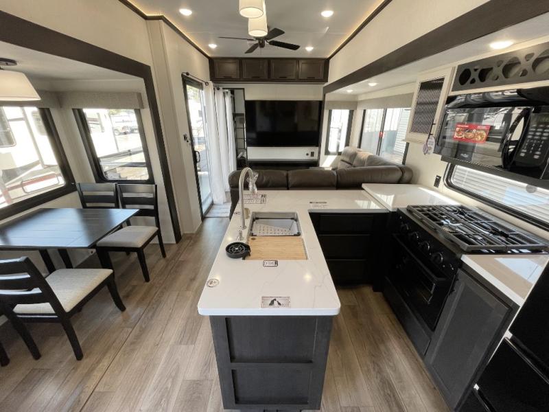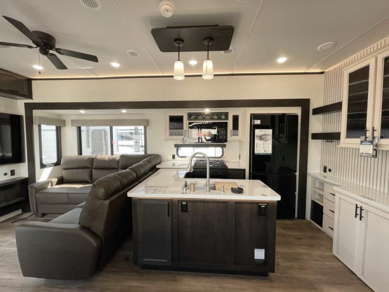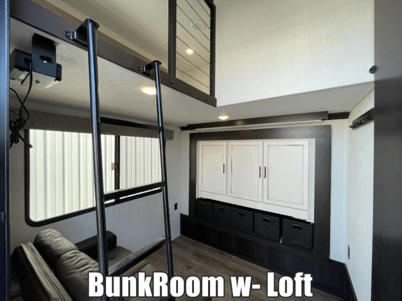 This is the perfect fifth wheel if you enjoy camping with friends and family! You'll have the front private bedroom with a camper king bed slide all to yourselves, while your guests take the rear den. There is a tri-fold sofa here, along with a wardrobe with a desk, additional shelves plus a loft above this room for even more sleeping or storage space! The main living room features an L-shaped sectional sofa, a fireplace and an entertainment center. And the patio deck with a 12' awning is right off of this room so you can visit with friends indoors or outdoors! There is generous counter space in the full kitchen, along with a pull-out storage drawer and a versatile dinette/desk. There are many more stand-out features found in this fifth wheel, including washer and dryer prep in the front bedroom, a 70" projector screen in the rear den, a second power awning, and the list goes on!