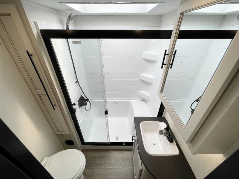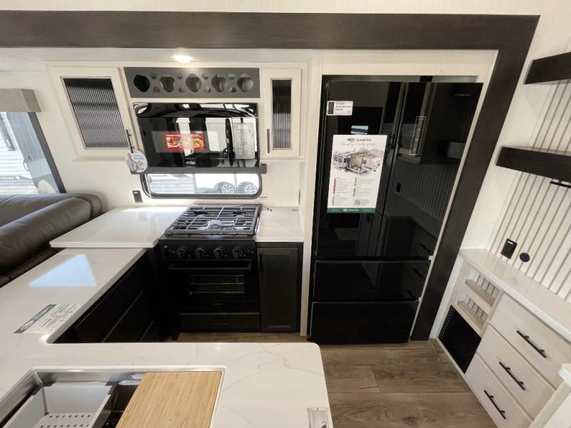 You will experience luxurious camping trips at an affordable price with any one of these Forest River Cherokee Sabre fifth wheels! These models are durable and ready to travel anytime of the year thanks to features like the high-gloss gel-coat front cap with LED lighting, the PVC roof membrane, and the forced air underbelly with enclosed gate valves. The electric auto-leveling system makes setting up easy and safe, and the adjustable power awning with LED lighting will create an inviting outdoor living space. Each model includes a universal docking station which includes a black tank flush and an outside shower, and adjustable stable steps for you to enter and exit the unit safely. Inside, you will love the design of the ambient accent lighting in the living area, the real wood lumbercore cabinetry, and the linoleum flooring!