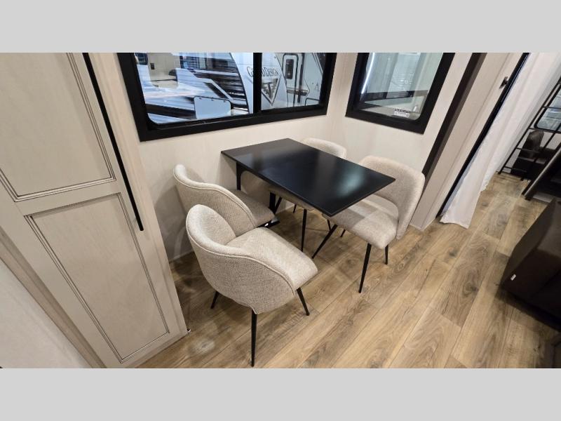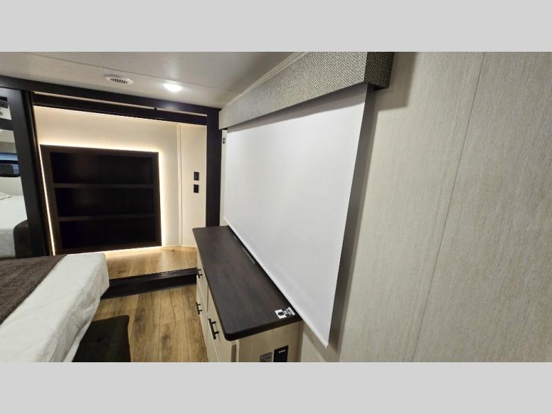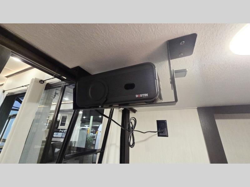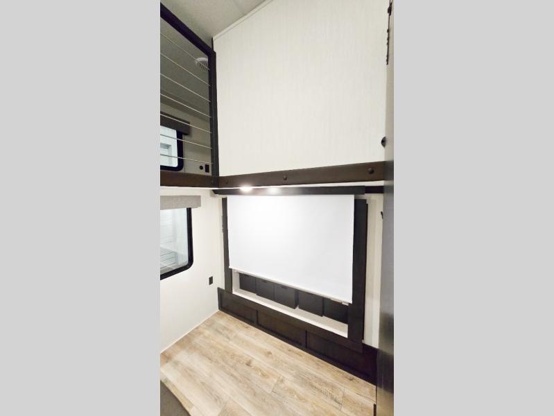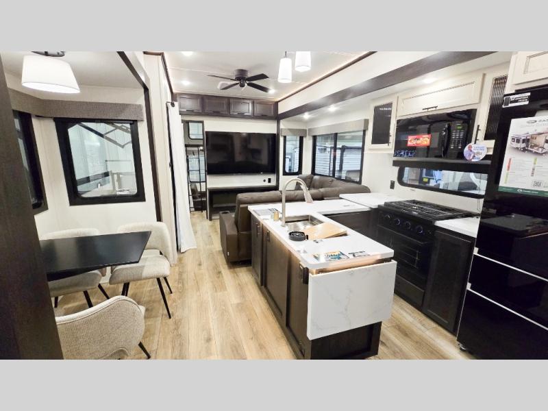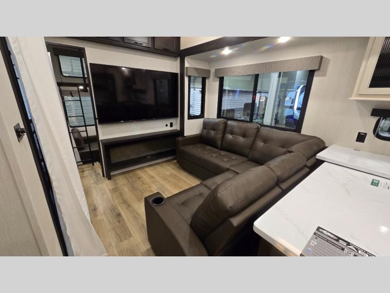 This is the perfect fifth wheel if you enjoy camping with friends and family! You'll have the front private bedroom with a camper king bed slide all to yourselves, while your guests take the rear den. There is a tri-fold sofa here, along with a wardrobe with a desk, additional shelves plus a loft above this room for even more sleeping or storage space! The main living room features an L-shaped sectional sofa, a fireplace and an entertainment center. And the patio deck with a 12' awning is right off of this room so you can visit with friends indoors or outdoors! There is generous counter space in the full kitchen, along with a pull-out storage drawer and a versatile dinette/desk. There are many more stand-out features found in this fifth wheel, including washer and dryer prep in the front bedroom, a 70" projector screen in the rear den, a second power awning, and the list goes on!